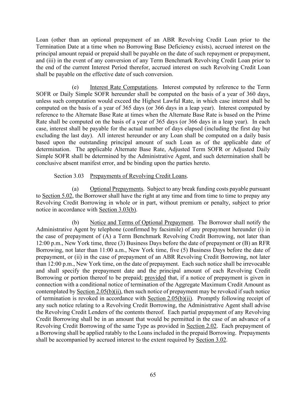 65 Loan (other than an optional prepayment of an ABR Revolving Credit Loan prior to the Termination Date at a time when no Borrowing Base Deficiency exists), accrued interest on the principal amount repaid or prepaid shall be payable on the date of such repayment or prepayment, and (iii) in the event of any conversion of any Term Benchmark Revolving Credit Loan prior to the end of the current Interest Period therefor, accrued interest on such Revolving Credit Loan shall be payable on the effective date of such conversion. (e) Interest Rate Computations. Interest computed by reference to the Term SOFR or Daily Simple SOFR hereunder shall be computed on the basis of a year of 360 days, unless such computation would exceed the Highest Lawful Rate, in which case interest shall be computed on the basis of a year of 365 days (or 366 days in a leap year). Interest computed by reference to the Alternate Base Rate at times when the Alternate Base Rate is based on the Prime Rate shall be computed on the basis of a year of 365 days (or 366 days in a leap year). In each case, interest shall be payable for the actual number of days elapsed (including the first day but excluding the last day). All interest hereunder or any Loan shall be computed on a daily basis based upon the outstanding principal amount of such Loan as of the applicable date of determination. The applicable Alternate Base Rate, Adjusted Term SOFR or Adjusted Daily Simple SOFR shall be determined by the Administrative Agent, and such determination shall be conclusive absent manifest error, and be binding upon the parties hereto. Section 3.03 Prepayments of Revolving Credit Loans. (a) Optional Prepayments. Subject to any break funding costs payable pursuant to Section 5.02, the Borrower shall have the right at any time and from time to time to prepay any Revolving Credit Borrowing in whole or in part, without premium or penalty, subject to prior notice in accordance with Section 3.03(b). (b) Notice and Terms of Optional Prepayment. The Borrower shall notify the Administrative Agent by telephone (confirmed by facsimile) of any prepayment hereunder (i) in the case of prepayment of (A) a Term Benchmark Revolving Credit Borrowing, not later than 12:00 p.m., New York time, three (3) Business Days before the date of prepayment or (B) an RFR Borrowing, not later than 11:00 a.m., New York time, five (5) Business Days before the date of prepayment, or (ii) in the case of prepayment of an ABR Revolving Credit Borrowing, not later than 12:00 p.m., New York time, on the date of prepayment. Each such notice shall be irrevocable and shall specify the prepayment date and the principal amount of each Revolving Credit Borrowing or portion thereof to be prepaid; provided that, if a notice of prepayment is given in connection with a conditional notice of termination of the Aggregate Maximum Credit Amount as contemplated by Section 2.05(b)(ii), then such notice of prepayment may be revoked if such notice of termination is revoked in accordance with Section 2.05(b)(ii). Promptly following receipt of any such notice relating to a Revolving Credit Borrowing, the Administrative Agent shall advise the Revolving Credit Lenders of the contents thereof. Each partial prepayment of any Revolving Credit Borrowing shall be in an amount that would be permitted in the case of an advance of a Revolving Credit Borrowing of the same Type as provided in Section 2.02. Each prepayment of a Borrowing shall be applied ratably to the Loans included in the prepaid Borrowing. Prepayments shall be accompanied by accrued interest to the extent required by Section 3.02.