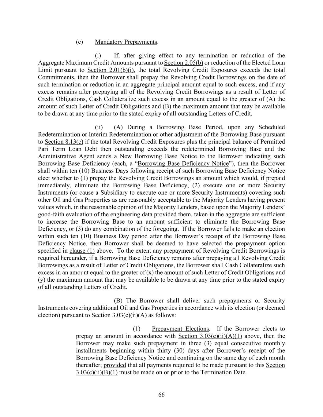 66 (c) Mandatory Prepayments. (i) If, after giving effect to any termination or reduction of the Aggregate Maximum Credit Amounts pursuant to Section 2.05(b) or reduction of the Elected Loan Limit pursuant to Section 2.01(b)(i), the total Revolving Credit Exposures exceeds the total Commitments, then the Borrower shall prepay the Revolving Credit Borrowings on the date of such termination or reduction in an aggregate principal amount equal to such excess, and if any excess remains after prepaying all of the Revolving Credit Borrowings as a result of Letter of Credit Obligations, Cash Collateralize such excess in an amount equal to the greater of (A) the amount of such Letter of Credit Obligations and (B) the maximum amount that may be available to be drawn at any time prior to the stated expiry of all outstanding Letters of Credit. (ii) (A) During a Borrowing Base Period, upon any Scheduled Redetermination or Interim Redetermination or other adjustment of the Borrowing Base pursuant to Section 8.13(c) if the total Revolving Credit Exposures plus the principal balance of Permitted Pari Term Loan Debt then outstanding exceeds the redetermined Borrowing Base and the Administrative Agent sends a New Borrowing Base Notice to the Borrower indicating such Borrowing Base Deficiency (each, a “Borrowing Base Deficiency Notice”), then the Borrower shall within ten (10) Business Days following receipt of such Borrowing Base Deficiency Notice elect whether to (1) prepay the Revolving Credit Borrowings an amount which would, if prepaid immediately, eliminate the Borrowing Base Deficiency, (2) execute one or more Security Instruments (or cause a Subsidiary to execute one or more Security Instruments) covering such other Oil and Gas Properties as are reasonably acceptable to the Majority Lenders having present values which, in the reasonable opinion of the Majority Lenders, based upon the Majority Lenders’ good-faith evaluation of the engineering data provided them, taken in the aggregate are sufficient to increase the Borrowing Base to an amount sufficient to eliminate the Borrowing Base Deficiency, or (3) do any combination of the foregoing. If the Borrower fails to make an election within such ten (10) Business Day period after the Borrower’s receipt of the Borrowing Base Deficiency Notice, then Borrower shall be deemed to have selected the prepayment option specified in clause (1) above. To the extent any prepayment of Revolving Credit Borrowings is required hereunder, if a Borrowing Base Deficiency remains after prepaying all Revolving Credit Borrowings as a result of Letter of Credit Obligations, the Borrower shall Cash Collateralize such excess in an amount equal to the greater of (x) the amount of such Letter of Credit Obligations and (y) the maximum amount that may be available to be drawn at any time prior to the stated expiry of all outstanding Letters of Credit. (B) The Borrower shall deliver such prepayments or Security Instruments covering additional Oil and Gas Properties in accordance with its election (or deemed election) pursuant to Section 3.03(c)(ii)(A) as follows: (1) Prepayment Elections. If the Borrower elects to prepay an amount in accordance with Section 3.03(c)(ii)(A)(1) above, then the Borrower may make such prepayment in three (3) equal consecutive monthly installments beginning within thirty (30) days after Borrower’s receipt of the Borrowing Base Deficiency Notice and continuing on the same day of each month thereafter; provided that all payments required to be made pursuant to this Section 3.03(c)(ii)(B)(1) must be made on or prior to the Termination Date.
