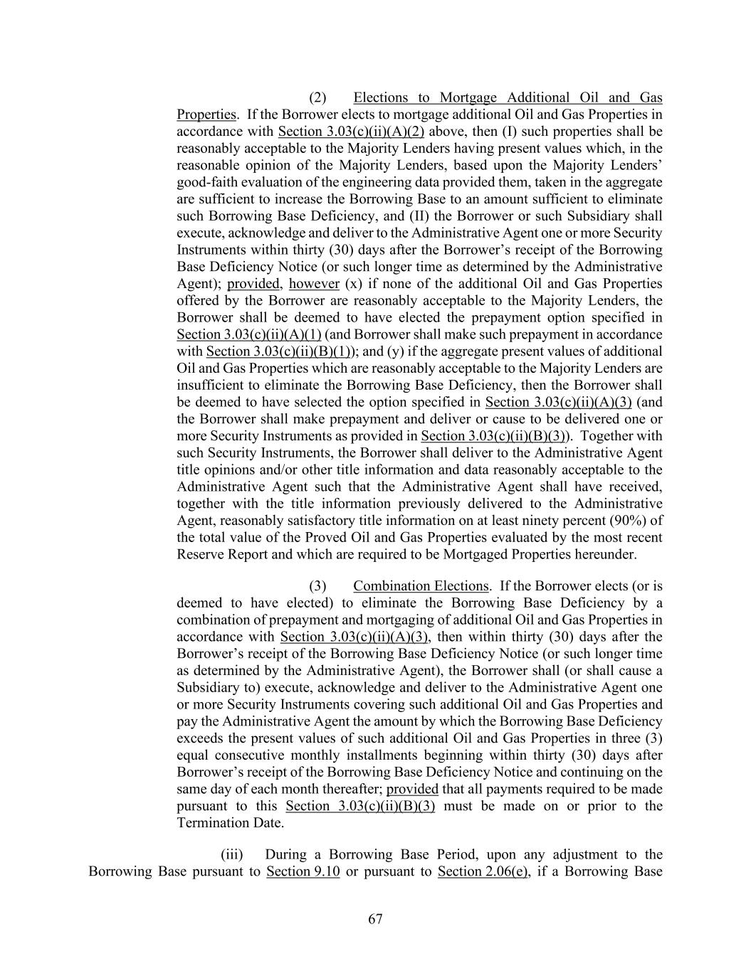 67 (2) Elections to Mortgage Additional Oil and Gas Properties. If the Borrower elects to mortgage additional Oil and Gas Properties in accordance with Section 3.03(c)(ii)(A)(2) above, then (I) such properties shall be reasonably acceptable to the Majority Lenders having present values which, in the reasonable opinion of the Majority Lenders, based upon the Majority Lenders’ good-faith evaluation of the engineering data provided them, taken in the aggregate are sufficient to increase the Borrowing Base to an amount sufficient to eliminate such Borrowing Base Deficiency, and (II) the Borrower or such Subsidiary shall execute, acknowledge and deliver to the Administrative Agent one or more Security Instruments within thirty (30) days after the Borrower’s receipt of the Borrowing Base Deficiency Notice (or such longer time as determined by the Administrative Agent); provided, however (x) if none of the additional Oil and Gas Properties offered by the Borrower are reasonably acceptable to the Majority Lenders, the Borrower shall be deemed to have elected the prepayment option specified in Section 3.03(c)(ii)(A)(1) (and Borrower shall make such prepayment in accordance with Section 3.03(c)(ii)(B)(1)); and (y) if the aggregate present values of additional Oil and Gas Properties which are reasonably acceptable to the Majority Lenders are insufficient to eliminate the Borrowing Base Deficiency, then the Borrower shall be deemed to have selected the option specified in Section 3.03(c)(ii)(A)(3) (and the Borrower shall make prepayment and deliver or cause to be delivered one or more Security Instruments as provided in Section 3.03(c)(ii)(B)(3)). Together with such Security Instruments, the Borrower shall deliver to the Administrative Agent title opinions and/or other title information and data reasonably acceptable to the Administrative Agent such that the Administrative Agent shall have received, together with the title information previously delivered to the Administrative Agent, reasonably satisfactory title information on at least ninety percent (90%) of the total value of the Proved Oil and Gas Properties evaluated by the most recent Reserve Report and which are required to be Mortgaged Properties hereunder. (3) Combination Elections. If the Borrower elects (or is deemed to have elected) to eliminate the Borrowing Base Deficiency by a combination of prepayment and mortgaging of additional Oil and Gas Properties in accordance with Section 3.03(c)(ii)(A)(3), then within thirty (30) days after the Borrower’s receipt of the Borrowing Base Deficiency Notice (or such longer time as determined by the Administrative Agent), the Borrower shall (or shall cause a Subsidiary to) execute, acknowledge and deliver to the Administrative Agent one or more Security Instruments covering such additional Oil and Gas Properties and pay the Administrative Agent the amount by which the Borrowing Base Deficiency exceeds the present values of such additional Oil and Gas Properties in three (3) equal consecutive monthly installments beginning within thirty (30) days after Borrower’s receipt of the Borrowing Base Deficiency Notice and continuing on the same day of each month thereafter; provided that all payments required to be made pursuant to this Section 3.03(c)(ii)(B)(3) must be made on or prior to the Termination Date. (iii) During a Borrowing Base Period, upon any adjustment to the Borrowing Base pursuant to Section 9.10 or pursuant to Section 2.06(e), if a Borrowing Base