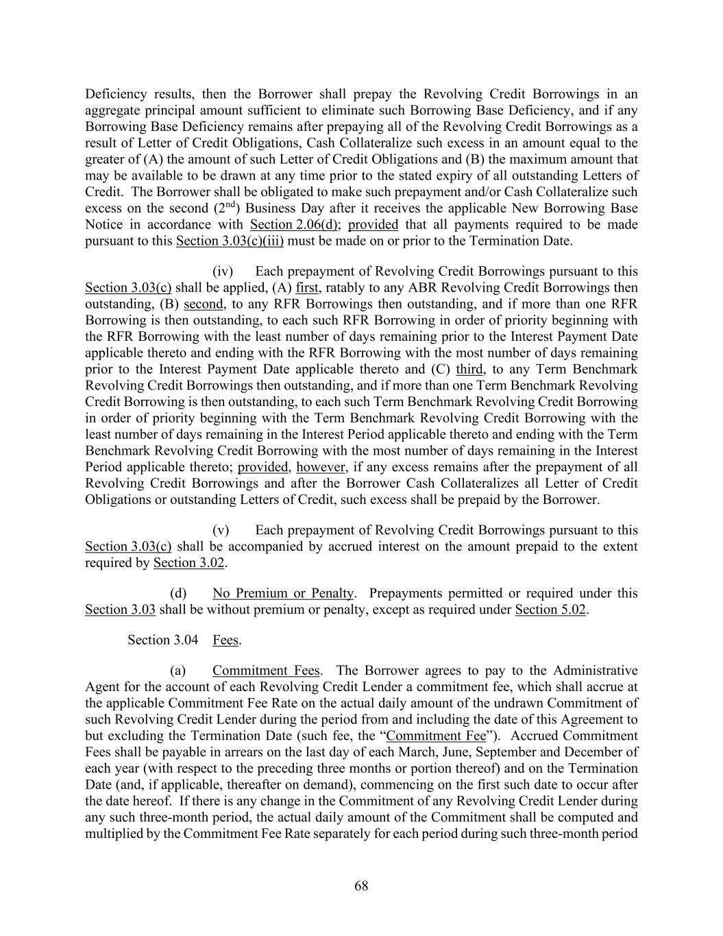 68 Deficiency results, then the Borrower shall prepay the Revolving Credit Borrowings in an aggregate principal amount sufficient to eliminate such Borrowing Base Deficiency, and if any Borrowing Base Deficiency remains after prepaying all of the Revolving Credit Borrowings as a result of Letter of Credit Obligations, Cash Collateralize such excess in an amount equal to the greater of (A) the amount of such Letter of Credit Obligations and (B) the maximum amount that may be available to be drawn at any time prior to the stated expiry of all outstanding Letters of Credit. The Borrower shall be obligated to make such prepayment and/or Cash Collateralize such excess on the second (2nd) Business Day after it receives the applicable New Borrowing Base Notice in accordance with Section 2.06(d); provided that all payments required to be made pursuant to this Section 3.03(c)(iii) must be made on or prior to the Termination Date. (iv) Each prepayment of Revolving Credit Borrowings pursuant to this Section 3.03(c) shall be applied, (A) first, ratably to any ABR Revolving Credit Borrowings then outstanding, (B) second, to any RFR Borrowings then outstanding, and if more than one RFR Borrowing is then outstanding, to each such RFR Borrowing in order of priority beginning with the RFR Borrowing with the least number of days remaining prior to the Interest Payment Date applicable thereto and ending with the RFR Borrowing with the most number of days remaining prior to the Interest Payment Date applicable thereto and (C) third, to any Term Benchmark Revolving Credit Borrowings then outstanding, and if more than one Term Benchmark Revolving Credit Borrowing is then outstanding, to each such Term Benchmark Revolving Credit Borrowing in order of priority beginning with the Term Benchmark Revolving Credit Borrowing with the least number of days remaining in the Interest Period applicable thereto and ending with the Term Benchmark Revolving Credit Borrowing with the most number of days remaining in the Interest Period applicable thereto; provided, however, if any excess remains after the prepayment of all Revolving Credit Borrowings and after the Borrower Cash Collateralizes all Letter of Credit Obligations or outstanding Letters of Credit, such excess shall be prepaid by the Borrower. (v) Each prepayment of Revolving Credit Borrowings pursuant to this Section 3.03(c) shall be accompanied by accrued interest on the amount prepaid to the extent required by Section 3.02. (d) No Premium or Penalty. Prepayments permitted or required under this Section 3.03 shall be without premium or penalty, except as required under Section 5.02. Section 3.04 Fees. (a) Commitment Fees. The Borrower agrees to pay to the Administrative Agent for the account of each Revolving Credit Lender a commitment fee, which shall accrue at the applicable Commitment Fee Rate on the actual daily amount of the undrawn Commitment of such Revolving Credit Lender during the period from and including the date of this Agreement to but excluding the Termination Date (such fee, the “Commitment Fee”). Accrued Commitment Fees shall be payable in arrears on the last day of each March, June, September and December of each year (with respect to the preceding three months or portion thereof) and on the Termination Date (and, if applicable, thereafter on demand), commencing on the first such date to occur after the date hereof. If there is any change in the Commitment of any Revolving Credit Lender during any such three-month period, the actual daily amount of the Commitment shall be computed and multiplied by the Commitment Fee Rate separately for each period during such three-month period