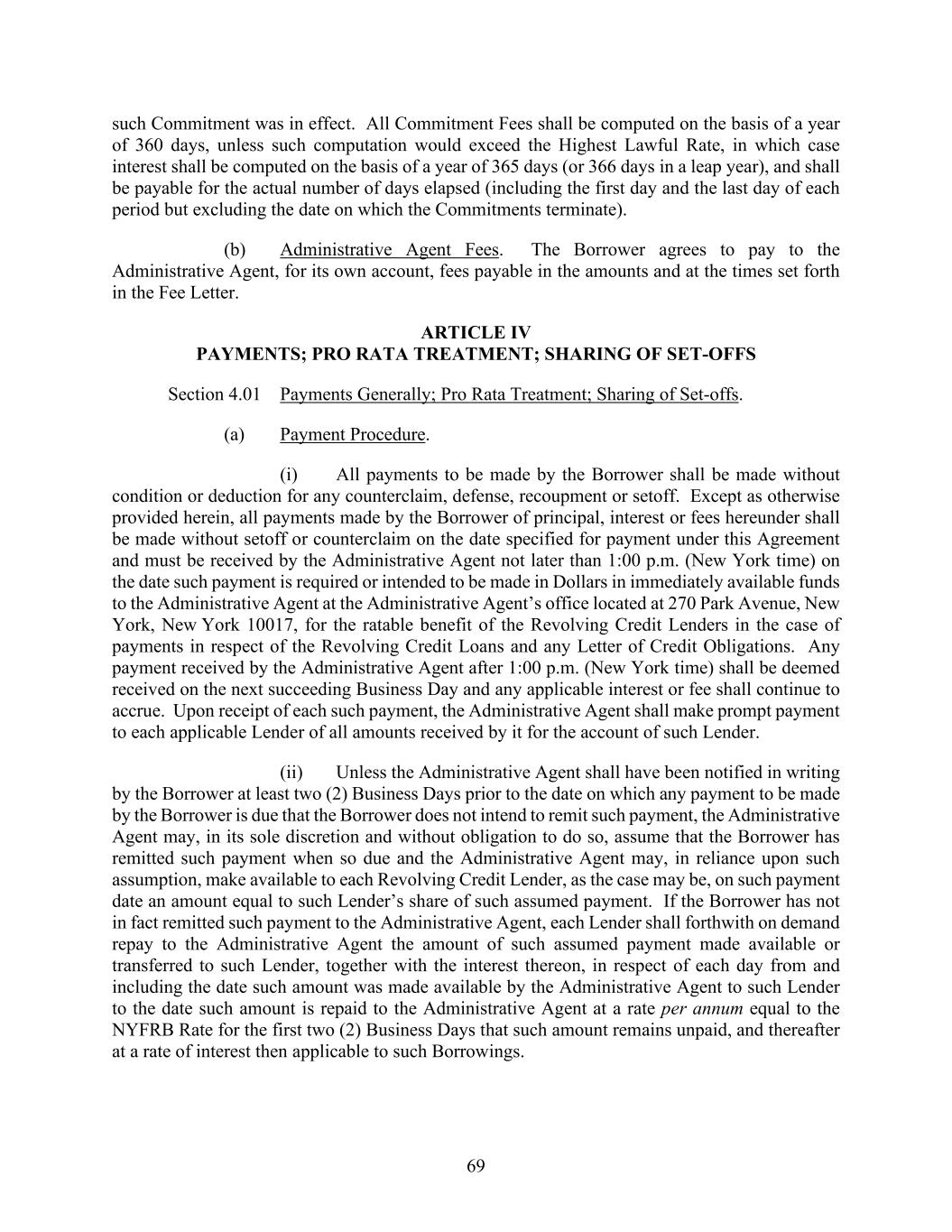 69 such Commitment was in effect. All Commitment Fees shall be computed on the basis of a year of 360 days, unless such computation would exceed the Highest Lawful Rate, in which case interest shall be computed on the basis of a year of 365 days (or 366 days in a leap year), and shall be payable for the actual number of days elapsed (including the first day and the last day of each period but excluding the date on which the Commitments terminate). (b) Administrative Agent Fees. The Borrower agrees to pay to the Administrative Agent, for its own account, fees payable in the amounts and at the times set forth in the Fee Letter. ARTICLE IV PAYMENTS; PRO RATA TREATMENT; SHARING OF SET-OFFS Section 4.01 Payments Generally; Pro Rata Treatment; Sharing of Set-offs. (a) Payment Procedure. (i) All payments to be made by the Borrower shall be made without condition or deduction for any counterclaim, defense, recoupment or setoff. Except as otherwise provided herein, all payments made by the Borrower of principal, interest or fees hereunder shall be made without setoff or counterclaim on the date specified for payment under this Agreement and must be received by the Administrative Agent not later than 1:00 p.m. (New York time) on the date such payment is required or intended to be made in Dollars in immediately available funds to the Administrative Agent at the Administrative Agent’s office located at 270 Park Avenue, New York, New York 10017, for the ratable benefit of the Revolving Credit Lenders in the case of payments in respect of the Revolving Credit Loans and any Letter of Credit Obligations. Any payment received by the Administrative Agent after 1:00 p.m. (New York time) shall be deemed received on the next succeeding Business Day and any applicable interest or fee shall continue to accrue. Upon receipt of each such payment, the Administrative Agent shall make prompt payment to each applicable Lender of all amounts received by it for the account of such Lender. (ii) Unless the Administrative Agent shall have been notified in writing by the Borrower at least two (2) Business Days prior to the date on which any payment to be made by the Borrower is due that the Borrower does not intend to remit such payment, the Administrative Agent may, in its sole discretion and without obligation to do so, assume that the Borrower has remitted such payment when so due and the Administrative Agent may, in reliance upon such assumption, make available to each Revolving Credit Lender, as the case may be, on such payment date an amount equal to such Lender’s share of such assumed payment. If the Borrower has not in fact remitted such payment to the Administrative Agent, each Lender shall forthwith on demand repay to the Administrative Agent the amount of such assumed payment made available or transferred to such Lender, together with the interest thereon, in respect of each day from and including the date such amount was made available by the Administrative Agent to such Lender to the date such amount is repaid to the Administrative Agent at a rate per annum equal to the NYFRB Rate for the first two (2) Business Days that such amount remains unpaid, and thereafter at a rate of interest then applicable to such Borrowings.