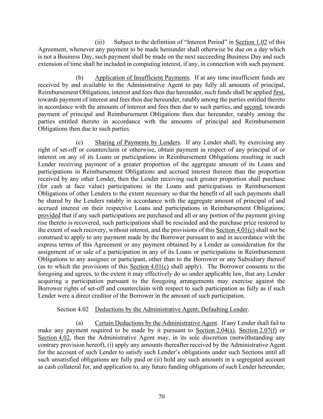 70 (iii) Subject to the definition of “Interest Period” in Section 1.02 of this Agreement, whenever any payment to be made hereunder shall otherwise be due on a day which is not a Business Day, such payment shall be made on the next succeeding Business Day and such extension of time shall be included in computing interest, if any, in connection with such payment. (b) Application of Insufficient Payments. If at any time insufficient funds are received by and available to the Administrative Agent to pay fully all amounts of principal, Reimbursement Obligations, interest and fees then due hereunder, such funds shall be applied first, towards payment of interest and fees then due hereunder, ratably among the parties entitled thereto in accordance with the amounts of interest and fees then due to such parties, and second, towards payment of principal and Reimbursement Obligations then due hereunder, ratably among the parties entitled thereto in accordance with the amounts of principal and Reimbursement Obligations then due to such parties. (c) Sharing of Payments by Lenders. If any Lender shall, by exercising any right of set-off or counterclaim or otherwise, obtain payment in respect of any principal of or interest on any of its Loans or participations in Reimbursement Obligations resulting in such Lender receiving payment of a greater proportion of the aggregate amount of its Loans and participations in Reimbursement Obligations and accrued interest thereon than the proportion received by any other Lender, then the Lender receiving such greater proportion shall purchase (for cash at face value) participations in the Loans and participations in Reimbursement Obligations of other Lenders to the extent necessary so that the benefit of all such payments shall be shared by the Lenders ratably in accordance with the aggregate amount of principal of and accrued interest on their respective Loans and participations in Reimbursement Obligations; provided that if any such participations are purchased and all or any portion of the payment giving rise thereto is recovered, such participations shall be rescinded and the purchase price restored to the extent of such recovery, without interest, and the provisions of this Section 4.01(c) shall not be construed to apply to any payment made by the Borrower pursuant to and in accordance with the express terms of this Agreement or any payment obtained by a Lender as consideration for the assignment of or sale of a participation in any of its Loans or participations in Reimbursement Obligations to any assignee or participant, other than to the Borrower or any Subsidiary thereof (as to which the provisions of this Section 4.01(c) shall apply). The Borrower consents to the foregoing and agrees, to the extent it may effectively do so under applicable law, that any Lender acquiring a participation pursuant to the foregoing arrangements may exercise against the Borrower rights of set-off and counterclaim with respect to such participation as fully as if such Lender were a direct creditor of the Borrower in the amount of such participation. Section 4.02 Deductions by the Administrative Agent; Defaulting Lender. (a) Certain Deductions by the Administrative Agent. If any Lender shall fail to make any payment required to be made by it pursuant to Section 2.04(a), Section 2.07(f) or Section 4.02, then the Administrative Agent may, in its sole discretion (notwithstanding any contrary provision hereof), (i) apply any amounts thereafter received by the Administrative Agent for the account of such Lender to satisfy such Lender’s obligations under such Sections until all such unsatisfied obligations are fully paid or (ii) hold any such amounts in a segregated account as cash collateral for, and application to, any future funding obligations of such Lender hereunder,