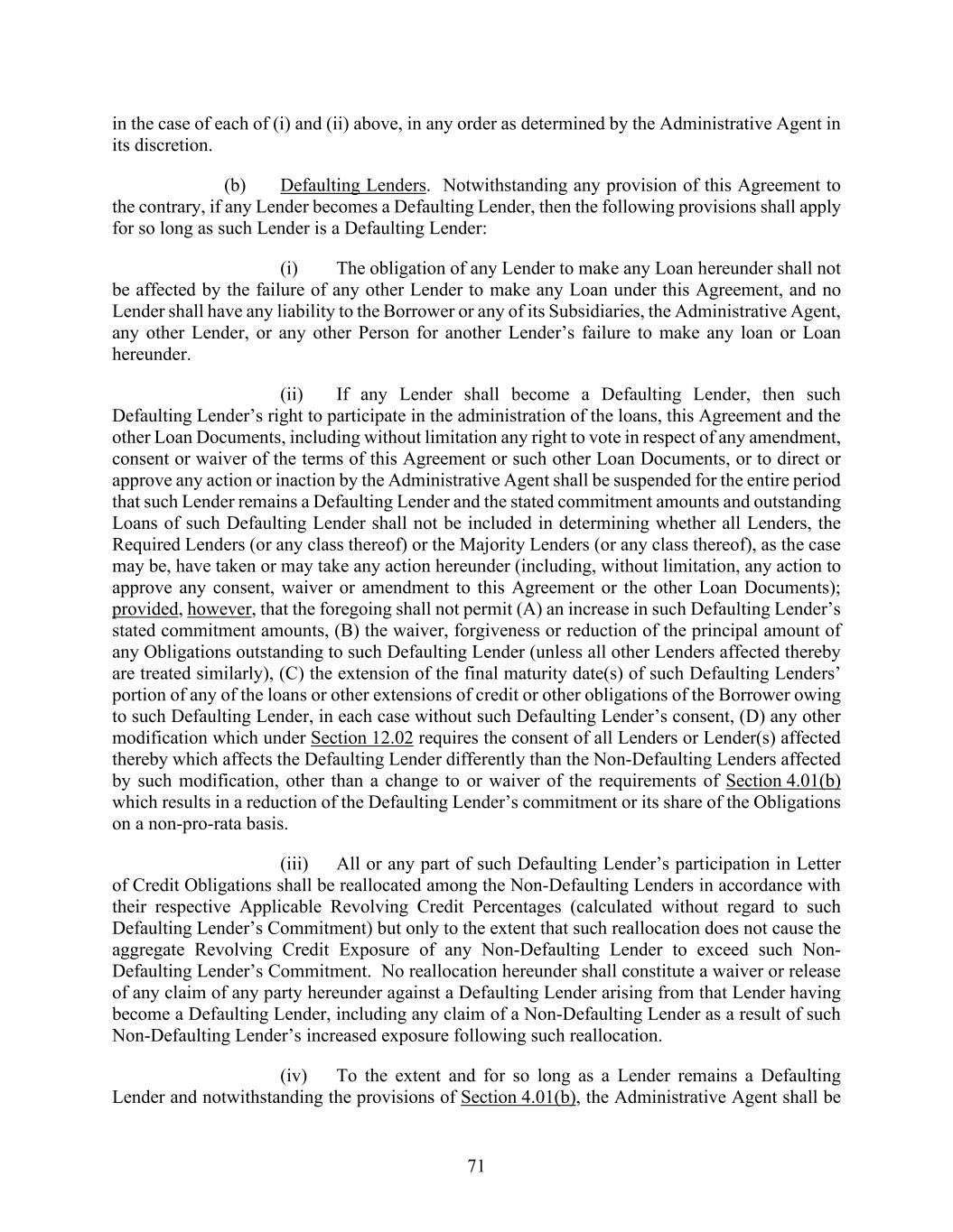 71 in the case of each of (i) and (ii) above, in any order as determined by the Administrative Agent in its discretion. (b) Defaulting Lenders. Notwithstanding any provision of this Agreement to the contrary, if any Lender becomes a Defaulting Lender, then the following provisions shall apply for so long as such Lender is a Defaulting Lender: (i) The obligation of any Lender to make any Loan hereunder shall not be affected by the failure of any other Lender to make any Loan under this Agreement, and no Lender shall have any liability to the Borrower or any of its Subsidiaries, the Administrative Agent, any other Lender, or any other Person for another Lender’s failure to make any loan or Loan hereunder. (ii) If any Lender shall become a Defaulting Lender, then such Defaulting Lender’s right to participate in the administration of the loans, this Agreement and the other Loan Documents, including without limitation any right to vote in respect of any amendment, consent or waiver of the terms of this Agreement or such other Loan Documents, or to direct or approve any action or inaction by the Administrative Agent shall be suspended for the entire period that such Lender remains a Defaulting Lender and the stated commitment amounts and outstanding Loans of such Defaulting Lender shall not be included in determining whether all Lenders, the Required Lenders (or any class thereof) or the Majority Lenders (or any class thereof), as the case may be, have taken or may take any action hereunder (including, without limitation, any action to approve any consent, waiver or amendment to this Agreement or the other Loan Documents); provided, however, that the foregoing shall not permit (A) an increase in such Defaulting Lender’s stated commitment amounts, (B) the waiver, forgiveness or reduction of the principal amount of any Obligations outstanding to such Defaulting Lender (unless all other Lenders affected thereby are treated similarly), (C) the extension of the final maturity date(s) of such Defaulting Lenders’ portion of any of the loans or other extensions of credit or other obligations of the Borrower owing to such Defaulting Lender, in each case without such Defaulting Lender’s consent, (D) any other modification which under Section 12.02 requires the consent of all Lenders or Lender(s) affected thereby which affects the Defaulting Lender differently than the Non-Defaulting Lenders affected by such modification, other than a change to or waiver of the requirements of Section 4.01(b) which results in a reduction of the Defaulting Lender’s commitment or its share of the Obligations on a non-pro-rata basis. (iii) All or any part of such Defaulting Lender’s participation in Letter of Credit Obligations shall be reallocated among the Non-Defaulting Lenders in accordance with their respective Applicable Revolving Credit Percentages (calculated without regard to such Defaulting Lender’s Commitment) but only to the extent that such reallocation does not cause the aggregate Revolving Credit Exposure of any Non-Defaulting Lender to exceed such Non- Defaulting Lender’s Commitment. No reallocation hereunder shall constitute a waiver or release of any claim of any party hereunder against a Defaulting Lender arising from that Lender having become a Defaulting Lender, including any claim of a Non-Defaulting Lender as a result of such Non-Defaulting Lender’s increased exposure following such reallocation. (iv) To the extent and for so long as a Lender remains a Defaulting Lender and notwithstanding the provisions of Section 4.01(b), the Administrative Agent shall be