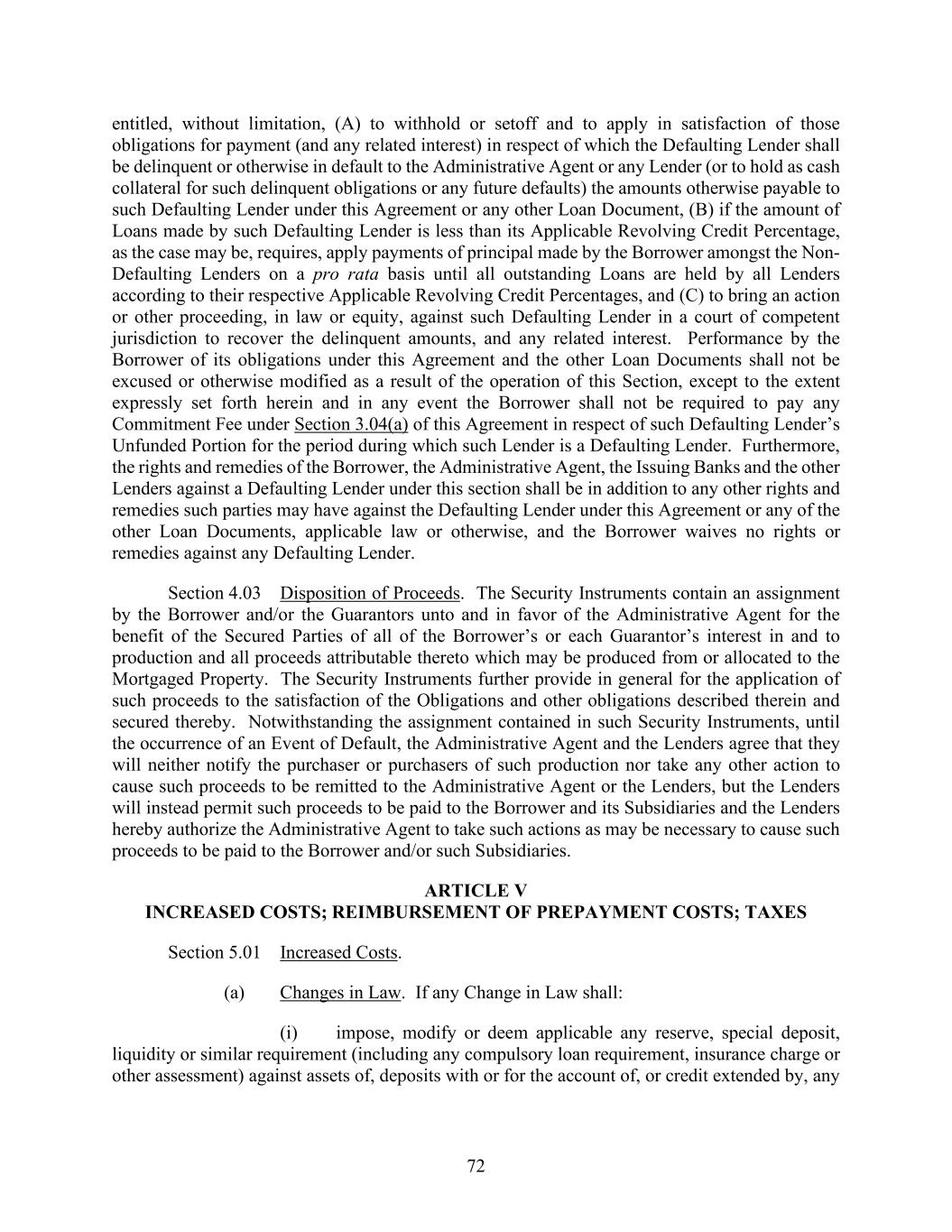 72 entitled, without limitation, (A) to withhold or setoff and to apply in satisfaction of those obligations for payment (and any related interest) in respect of which the Defaulting Lender shall be delinquent or otherwise in default to the Administrative Agent or any Lender (or to hold as cash collateral for such delinquent obligations or any future defaults) the amounts otherwise payable to such Defaulting Lender under this Agreement or any other Loan Document, (B) if the amount of Loans made by such Defaulting Lender is less than its Applicable Revolving Credit Percentage, as the case may be, requires, apply payments of principal made by the Borrower amongst the Non- Defaulting Lenders on a pro rata basis until all outstanding Loans are held by all Lenders according to their respective Applicable Revolving Credit Percentages, and (C) to bring an action or other proceeding, in law or equity, against such Defaulting Lender in a court of competent jurisdiction to recover the delinquent amounts, and any related interest. Performance by the Borrower of its obligations under this Agreement and the other Loan Documents shall not be excused or otherwise modified as a result of the operation of this Section, except to the extent expressly set forth herein and in any event the Borrower shall not be required to pay any Commitment Fee under Section 3.04(a) of this Agreement in respect of such Defaulting Lender’s Unfunded Portion for the period during which such Lender is a Defaulting Lender. Furthermore, the rights and remedies of the Borrower, the Administrative Agent, the Issuing Banks and the other Lenders against a Defaulting Lender under this section shall be in addition to any other rights and remedies such parties may have against the Defaulting Lender under this Agreement or any of the other Loan Documents, applicable law or otherwise, and the Borrower waives no rights or remedies against any Defaulting Lender. Section 4.03 Disposition of Proceeds. The Security Instruments contain an assignment by the Borrower and/or the Guarantors unto and in favor of the Administrative Agent for the benefit of the Secured Parties of all of the Borrower’s or each Guarantor’s interest in and to production and all proceeds attributable thereto which may be produced from or allocated to the Mortgaged Property. The Security Instruments further provide in general for the application of such proceeds to the satisfaction of the Obligations and other obligations described therein and secured thereby. Notwithstanding the assignment contained in such Security Instruments, until the occurrence of an Event of Default, the Administrative Agent and the Lenders agree that they will neither notify the purchaser or purchasers of such production nor take any other action to cause such proceeds to be remitted to the Administrative Agent or the Lenders, but the Lenders will instead permit such proceeds to be paid to the Borrower and its Subsidiaries and the Lenders hereby authorize the Administrative Agent to take such actions as may be necessary to cause such proceeds to be paid to the Borrower and/or such Subsidiaries. ARTICLE V INCREASED COSTS; REIMBURSEMENT OF PREPAYMENT COSTS; TAXES Section 5.01 Increased Costs. (a) Changes in Law. If any Change in Law shall: (i) impose, modify or deem applicable any reserve, special deposit, liquidity or similar requirement (including any compulsory loan requirement, insurance charge or other assessment) against assets of, deposits with or for the account of, or credit extended by, any