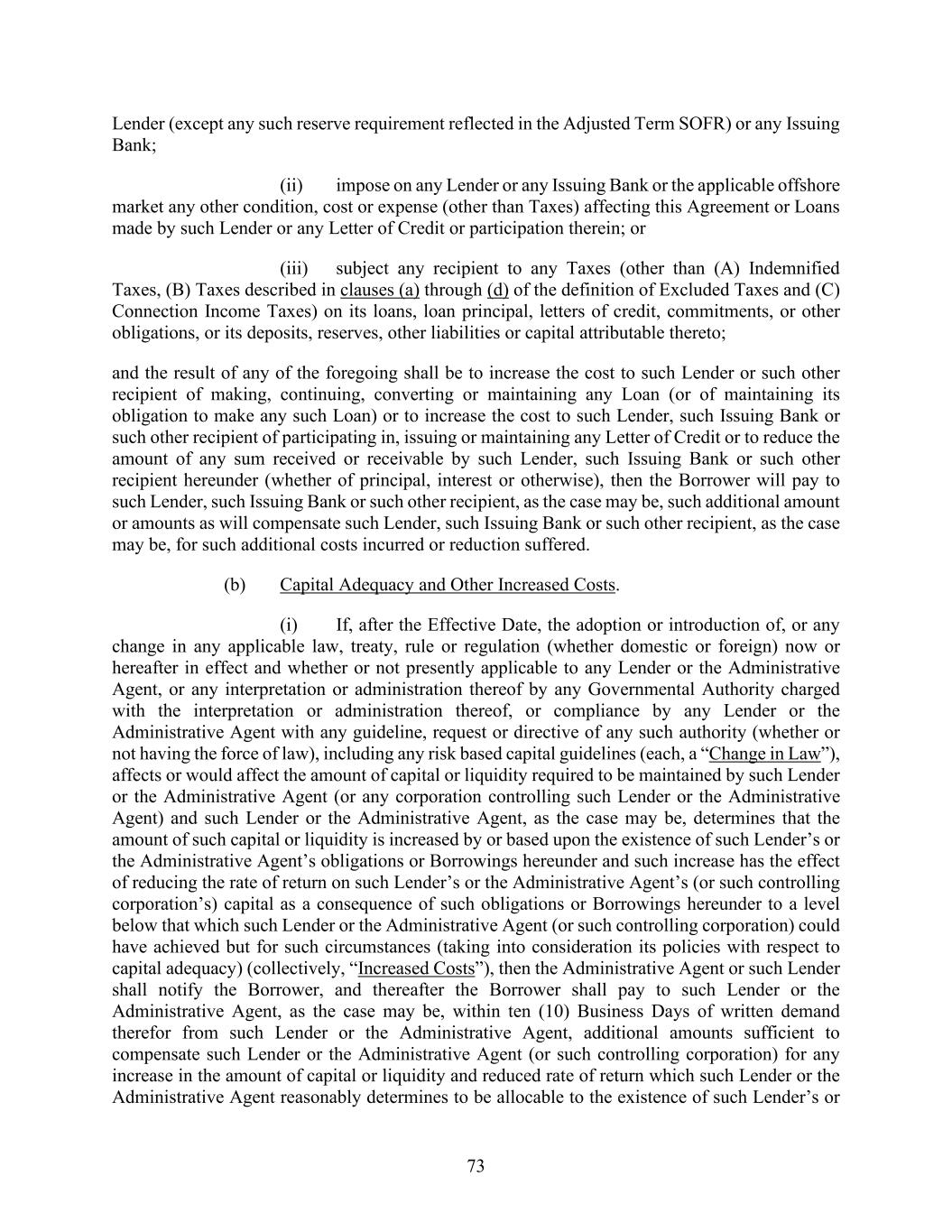 73 Lender (except any such reserve requirement reflected in the Adjusted Term SOFR) or any Issuing Bank; (ii) impose on any Lender or any Issuing Bank or the applicable offshore market any other condition, cost or expense (other than Taxes) affecting this Agreement or Loans made by such Lender or any Letter of Credit or participation therein; or (iii) subject any recipient to any Taxes (other than (A) Indemnified Taxes, (B) Taxes described in clauses (a) through (d) of the definition of Excluded Taxes and (C) Connection Income Taxes) on its loans, loan principal, letters of credit, commitments, or other obligations, or its deposits, reserves, other liabilities or capital attributable thereto; and the result of any of the foregoing shall be to increase the cost to such Lender or such other recipient of making, continuing, converting or maintaining any Loan (or of maintaining its obligation to make any such Loan) or to increase the cost to such Lender, such Issuing Bank or such other recipient of participating in, issuing or maintaining any Letter of Credit or to reduce the amount of any sum received or receivable by such Lender, such Issuing Bank or such other recipient hereunder (whether of principal, interest or otherwise), then the Borrower will pay to such Lender, such Issuing Bank or such other recipient, as the case may be, such additional amount or amounts as will compensate such Lender, such Issuing Bank or such other recipient, as the case may be, for such additional costs incurred or reduction suffered. (b) Capital Adequacy and Other Increased Costs. (i) If, after the Effective Date, the adoption or introduction of, or any change in any applicable law, treaty, rule or regulation (whether domestic or foreign) now or hereafter in effect and whether or not presently applicable to any Lender or the Administrative Agent, or any interpretation or administration thereof by any Governmental Authority charged with the interpretation or administration thereof, or compliance by any Lender or the Administrative Agent with any guideline, request or directive of any such authority (whether or not having the force of law), including any risk based capital guidelines (each, a “Change in Law”), affects or would affect the amount of capital or liquidity required to be maintained by such Lender or the Administrative Agent (or any corporation controlling such Lender or the Administrative Agent) and such Lender or the Administrative Agent, as the case may be, determines that the amount of such capital or liquidity is increased by or based upon the existence of such Lender’s or the Administrative Agent’s obligations or Borrowings hereunder and such increase has the effect of reducing the rate of return on such Lender’s or the Administrative Agent’s (or such controlling corporation’s) capital as a consequence of such obligations or Borrowings hereunder to a level below that which such Lender or the Administrative Agent (or such controlling corporation) could have achieved but for such circumstances (taking into consideration its policies with respect to capital adequacy) (collectively, “Increased Costs”), then the Administrative Agent or such Lender shall notify the Borrower, and thereafter the Borrower shall pay to such Lender or the Administrative Agent, as the case may be, within ten (10) Business Days of written demand therefor from such Lender or the Administrative Agent, additional amounts sufficient to compensate such Lender or the Administrative Agent (or such controlling corporation) for any increase in the amount of capital or liquidity and reduced rate of return which such Lender or the Administrative Agent reasonably determines to be allocable to the existence of such Lender’s or
