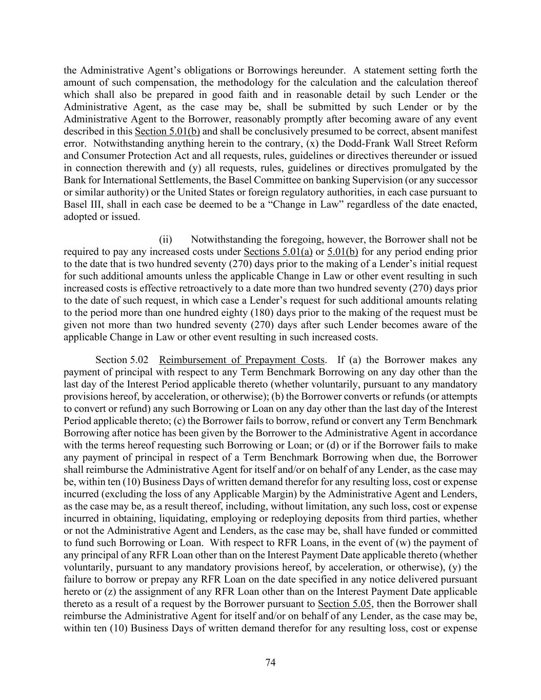 74 the Administrative Agent’s obligations or Borrowings hereunder. A statement setting forth the amount of such compensation, the methodology for the calculation and the calculation thereof which shall also be prepared in good faith and in reasonable detail by such Lender or the Administrative Agent, as the case may be, shall be submitted by such Lender or by the Administrative Agent to the Borrower, reasonably promptly after becoming aware of any event described in this Section 5.01(b) and shall be conclusively presumed to be correct, absent manifest error. Notwithstanding anything herein to the contrary, (x) the Dodd-Frank Wall Street Reform and Consumer Protection Act and all requests, rules, guidelines or directives thereunder or issued in connection therewith and (y) all requests, rules, guidelines or directives promulgated by the Bank for International Settlements, the Basel Committee on banking Supervision (or any successor or similar authority) or the United States or foreign regulatory authorities, in each case pursuant to Basel III, shall in each case be deemed to be a “Change in Law” regardless of the date enacted, adopted or issued. (ii) Notwithstanding the foregoing, however, the Borrower shall not be required to pay any increased costs under Sections 5.01(a) or 5.01(b) for any period ending prior to the date that is two hundred seventy (270) days prior to the making of a Lender’s initial request for such additional amounts unless the applicable Change in Law or other event resulting in such increased costs is effective retroactively to a date more than two hundred seventy (270) days prior to the date of such request, in which case a Lender’s request for such additional amounts relating to the period more than one hundred eighty (180) days prior to the making of the request must be given not more than two hundred seventy (270) days after such Lender becomes aware of the applicable Change in Law or other event resulting in such increased costs. Section 5.02 Reimbursement of Prepayment Costs. If (a) the Borrower makes any payment of principal with respect to any Term Benchmark Borrowing on any day other than the last day of the Interest Period applicable thereto (whether voluntarily, pursuant to any mandatory provisions hereof, by acceleration, or otherwise); (b) the Borrower converts or refunds (or attempts to convert or refund) any such Borrowing or Loan on any day other than the last day of the Interest Period applicable thereto; (c) the Borrower fails to borrow, refund or convert any Term Benchmark Borrowing after notice has been given by the Borrower to the Administrative Agent in accordance with the terms hereof requesting such Borrowing or Loan; or (d) or if the Borrower fails to make any payment of principal in respect of a Term Benchmark Borrowing when due, the Borrower shall reimburse the Administrative Agent for itself and/or on behalf of any Lender, as the case may be, within ten (10) Business Days of written demand therefor for any resulting loss, cost or expense incurred (excluding the loss of any Applicable Margin) by the Administrative Agent and Lenders, as the case may be, as a result thereof, including, without limitation, any such loss, cost or expense incurred in obtaining, liquidating, employing or redeploying deposits from third parties, whether or not the Administrative Agent and Lenders, as the case may be, shall have funded or committed to fund such Borrowing or Loan. With respect to RFR Loans, in the event of (w) the payment of any principal of any RFR Loan other than on the Interest Payment Date applicable thereto (whether voluntarily, pursuant to any mandatory provisions hereof, by acceleration, or otherwise), (y) the failure to borrow or prepay any RFR Loan on the date specified in any notice delivered pursuant hereto or (z) the assignment of any RFR Loan other than on the Interest Payment Date applicable thereto as a result of a request by the Borrower pursuant to Section 5.05, then the Borrower shall reimburse the Administrative Agent for itself and/or on behalf of any Lender, as the case may be, within ten (10) Business Days of written demand therefor for any resulting loss, cost or expense