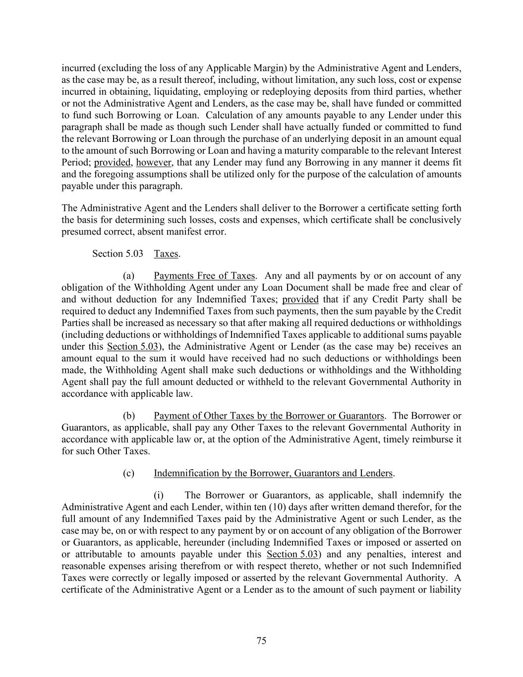 75 incurred (excluding the loss of any Applicable Margin) by the Administrative Agent and Lenders, as the case may be, as a result thereof, including, without limitation, any such loss, cost or expense incurred in obtaining, liquidating, employing or redeploying deposits from third parties, whether or not the Administrative Agent and Lenders, as the case may be, shall have funded or committed to fund such Borrowing or Loan. Calculation of any amounts payable to any Lender under this paragraph shall be made as though such Lender shall have actually funded or committed to fund the relevant Borrowing or Loan through the purchase of an underlying deposit in an amount equal to the amount of such Borrowing or Loan and having a maturity comparable to the relevant Interest Period; provided, however, that any Lender may fund any Borrowing in any manner it deems fit and the foregoing assumptions shall be utilized only for the purpose of the calculation of amounts payable under this paragraph. The Administrative Agent and the Lenders shall deliver to the Borrower a certificate setting forth the basis for determining such losses, costs and expenses, which certificate shall be conclusively presumed correct, absent manifest error. Section 5.03 Taxes. (a) Payments Free of Taxes. Any and all payments by or on account of any obligation of the Withholding Agent under any Loan Document shall be made free and clear of and without deduction for any Indemnified Taxes; provided that if any Credit Party shall be required to deduct any Indemnified Taxes from such payments, then the sum payable by the Credit Parties shall be increased as necessary so that after making all required deductions or withholdings (including deductions or withholdings of Indemnified Taxes applicable to additional sums payable under this Section 5.03), the Administrative Agent or Lender (as the case may be) receives an amount equal to the sum it would have received had no such deductions or withholdings been made, the Withholding Agent shall make such deductions or withholdings and the Withholding Agent shall pay the full amount deducted or withheld to the relevant Governmental Authority in accordance with applicable law. (b) Payment of Other Taxes by the Borrower or Guarantors. The Borrower or Guarantors, as applicable, shall pay any Other Taxes to the relevant Governmental Authority in accordance with applicable law or, at the option of the Administrative Agent, timely reimburse it for such Other Taxes. (c) Indemnification by the Borrower, Guarantors and Lenders. (i) The Borrower or Guarantors, as applicable, shall indemnify the Administrative Agent and each Lender, within ten (10) days after written demand therefor, for the full amount of any Indemnified Taxes paid by the Administrative Agent or such Lender, as the case may be, on or with respect to any payment by or on account of any obligation of the Borrower or Guarantors, as applicable, hereunder (including Indemnified Taxes or imposed or asserted on or attributable to amounts payable under this Section 5.03) and any penalties, interest and reasonable expenses arising therefrom or with respect thereto, whether or not such Indemnified Taxes were correctly or legally imposed or asserted by the relevant Governmental Authority. A certificate of the Administrative Agent or a Lender as to the amount of such payment or liability