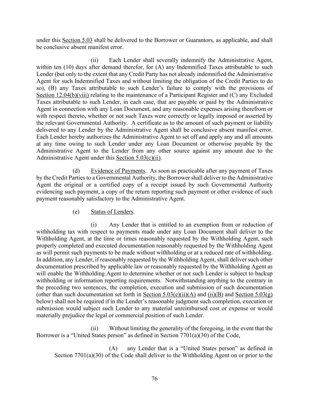 76 under this Section 5.03 shall be delivered to the Borrower or Guarantors, as applicable, and shall be conclusive absent manifest error. (ii) Each Lender shall severally indemnify the Administrative Agent, within ten (10) days after demand therefor, for (A) any Indemnified Taxes attributable to such Lender (but only to the extent that any Credit Party has not already indemnified the Administrative Agent for such Indemnified Taxes and without limiting the obligation of the Credit Parties to do so), (B) any Taxes attributable to such Lender’s failure to comply with the provisions of Section 12.04(b)(viii) relating to the maintenance of a Participant Register and (C) any Excluded Taxes attributable to such Lender, in each case, that are payable or paid by the Administrative Agent in connection with any Loan Document, and any reasonable expenses arising therefrom or with respect thereto, whether or not such Taxes were correctly or legally imposed or asserted by the relevant Governmental Authority. A certificate as to the amount of such payment or liability delivered to any Lender by the Administrative Agent shall be conclusive absent manifest error. Each Lender hereby authorizes the Administrative Agent to set off and apply any and all amounts at any time owing to such Lender under any Loan Document or otherwise payable by the Administrative Agent to the Lender from any other source against any amount due to the Administrative Agent under this Section 5.03(c)(ii). (d) Evidence of Payments. As soon as practicable after any payment of Taxes by the Credit Parties to a Governmental Authority, the Borrower shall deliver to the Administrative Agent the original or a certified copy of a receipt issued by such Governmental Authority evidencing such payment, a copy of the return reporting such payment or other evidence of such payment reasonably satisfactory to the Administrative Agent. (e) Status of Lenders. (i) Any Lender that is entitled to an exemption from or reduction of withholding tax with respect to payments made under any Loan Document shall deliver to the Withholding Agent, at the time or times reasonably requested by the Withholding Agent, such properly completed and executed documentation reasonably requested by the Withholding Agent as will permit such payments to be made without withholding or at a reduced rate of withholding. In addition, any Lender, if reasonably requested by the Withholding Agent, shall deliver such other documentation prescribed by applicable law or reasonably requested by the Withholding Agent as will enable the Withholding Agent to determine whether or not such Lender is subject to backup withholding or information reporting requirements. Notwithstanding anything to the contrary in the preceding two sentences, the completion, execution and submission of such documentation (other than such documentation set forth in Section 5.03(e)(ii)(A) and (ii)(B) and Section 5.03(g) below) shall not be required if in the Lender’s reasonable judgment such completion, execution or submission would subject such Lender to any material unreimbursed cost or expense or would materially prejudice the legal or commercial position of such Lender. (ii) Without limiting the generality of the foregoing, in the event that the Borrower is a “United States person” as defined in Section 7701(a)(30) of the Code, (A) any Lender that is a “United States person” as defined in Section 7701(a)(30) of the Code shall deliver to the Withholding Agent on or prior to the
