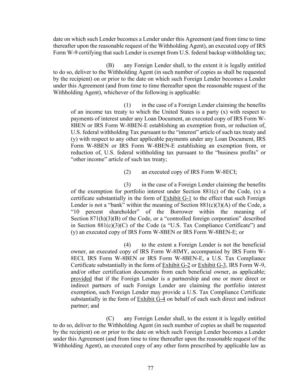77 date on which such Lender becomes a Lender under this Agreement (and from time to time thereafter upon the reasonable request of the Withholding Agent), an executed copy of IRS Form W-9 certifying that such Lender is exempt from U.S. federal backup withholding tax; (B) any Foreign Lender shall, to the extent it is legally entitled to do so, deliver to the Withholding Agent (in such number of copies as shall be requested by the recipient) on or prior to the date on which such Foreign Lender becomes a Lender under this Agreement (and from time to time thereafter upon the reasonable request of the Withholding Agent), whichever of the following is applicable: (1) in the case of a Foreign Lender claiming the benefits of an income tax treaty to which the United States is a party (x) with respect to payments of interest under any Loan Document, an executed copy of IRS Form W- 8BEN or IRS Form W-8BEN-E establishing an exemption from, or reduction of, U.S. federal withholding Tax pursuant to the “interest” article of such tax treaty and (y) with respect to any other applicable payments under any Loan Document, IRS Form W-8BEN or IRS Form W-8BEN-E establishing an exemption from, or reduction of, U.S. federal withholding tax pursuant to the “business profits” or “other income” article of such tax treaty; (2) an executed copy of IRS Form W-8ECI; (3) in the case of a Foreign Lender claiming the benefits of the exemption for portfolio interest under Section 881(c) of the Code, (x) a certificate substantially in the form of Exhibit G-1 to the effect that such Foreign Lender is not a “bank” within the meaning of Section 881(c)(3)(A) of the Code, a “10 percent shareholder” of the Borrower within the meaning of Section 871(h)(3)(B) of the Code, or a “controlled foreign corporation” described in Section 881(c)(3)(C) of the Code (a “U.S. Tax Compliance Certificate”) and (y) an executed copy of IRS Form W-8BEN or IRS Form W-8BEN-E; or (4) to the extent a Foreign Lender is not the beneficial owner, an executed copy of IRS Form W-8IMY, accompanied by IRS Form W- 8ECI, IRS Form W-8BEN or IRS Form W-8BEN-E, a U.S. Tax Compliance Certificate substantially in the form of Exhibit G-2 or Exhibit G-3, IRS Form W-9, and/or other certification documents from each beneficial owner, as applicable; provided that if the Foreign Lender is a partnership and one or more direct or indirect partners of such Foreign Lender are claiming the portfolio interest exemption, such Foreign Lender may provide a U.S. Tax Compliance Certificate substantially in the form of Exhibit G-4 on behalf of each such direct and indirect partner; and (C) any Foreign Lender shall, to the extent it is legally entitled to do so, deliver to the Withholding Agent (in such number of copies as shall be requested by the recipient) on or prior to the date on which such Foreign Lender becomes a Lender under this Agreement (and from time to time thereafter upon the reasonable request of the Withholding Agent), an executed copy of any other form prescribed by applicable law as