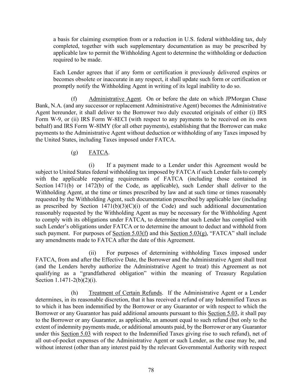 78 a basis for claiming exemption from or a reduction in U.S. federal withholding tax, duly completed, together with such supplementary documentation as may be prescribed by applicable law to permit the Withholding Agent to determine the withholding or deduction required to be made. Each Lender agrees that if any form or certification it previously delivered expires or becomes obsolete or inaccurate in any respect, it shall update such form or certification or promptly notify the Withholding Agent in writing of its legal inability to do so. (f) Administrative Agent. On or before the date on which JPMorgan Chase Bank, N.A. (and any successor or replacement Administrative Agent) becomes the Administrative Agent hereunder, it shall deliver to the Borrower two duly executed originals of either (i) IRS Form W-9, or (ii) IRS Form W-8ECI (with respect to any payments to be received on its own behalf) and IRS Form W-8IMY (for all other payments), establishing that the Borrower can make payments to the Administrative Agent without deduction or withholding of any Taxes imposed by the United States, including Taxes imposed under FATCA. (g) FATCA. (i) If a payment made to a Lender under this Agreement would be subject to United States federal withholding tax imposed by FATCA if such Lender fails to comply with the applicable reporting requirements of FATCA (including those contained in Section 1471(b) or 1472(b) of the Code, as applicable), such Lender shall deliver to the Withholding Agent, at the time or times prescribed by law and at such time or times reasonably requested by the Withholding Agent, such documentation prescribed by applicable law (including as prescribed by Section 1471(b)(3)(C)(i) of the Code) and such additional documentation reasonably requested by the Withholding Agent as may be necessary for the Withholding Agent to comply with its obligations under FATCA, to determine that such Lender has complied with such Lender’s obligations under FATCA or to determine the amount to deduct and withhold from such payment. For purposes of Section 5.03(f) and this Section 5.03(g), “FATCA” shall include any amendments made to FATCA after the date of this Agreement. (ii) For purposes of determining withholding Taxes imposed under FATCA, from and after the Effective Date, the Borrower and the Administrative Agent shall treat (and the Lenders hereby authorize the Administrative Agent to treat) this Agreement as not qualifying as a “grandfathered obligation” within the meaning of Treasury Regulation Section 1.1471-2(b)(2)(i). (h) Treatment of Certain Refunds. If the Administrative Agent or a Lender determines, in its reasonable discretion, that it has received a refund of any Indemnified Taxes as to which it has been indemnified by the Borrower or any Guarantor or with respect to which the Borrower or any Guarantor has paid additional amounts pursuant to this Section 5.03, it shall pay to the Borrower or any Guarantor, as applicable, an amount equal to such refund (but only to the extent of indemnity payments made, or additional amounts paid, by the Borrower or any Guarantor under this Section 5.03 with respect to the Indemnified Taxes giving rise to such refund), net of all out-of-pocket expenses of the Administrative Agent or such Lender, as the case may be, and without interest (other than any interest paid by the relevant Governmental Authority with respect