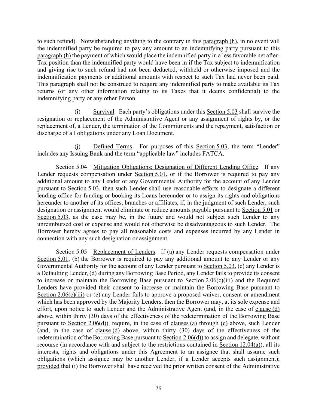 79 to such refund). Notwithstanding anything to the contrary in this paragraph (h), in no event will the indemnified party be required to pay any amount to an indemnifying party pursuant to this paragraph (h) the payment of which would place the indemnified party in a less favorable net after- Tax position than the indemnified party would have been in if the Tax subject to indemnification and giving rise to such refund had not been deducted, withheld or otherwise imposed and the indemnification payments or additional amounts with respect to such Tax had never been paid. This paragraph shall not be construed to require any indemnified party to make available its Tax returns (or any other information relating to its Taxes that it deems confidential) to the indemnifying party or any other Person. (i) Survival. Each party’s obligations under this Section 5.03 shall survive the resignation or replacement of the Administrative Agent or any assignment of rights by, or the replacement of, a Lender, the termination of the Commitments and the repayment, satisfaction or discharge of all obligations under any Loan Document. (j) Defined Terms. For purposes of this Section 5.03, the term “Lender” includes any Issuing Bank and the term “applicable law” includes FATCA. Section 5.04 Mitigation Obligations; Designation of Different Lending Office. If any Lender requests compensation under Section 5.01, or if the Borrower is required to pay any additional amount to any Lender or any Governmental Authority for the account of any Lender pursuant to Section 5.03, then such Lender shall use reasonable efforts to designate a different lending office for funding or booking its Loans hereunder or to assign its rights and obligations hereunder to another of its offices, branches or affiliates, if, in the judgment of such Lender, such designation or assignment would eliminate or reduce amounts payable pursuant to Section 5.01 or Section 5.03, as the case may be, in the future and would not subject such Lender to any unreimbursed cost or expense and would not otherwise be disadvantageous to such Lender. The Borrower hereby agrees to pay all reasonable costs and expenses incurred by any Lender in connection with any such designation or assignment. Section 5.05 Replacement of Lenders. If (a) any Lender requests compensation under Section 5.01, (b) the Borrower is required to pay any additional amount to any Lender or any Governmental Authority for the account of any Lender pursuant to Section 5.03, (c) any Lender is a Defaulting Lender, (d) during any Borrowing Base Period, any Lender fails to provide its consent to increase or maintain the Borrowing Base pursuant to Section 2.06(c)(iii) and the Required Lenders have provided their consent to increase or maintain the Borrowing Base pursuant to Section 2.06(c)(iii) or (e) any Lender fails to approve a proposed waiver, consent or amendment which has been approved by the Majority Lenders, then the Borrower may, at its sole expense and effort, upon notice to such Lender and the Administrative Agent (and, in the case of clause (d) above, within thirty (30) days of the effectiveness of the redetermination of the Borrowing Base pursuant to Section 2.06(d)), require, in the case of clauses (a) through (c) above, such Lender (and, in the case of clause (d) above, within thirty (30) days of the effectiveness of the redetermination of the Borrowing Base pursuant to Section 2.06(d)) to assign and delegate, without recourse (in accordance with and subject to the restrictions contained in Section 12.04(a)), all its interests, rights and obligations under this Agreement to an assignee that shall assume such obligations (which assignee may be another Lender, if a Lender accepts such assignment); provided that (i) the Borrower shall have received the prior written consent of the Administrative
