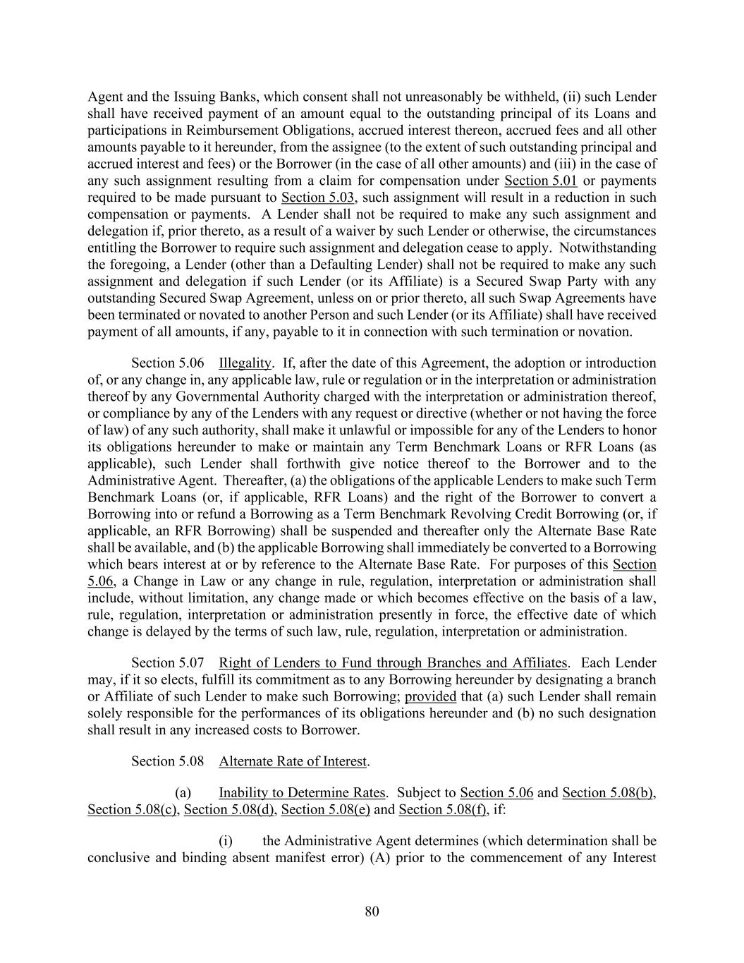 80 Agent and the Issuing Banks, which consent shall not unreasonably be withheld, (ii) such Lender shall have received payment of an amount equal to the outstanding principal of its Loans and participations in Reimbursement Obligations, accrued interest thereon, accrued fees and all other amounts payable to it hereunder, from the assignee (to the extent of such outstanding principal and accrued interest and fees) or the Borrower (in the case of all other amounts) and (iii) in the case of any such assignment resulting from a claim for compensation under Section 5.01 or payments required to be made pursuant to Section 5.03, such assignment will result in a reduction in such compensation or payments. A Lender shall not be required to make any such assignment and delegation if, prior thereto, as a result of a waiver by such Lender or otherwise, the circumstances entitling the Borrower to require such assignment and delegation cease to apply. Notwithstanding the foregoing, a Lender (other than a Defaulting Lender) shall not be required to make any such assignment and delegation if such Lender (or its Affiliate) is a Secured Swap Party with any outstanding Secured Swap Agreement, unless on or prior thereto, all such Swap Agreements have been terminated or novated to another Person and such Lender (or its Affiliate) shall have received payment of all amounts, if any, payable to it in connection with such termination or novation. Section 5.06 Illegality. If, after the date of this Agreement, the adoption or introduction of, or any change in, any applicable law, rule or regulation or in the interpretation or administration thereof by any Governmental Authority charged with the interpretation or administration thereof, or compliance by any of the Lenders with any request or directive (whether or not having the force of law) of any such authority, shall make it unlawful or impossible for any of the Lenders to honor its obligations hereunder to make or maintain any Term Benchmark Loans or RFR Loans (as applicable), such Lender shall forthwith give notice thereof to the Borrower and to the Administrative Agent. Thereafter, (a) the obligations of the applicable Lenders to make such Term Benchmark Loans (or, if applicable, RFR Loans) and the right of the Borrower to convert a Borrowing into or refund a Borrowing as a Term Benchmark Revolving Credit Borrowing (or, if applicable, an RFR Borrowing) shall be suspended and thereafter only the Alternate Base Rate shall be available, and (b) the applicable Borrowing shall immediately be converted to a Borrowing which bears interest at or by reference to the Alternate Base Rate. For purposes of this Section 5.06, a Change in Law or any change in rule, regulation, interpretation or administration shall include, without limitation, any change made or which becomes effective on the basis of a law, rule, regulation, interpretation or administration presently in force, the effective date of which change is delayed by the terms of such law, rule, regulation, interpretation or administration. Section 5.07 Right of Lenders to Fund through Branches and Affiliates. Each Lender may, if it so elects, fulfill its commitment as to any Borrowing hereunder by designating a branch or Affiliate of such Lender to make such Borrowing; provided that (a) such Lender shall remain solely responsible for the performances of its obligations hereunder and (b) no such designation shall result in any increased costs to Borrower. Section 5.08 Alternate Rate of Interest. (a) Inability to Determine Rates. Subject to Section 5.06 and Section 5.08(b), Section 5.08(c), Section 5.08(d), Section 5.08(e) and Section 5.08(f), if: (i) the Administrative Agent determines (which determination shall be conclusive and binding absent manifest error) (A) prior to the commencement of any Interest