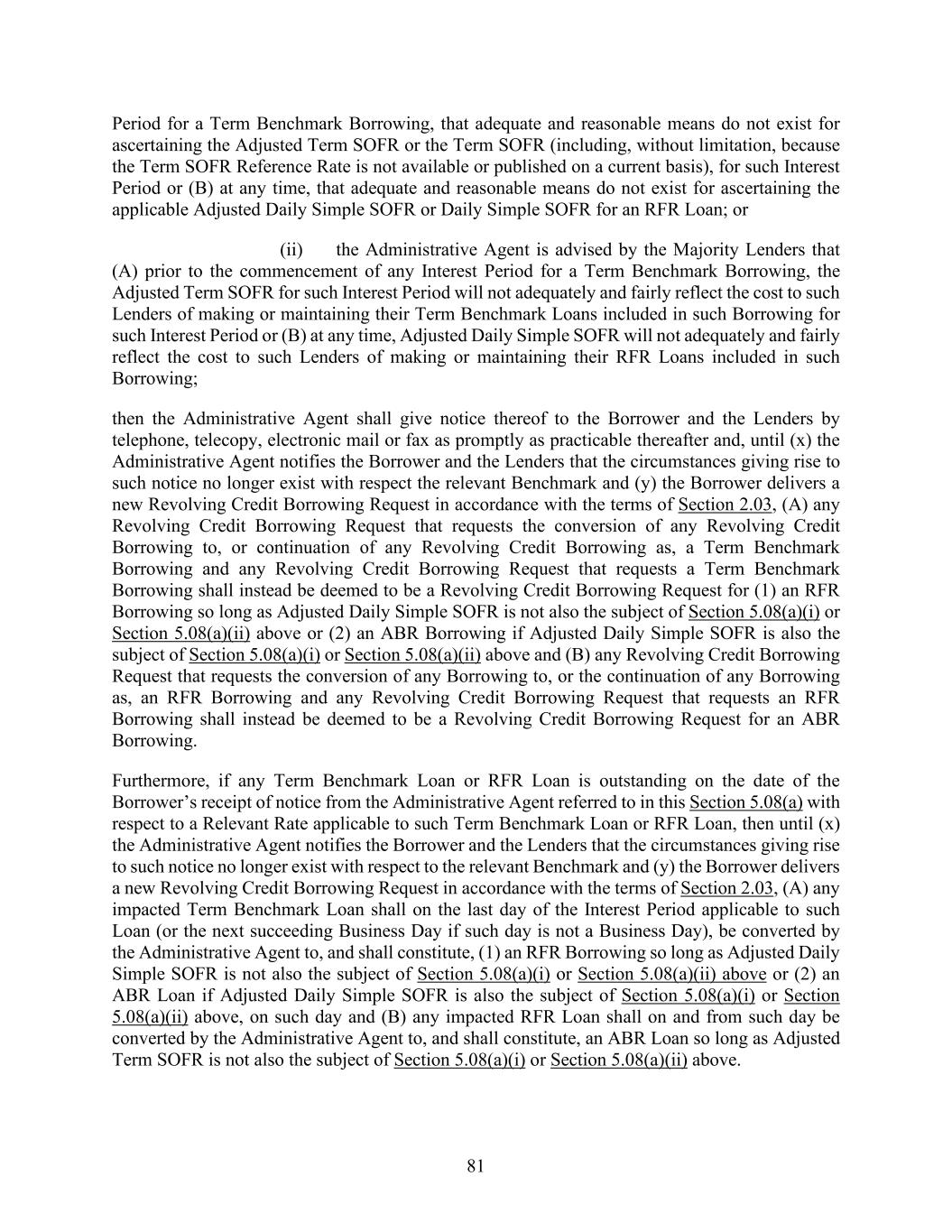 81 Period for a Term Benchmark Borrowing, that adequate and reasonable means do not exist for ascertaining the Adjusted Term SOFR or the Term SOFR (including, without limitation, because the Term SOFR Reference Rate is not available or published on a current basis), for such Interest Period or (B) at any time, that adequate and reasonable means do not exist for ascertaining the applicable Adjusted Daily Simple SOFR or Daily Simple SOFR for an RFR Loan; or (ii) the Administrative Agent is advised by the Majority Lenders that (A) prior to the commencement of any Interest Period for a Term Benchmark Borrowing, the Adjusted Term SOFR for such Interest Period will not adequately and fairly reflect the cost to such Lenders of making or maintaining their Term Benchmark Loans included in such Borrowing for such Interest Period or (B) at any time, Adjusted Daily Simple SOFR will not adequately and fairly reflect the cost to such Lenders of making or maintaining their RFR Loans included in such Borrowing; then the Administrative Agent shall give notice thereof to the Borrower and the Lenders by telephone, telecopy, electronic mail or fax as promptly as practicable thereafter and, until (x) the Administrative Agent notifies the Borrower and the Lenders that the circumstances giving rise to such notice no longer exist with respect the relevant Benchmark and (y) the Borrower delivers a new Revolving Credit Borrowing Request in accordance with the terms of Section 2.03, (A) any Revolving Credit Borrowing Request that requests the conversion of any Revolving Credit Borrowing to, or continuation of any Revolving Credit Borrowing as, a Term Benchmark Borrowing and any Revolving Credit Borrowing Request that requests a Term Benchmark Borrowing shall instead be deemed to be a Revolving Credit Borrowing Request for (1) an RFR Borrowing so long as Adjusted Daily Simple SOFR is not also the subject of Section 5.08(a)(i) or Section 5.08(a)(ii) above or (2) an ABR Borrowing if Adjusted Daily Simple SOFR is also the subject of Section 5.08(a)(i) or Section 5.08(a)(ii) above and (B) any Revolving Credit Borrowing Request that requests the conversion of any Borrowing to, or the continuation of any Borrowing as, an RFR Borrowing and any Revolving Credit Borrowing Request that requests an RFR Borrowing shall instead be deemed to be a Revolving Credit Borrowing Request for an ABR Borrowing. Furthermore, if any Term Benchmark Loan or RFR Loan is outstanding on the date of the Borrower’s receipt of notice from the Administrative Agent referred to in this Section 5.08(a) with respect to a Relevant Rate applicable to such Term Benchmark Loan or RFR Loan, then until (x) the Administrative Agent notifies the Borrower and the Lenders that the circumstances giving rise to such notice no longer exist with respect to the relevant Benchmark and (y) the Borrower delivers a new Revolving Credit Borrowing Request in accordance with the terms of Section 2.03, (A) any impacted Term Benchmark Loan shall on the last day of the Interest Period applicable to such Loan (or the next succeeding Business Day if such day is not a Business Day), be converted by the Administrative Agent to, and shall constitute, (1) an RFR Borrowing so long as Adjusted Daily Simple SOFR is not also the subject of Section 5.08(a)(i) or Section 5.08(a)(ii) above or (2) an ABR Loan if Adjusted Daily Simple SOFR is also the subject of Section 5.08(a)(i) or Section 5.08(a)(ii) above, on such day and (B) any impacted RFR Loan shall on and from such day be converted by the Administrative Agent to, and shall constitute, an ABR Loan so long as Adjusted Term SOFR is not also the subject of Section 5.08(a)(i) or Section 5.08(a)(ii) above.
