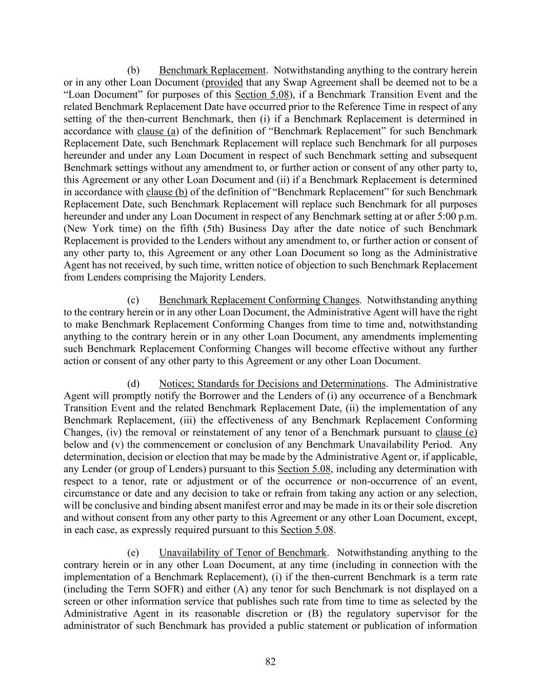 82 (b) Benchmark Replacement. Notwithstanding anything to the contrary herein or in any other Loan Document (provided that any Swap Agreement shall be deemed not to be a “Loan Document” for purposes of this Section 5.08), if a Benchmark Transition Event and the related Benchmark Replacement Date have occurred prior to the Reference Time in respect of any setting of the then-current Benchmark, then (i) if a Benchmark Replacement is determined in accordance with clause (a) of the definition of “Benchmark Replacement” for such Benchmark Replacement Date, such Benchmark Replacement will replace such Benchmark for all purposes hereunder and under any Loan Document in respect of such Benchmark setting and subsequent Benchmark settings without any amendment to, or further action or consent of any other party to, this Agreement or any other Loan Document and (ii) if a Benchmark Replacement is determined in accordance with clause (b) of the definition of “Benchmark Replacement” for such Benchmark Replacement Date, such Benchmark Replacement will replace such Benchmark for all purposes hereunder and under any Loan Document in respect of any Benchmark setting at or after 5:00 p.m. (New York time) on the fifth (5th) Business Day after the date notice of such Benchmark Replacement is provided to the Lenders without any amendment to, or further action or consent of any other party to, this Agreement or any other Loan Document so long as the Administrative Agent has not received, by such time, written notice of objection to such Benchmark Replacement from Lenders comprising the Majority Lenders. (c) Benchmark Replacement Conforming Changes. Notwithstanding anything to the contrary herein or in any other Loan Document, the Administrative Agent will have the right to make Benchmark Replacement Conforming Changes from time to time and, notwithstanding anything to the contrary herein or in any other Loan Document, any amendments implementing such Benchmark Replacement Conforming Changes will become effective without any further action or consent of any other party to this Agreement or any other Loan Document. (d) Notices; Standards for Decisions and Determinations. The Administrative Agent will promptly notify the Borrower and the Lenders of (i) any occurrence of a Benchmark Transition Event and the related Benchmark Replacement Date, (ii) the implementation of any Benchmark Replacement, (iii) the effectiveness of any Benchmark Replacement Conforming Changes, (iv) the removal or reinstatement of any tenor of a Benchmark pursuant to clause (e) below and (v) the commencement or conclusion of any Benchmark Unavailability Period. Any determination, decision or election that may be made by the Administrative Agent or, if applicable, any Lender (or group of Lenders) pursuant to this Section 5.08, including any determination with respect to a tenor, rate or adjustment or of the occurrence or non-occurrence of an event, circumstance or date and any decision to take or refrain from taking any action or any selection, will be conclusive and binding absent manifest error and may be made in its or their sole discretion and without consent from any other party to this Agreement or any other Loan Document, except, in each case, as expressly required pursuant to this Section 5.08. (e) Unavailability of Tenor of Benchmark. Notwithstanding anything to the contrary herein or in any other Loan Document, at any time (including in connection with the implementation of a Benchmark Replacement), (i) if the then-current Benchmark is a term rate (including the Term SOFR) and either (A) any tenor for such Benchmark is not displayed on a screen or other information service that publishes such rate from time to time as selected by the Administrative Agent in its reasonable discretion or (B) the regulatory supervisor for the administrator of such Benchmark has provided a public statement or publication of information