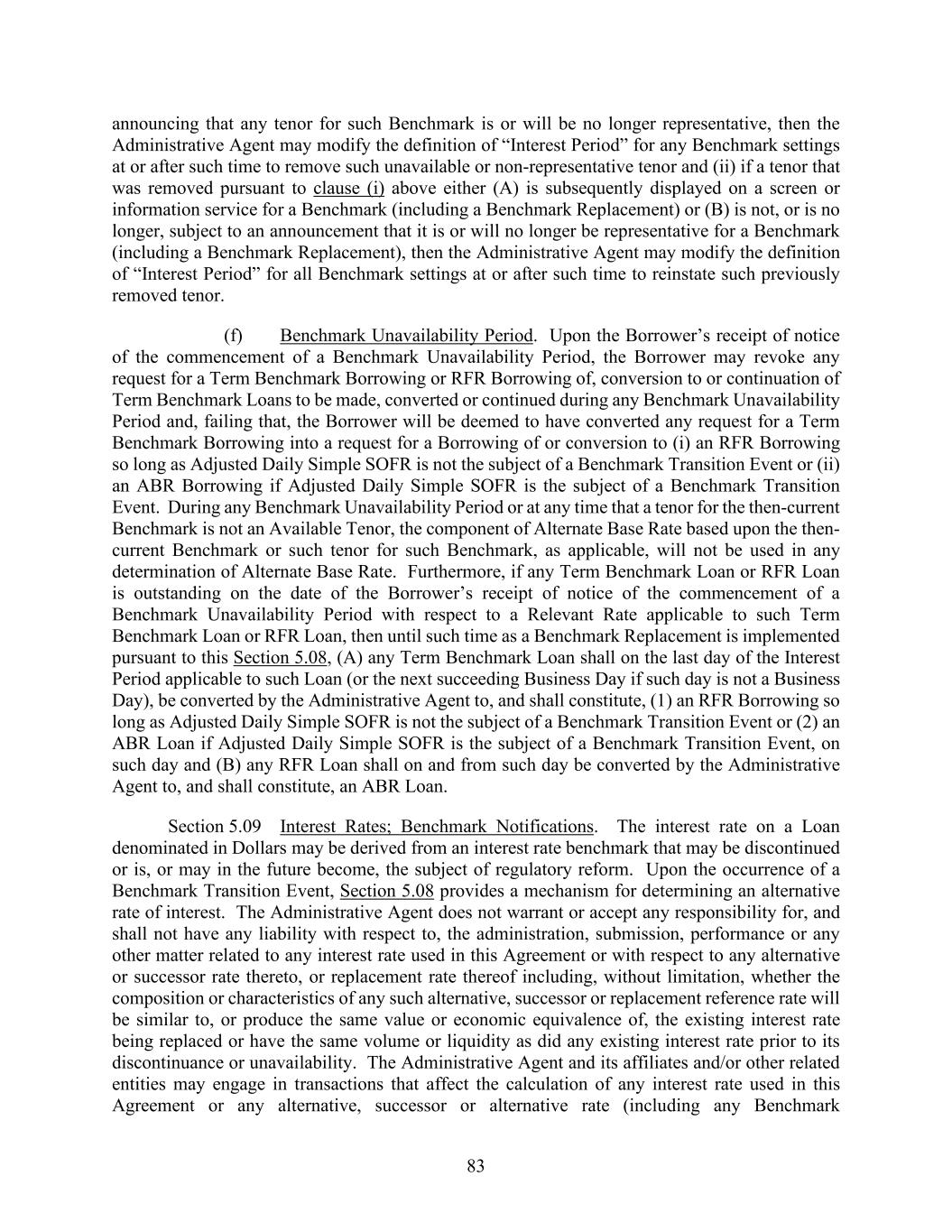 83 announcing that any tenor for such Benchmark is or will be no longer representative, then the Administrative Agent may modify the definition of “Interest Period” for any Benchmark settings at or after such time to remove such unavailable or non-representative tenor and (ii) if a tenor that was removed pursuant to clause (i) above either (A) is subsequently displayed on a screen or information service for a Benchmark (including a Benchmark Replacement) or (B) is not, or is no longer, subject to an announcement that it is or will no longer be representative for a Benchmark (including a Benchmark Replacement), then the Administrative Agent may modify the definition of “Interest Period” for all Benchmark settings at or after such time to reinstate such previously removed tenor. (f) Benchmark Unavailability Period. Upon the Borrower’s receipt of notice of the commencement of a Benchmark Unavailability Period, the Borrower may revoke any request for a Term Benchmark Borrowing or RFR Borrowing of, conversion to or continuation of Term Benchmark Loans to be made, converted or continued during any Benchmark Unavailability Period and, failing that, the Borrower will be deemed to have converted any request for a Term Benchmark Borrowing into a request for a Borrowing of or conversion to (i) an RFR Borrowing so long as Adjusted Daily Simple SOFR is not the subject of a Benchmark Transition Event or (ii) an ABR Borrowing if Adjusted Daily Simple SOFR is the subject of a Benchmark Transition Event. During any Benchmark Unavailability Period or at any time that a tenor for the then-current Benchmark is not an Available Tenor, the component of Alternate Base Rate based upon the then- current Benchmark or such tenor for such Benchmark, as applicable, will not be used in any determination of Alternate Base Rate. Furthermore, if any Term Benchmark Loan or RFR Loan is outstanding on the date of the Borrower’s receipt of notice of the commencement of a Benchmark Unavailability Period with respect to a Relevant Rate applicable to such Term Benchmark Loan or RFR Loan, then until such time as a Benchmark Replacement is implemented pursuant to this Section 5.08, (A) any Term Benchmark Loan shall on the last day of the Interest Period applicable to such Loan (or the next succeeding Business Day if such day is not a Business Day), be converted by the Administrative Agent to, and shall constitute, (1) an RFR Borrowing so long as Adjusted Daily Simple SOFR is not the subject of a Benchmark Transition Event or (2) an ABR Loan if Adjusted Daily Simple SOFR is the subject of a Benchmark Transition Event, on such day and (B) any RFR Loan shall on and from such day be converted by the Administrative Agent to, and shall constitute, an ABR Loan. Section 5.09 Interest Rates; Benchmark Notifications. The interest rate on a Loan denominated in Dollars may be derived from an interest rate benchmark that may be discontinued or is, or may in the future become, the subject of regulatory reform. Upon the occurrence of a Benchmark Transition Event, Section 5.08 provides a mechanism for determining an alternative rate of interest. The Administrative Agent does not warrant or accept any responsibility for, and shall not have any liability with respect to, the administration, submission, performance or any other matter related to any interest rate used in this Agreement or with respect to any alternative or successor rate thereto, or replacement rate thereof including, without limitation, whether the composition or characteristics of any such alternative, successor or replacement reference rate will be similar to, or produce the same value or economic equivalence of, the existing interest rate being replaced or have the same volume or liquidity as did any existing interest rate prior to its discontinuance or unavailability. The Administrative Agent and its affiliates and/or other related entities may engage in transactions that affect the calculation of any interest rate used in this Agreement or any alternative, successor or alternative rate (including any Benchmark
