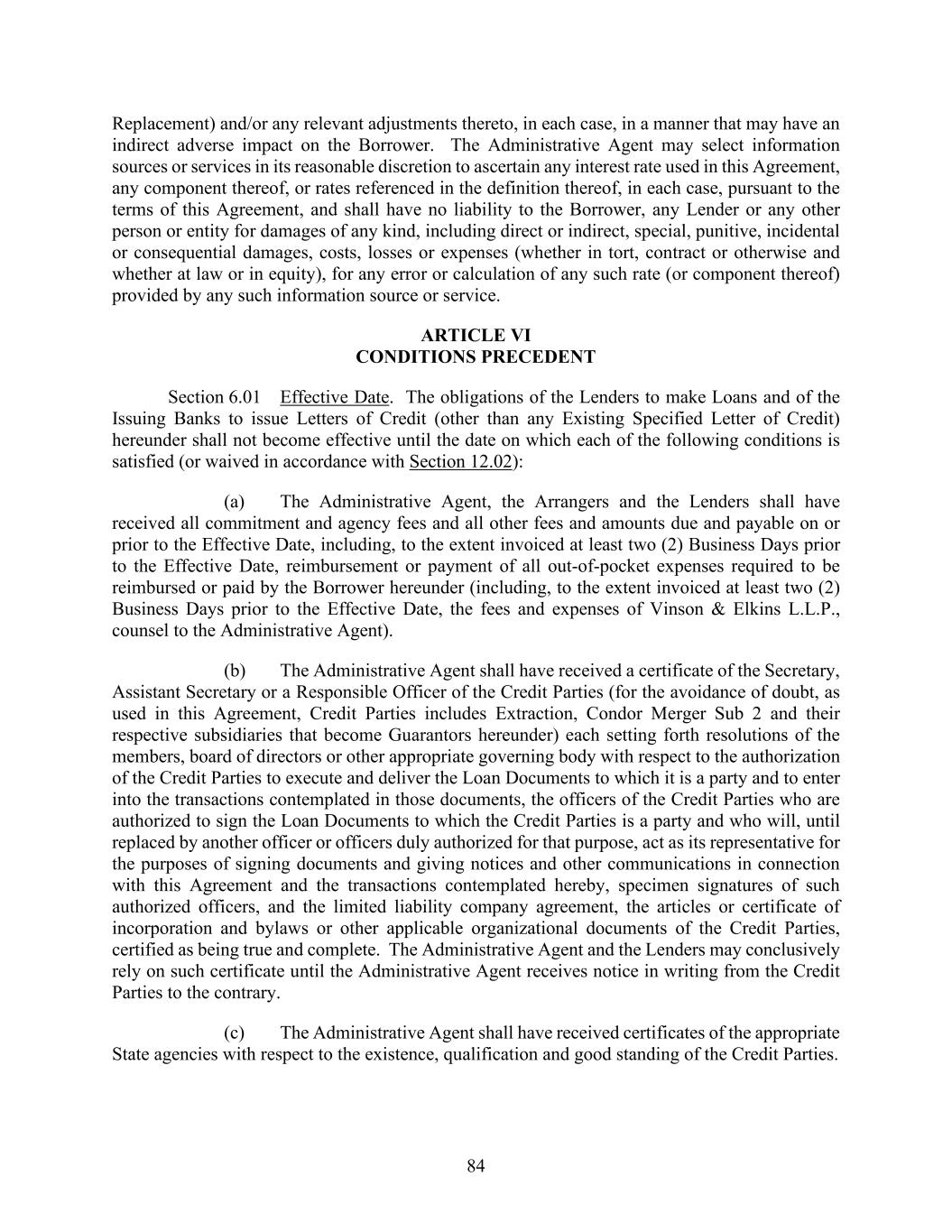 84 Replacement) and/or any relevant adjustments thereto, in each case, in a manner that may have an indirect adverse impact on the Borrower. The Administrative Agent may select information sources or services in its reasonable discretion to ascertain any interest rate used in this Agreement, any component thereof, or rates referenced in the definition thereof, in each case, pursuant to the terms of this Agreement, and shall have no liability to the Borrower, any Lender or any other person or entity for damages of any kind, including direct or indirect, special, punitive, incidental or consequential damages, costs, losses or expenses (whether in tort, contract or otherwise and whether at law or in equity), for any error or calculation of any such rate (or component thereof) provided by any such information source or service. ARTICLE VI CONDITIONS PRECEDENT Section 6.01 Effective Date. The obligations of the Lenders to make Loans and of the Issuing Banks to issue Letters of Credit (other than any Existing Specified Letter of Credit) hereunder shall not become effective until the date on which each of the following conditions is satisfied (or waived in accordance with Section 12.02): (a) The Administrative Agent, the Arrangers and the Lenders shall have received all commitment and agency fees and all other fees and amounts due and payable on or prior to the Effective Date, including, to the extent invoiced at least two (2) Business Days prior to the Effective Date, reimbursement or payment of all out-of-pocket expenses required to be reimbursed or paid by the Borrower hereunder (including, to the extent invoiced at least two (2) Business Days prior to the Effective Date, the fees and expenses of Vinson & Elkins L.L.P., counsel to the Administrative Agent). (b) The Administrative Agent shall have received a certificate of the Secretary, Assistant Secretary or a Responsible Officer of the Credit Parties (for the avoidance of doubt, as used in this Agreement, Credit Parties includes Extraction, Condor Merger Sub 2 and their respective subsidiaries that become Guarantors hereunder) each setting forth resolutions of the members, board of directors or other appropriate governing body with respect to the authorization of the Credit Parties to execute and deliver the Loan Documents to which it is a party and to enter into the transactions contemplated in those documents, the officers of the Credit Parties who are authorized to sign the Loan Documents to which the Credit Parties is a party and who will, until replaced by another officer or officers duly authorized for that purpose, act as its representative for the purposes of signing documents and giving notices and other communications in connection with this Agreement and the transactions contemplated hereby, specimen signatures of such authorized officers, and the limited liability company agreement, the articles or certificate of incorporation and bylaws or other applicable organizational documents of the Credit Parties, certified as being true and complete. The Administrative Agent and the Lenders may conclusively rely on such certificate until the Administrative Agent receives notice in writing from the Credit Parties to the contrary. (c) The Administrative Agent shall have received certificates of the appropriate State agencies with respect to the existence, qualification and good standing of the Credit Parties.