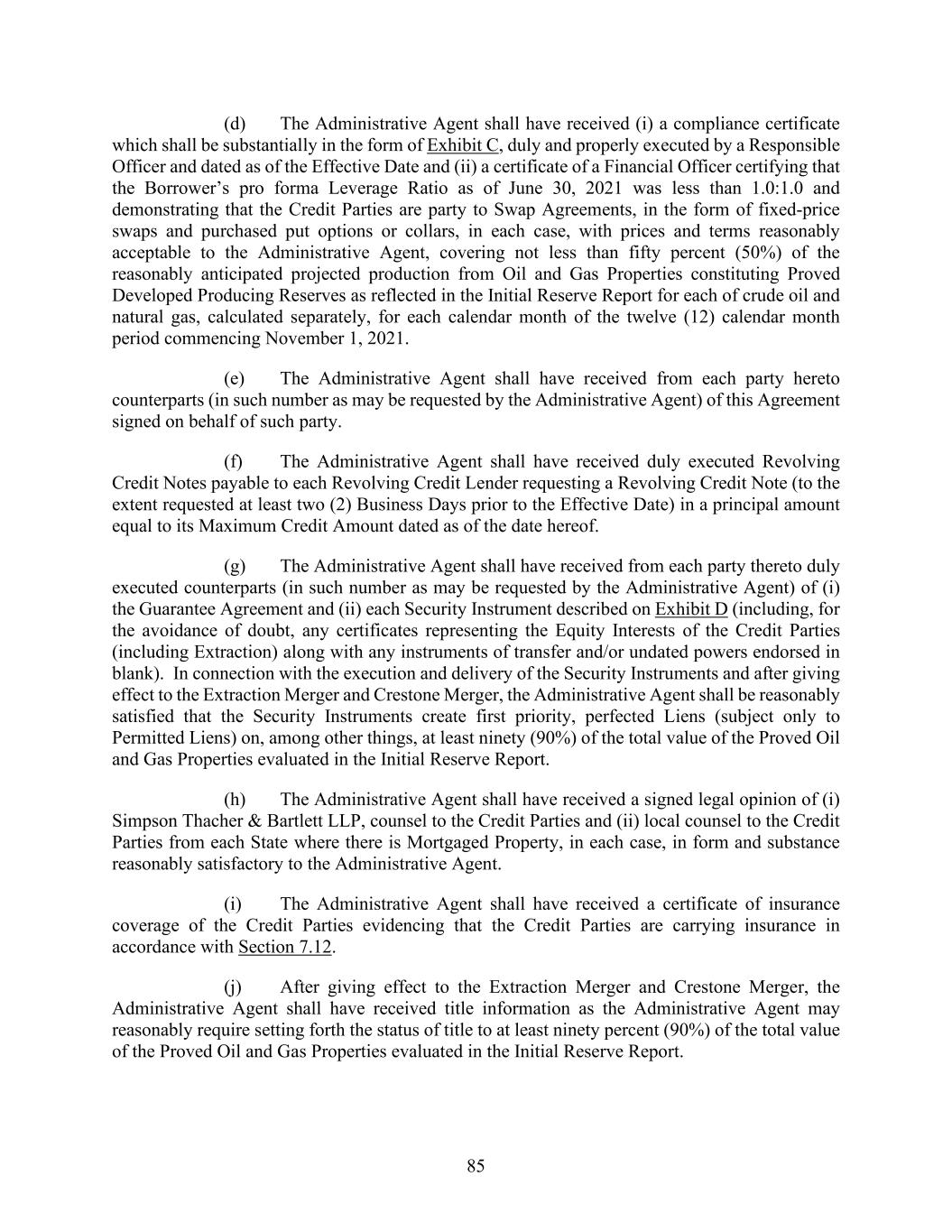 85 (d) The Administrative Agent shall have received (i) a compliance certificate which shall be substantially in the form of Exhibit C, duly and properly executed by a Responsible Officer and dated as of the Effective Date and (ii) a certificate of a Financial Officer certifying that the Borrower’s pro forma Leverage Ratio as of June 30, 2021 was less than 1.0:1.0 and demonstrating that the Credit Parties are party to Swap Agreements, in the form of fixed-price swaps and purchased put options or collars, in each case, with prices and terms reasonably acceptable to the Administrative Agent, covering not less than fifty percent (50%) of the reasonably anticipated projected production from Oil and Gas Properties constituting Proved Developed Producing Reserves as reflected in the Initial Reserve Report for each of crude oil and natural gas, calculated separately, for each calendar month of the twelve (12) calendar month period commencing November 1, 2021. (e) The Administrative Agent shall have received from each party hereto counterparts (in such number as may be requested by the Administrative Agent) of this Agreement signed on behalf of such party. (f) The Administrative Agent shall have received duly executed Revolving Credit Notes payable to each Revolving Credit Lender requesting a Revolving Credit Note (to the extent requested at least two (2) Business Days prior to the Effective Date) in a principal amount equal to its Maximum Credit Amount dated as of the date hereof. (g) The Administrative Agent shall have received from each party thereto duly executed counterparts (in such number as may be requested by the Administrative Agent) of (i) the Guarantee Agreement and (ii) each Security Instrument described on Exhibit D (including, for the avoidance of doubt, any certificates representing the Equity Interests of the Credit Parties (including Extraction) along with any instruments of transfer and/or undated powers endorsed in blank). In connection with the execution and delivery of the Security Instruments and after giving effect to the Extraction Merger and Crestone Merger, the Administrative Agent shall be reasonably satisfied that the Security Instruments create first priority, perfected Liens (subject only to Permitted Liens) on, among other things, at least ninety (90%) of the total value of the Proved Oil and Gas Properties evaluated in the Initial Reserve Report. (h) The Administrative Agent shall have received a signed legal opinion of (i) Simpson Thacher & Bartlett LLP, counsel to the Credit Parties and (ii) local counsel to the Credit Parties from each State where there is Mortgaged Property, in each case, in form and substance reasonably satisfactory to the Administrative Agent. (i) The Administrative Agent shall have received a certificate of insurance coverage of the Credit Parties evidencing that the Credit Parties are carrying insurance in accordance with Section 7.12. (j) After giving effect to the Extraction Merger and Crestone Merger, the Administrative Agent shall have received title information as the Administrative Agent may reasonably require setting forth the status of title to at least ninety percent (90%) of the total value of the Proved Oil and Gas Properties evaluated in the Initial Reserve Report.