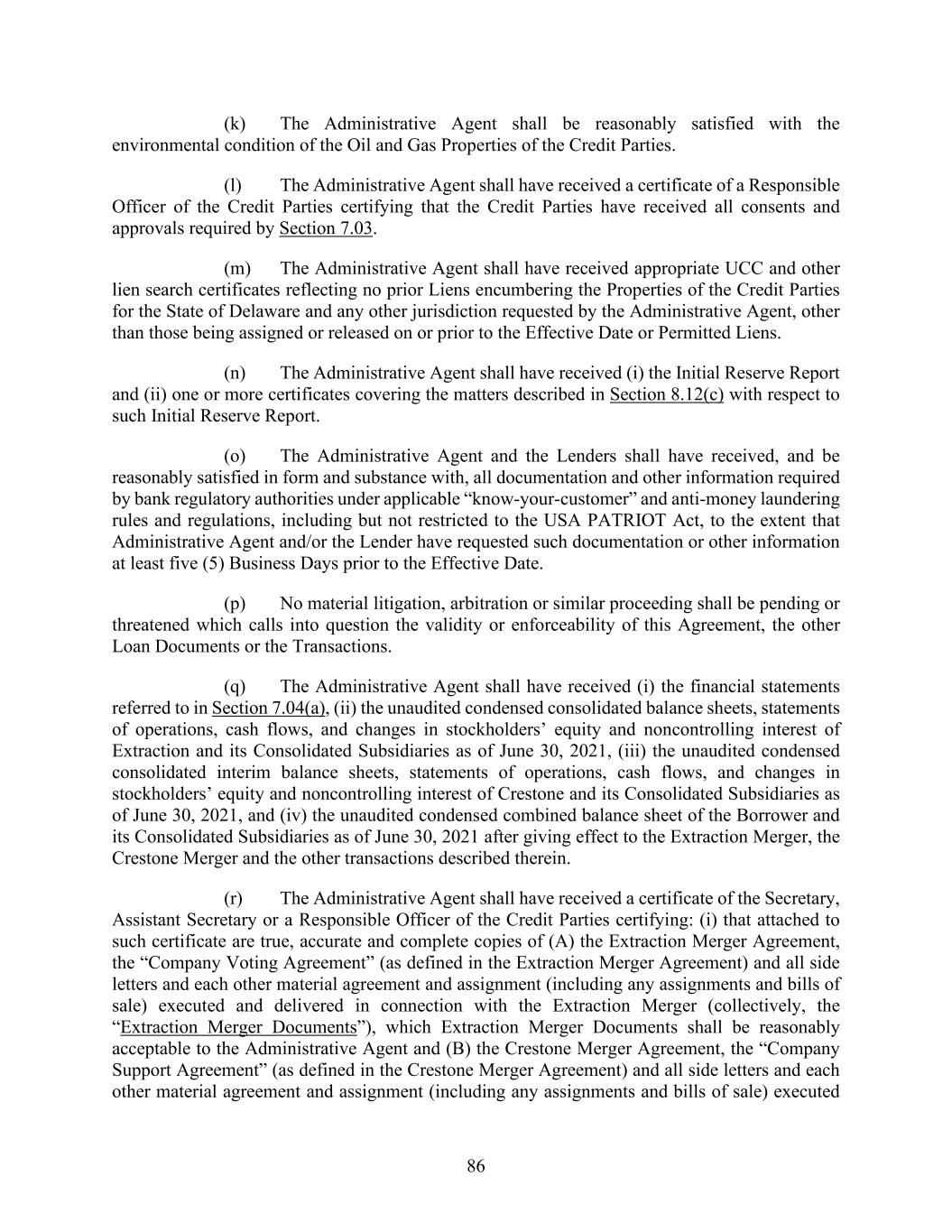 86 (k) The Administrative Agent shall be reasonably satisfied with the environmental condition of the Oil and Gas Properties of the Credit Parties. (l) The Administrative Agent shall have received a certificate of a Responsible Officer of the Credit Parties certifying that the Credit Parties have received all consents and approvals required by Section 7.03. (m) The Administrative Agent shall have received appropriate UCC and other lien search certificates reflecting no prior Liens encumbering the Properties of the Credit Parties for the State of Delaware and any other jurisdiction requested by the Administrative Agent, other than those being assigned or released on or prior to the Effective Date or Permitted Liens. (n) The Administrative Agent shall have received (i) the Initial Reserve Report and (ii) one or more certificates covering the matters described in Section 8.12(c) with respect to such Initial Reserve Report. (o) The Administrative Agent and the Lenders shall have received, and be reasonably satisfied in form and substance with, all documentation and other information required by bank regulatory authorities under applicable “know-your-customer” and anti-money laundering rules and regulations, including but not restricted to the USA PATRIOT Act, to the extent that Administrative Agent and/or the Lender have requested such documentation or other information at least five (5) Business Days prior to the Effective Date. (p) No material litigation, arbitration or similar proceeding shall be pending or threatened which calls into question the validity or enforceability of this Agreement, the other Loan Documents or the Transactions. (q) The Administrative Agent shall have received (i) the financial statements referred to in Section 7.04(a), (ii) the unaudited condensed consolidated balance sheets, statements of operations, cash flows, and changes in stockholders’ equity and noncontrolling interest of Extraction and its Consolidated Subsidiaries as of June 30, 2021, (iii) the unaudited condensed consolidated interim balance sheets, statements of operations, cash flows, and changes in stockholders’ equity and noncontrolling interest of Crestone and its Consolidated Subsidiaries as of June 30, 2021, and (iv) the unaudited condensed combined balance sheet of the Borrower and its Consolidated Subsidiaries as of June 30, 2021 after giving effect to the Extraction Merger, the Crestone Merger and the other transactions described therein. (r) The Administrative Agent shall have received a certificate of the Secretary, Assistant Secretary or a Responsible Officer of the Credit Parties certifying: (i) that attached to such certificate are true, accurate and complete copies of (A) the Extraction Merger Agreement, the “Company Voting Agreement” (as defined in the Extraction Merger Agreement) and all side letters and each other material agreement and assignment (including any assignments and bills of sale) executed and delivered in connection with the Extraction Merger (collectively, the “Extraction Merger Documents”), which Extraction Merger Documents shall be reasonably acceptable to the Administrative Agent and (B) the Crestone Merger Agreement, the “Company Support Agreement” (as defined in the Crestone Merger Agreement) and all side letters and each other material agreement and assignment (including any assignments and bills of sale) executed