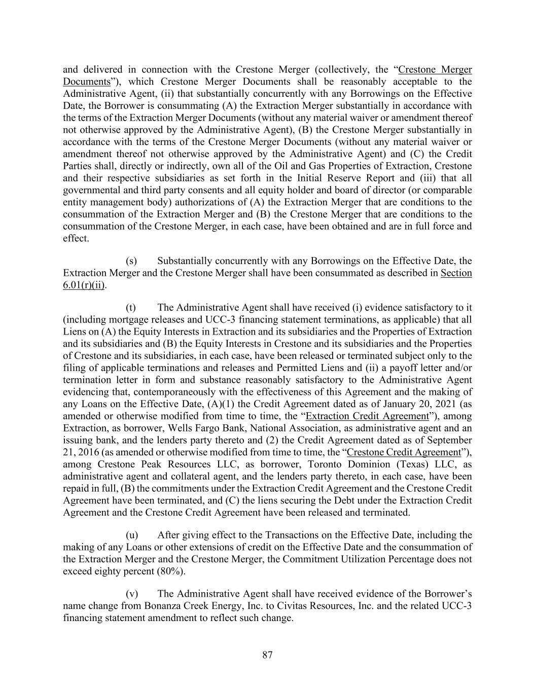 87 and delivered in connection with the Crestone Merger (collectively, the “Crestone Merger Documents”), which Crestone Merger Documents shall be reasonably acceptable to the Administrative Agent, (ii) that substantially concurrently with any Borrowings on the Effective Date, the Borrower is consummating (A) the Extraction Merger substantially in accordance with the terms of the Extraction Merger Documents (without any material waiver or amendment thereof not otherwise approved by the Administrative Agent), (B) the Crestone Merger substantially in accordance with the terms of the Crestone Merger Documents (without any material waiver or amendment thereof not otherwise approved by the Administrative Agent) and (C) the Credit Parties shall, directly or indirectly, own all of the Oil and Gas Properties of Extraction, Crestone and their respective subsidiaries as set forth in the Initial Reserve Report and (iii) that all governmental and third party consents and all equity holder and board of director (or comparable entity management body) authorizations of (A) the Extraction Merger that are conditions to the consummation of the Extraction Merger and (B) the Crestone Merger that are conditions to the consummation of the Crestone Merger, in each case, have been obtained and are in full force and effect. (s) Substantially concurrently with any Borrowings on the Effective Date, the Extraction Merger and the Crestone Merger shall have been consummated as described in Section 6.01(r)(ii). (t) The Administrative Agent shall have received (i) evidence satisfactory to it (including mortgage releases and UCC-3 financing statement terminations, as applicable) that all Liens on (A) the Equity Interests in Extraction and its subsidiaries and the Properties of Extraction and its subsidiaries and (B) the Equity Interests in Crestone and its subsidiaries and the Properties of Crestone and its subsidiaries, in each case, have been released or terminated subject only to the filing of applicable terminations and releases and Permitted Liens and (ii) a payoff letter and/or termination letter in form and substance reasonably satisfactory to the Administrative Agent evidencing that, contemporaneously with the effectiveness of this Agreement and the making of any Loans on the Effective Date, (A)(1) the Credit Agreement dated as of January 20, 2021 (as amended or otherwise modified from time to time, the “Extraction Credit Agreement”), among Extraction, as borrower, Wells Fargo Bank, National Association, as administrative agent and an issuing bank, and the lenders party thereto and (2) the Credit Agreement dated as of September 21, 2016 (as amended or otherwise modified from time to time, the “Crestone Credit Agreement”), among Crestone Peak Resources LLC, as borrower, Toronto Dominion (Texas) LLC, as administrative agent and collateral agent, and the lenders party thereto, in each case, have been repaid in full, (B) the commitments under the Extraction Credit Agreement and the Crestone Credit Agreement have been terminated, and (C) the liens securing the Debt under the Extraction Credit Agreement and the Crestone Credit Agreement have been released and terminated. (u) After giving effect to the Transactions on the Effective Date, including the making of any Loans or other extensions of credit on the Effective Date and the consummation of the Extraction Merger and the Crestone Merger, the Commitment Utilization Percentage does not exceed eighty percent (80%). (v) The Administrative Agent shall have received evidence of the Borrower’s name change from Bonanza Creek Energy, Inc. to Civitas Resources, Inc. and the related UCC-3 financing statement amendment to reflect such change.