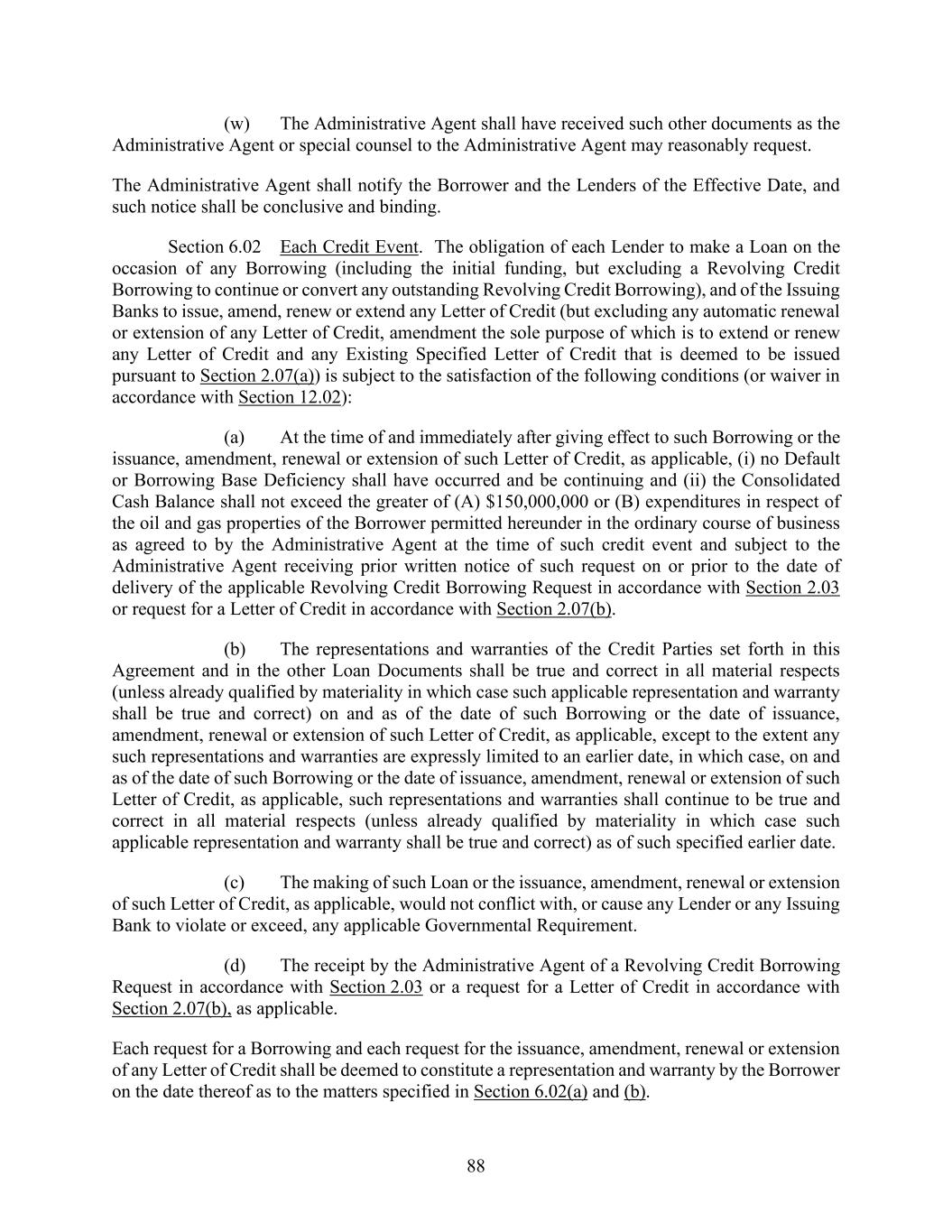 88 (w) The Administrative Agent shall have received such other documents as the Administrative Agent or special counsel to the Administrative Agent may reasonably request. The Administrative Agent shall notify the Borrower and the Lenders of the Effective Date, and such notice shall be conclusive and binding. Section 6.02 Each Credit Event. The obligation of each Lender to make a Loan on the occasion of any Borrowing (including the initial funding, but excluding a Revolving Credit Borrowing to continue or convert any outstanding Revolving Credit Borrowing), and of the Issuing Banks to issue, amend, renew or extend any Letter of Credit (but excluding any automatic renewal or extension of any Letter of Credit, amendment the sole purpose of which is to extend or renew any Letter of Credit and any Existing Specified Letter of Credit that is deemed to be issued pursuant to Section 2.07(a)) is subject to the satisfaction of the following conditions (or waiver in accordance with Section 12.02): (a) At the time of and immediately after giving effect to such Borrowing or the issuance, amendment, renewal or extension of such Letter of Credit, as applicable, (i) no Default or Borrowing Base Deficiency shall have occurred and be continuing and (ii) the Consolidated Cash Balance shall not exceed the greater of (A) $150,000,000 or (B) expenditures in respect of the oil and gas properties of the Borrower permitted hereunder in the ordinary course of business as agreed to by the Administrative Agent at the time of such credit event and subject to the Administrative Agent receiving prior written notice of such request on or prior to the date of delivery of the applicable Revolving Credit Borrowing Request in accordance with Section 2.03 or request for a Letter of Credit in accordance with Section 2.07(b). (b) The representations and warranties of the Credit Parties set forth in this Agreement and in the other Loan Documents shall be true and correct in all material respects (unless already qualified by materiality in which case such applicable representation and warranty shall be true and correct) on and as of the date of such Borrowing or the date of issuance, amendment, renewal or extension of such Letter of Credit, as applicable, except to the extent any such representations and warranties are expressly limited to an earlier date, in which case, on and as of the date of such Borrowing or the date of issuance, amendment, renewal or extension of such Letter of Credit, as applicable, such representations and warranties shall continue to be true and correct in all material respects (unless already qualified by materiality in which case such applicable representation and warranty shall be true and correct) as of such specified earlier date. (c) The making of such Loan or the issuance, amendment, renewal or extension of such Letter of Credit, as applicable, would not conflict with, or cause any Lender or any Issuing Bank to violate or exceed, any applicable Governmental Requirement. (d) The receipt by the Administrative Agent of a Revolving Credit Borrowing Request in accordance with Section 2.03 or a request for a Letter of Credit in accordance with Section 2.07(b), as applicable. Each request for a Borrowing and each request for the issuance, amendment, renewal or extension of any Letter of Credit shall be deemed to constitute a representation and warranty by the Borrower on the date thereof as to the matters specified in Section 6.02(a) and (b).