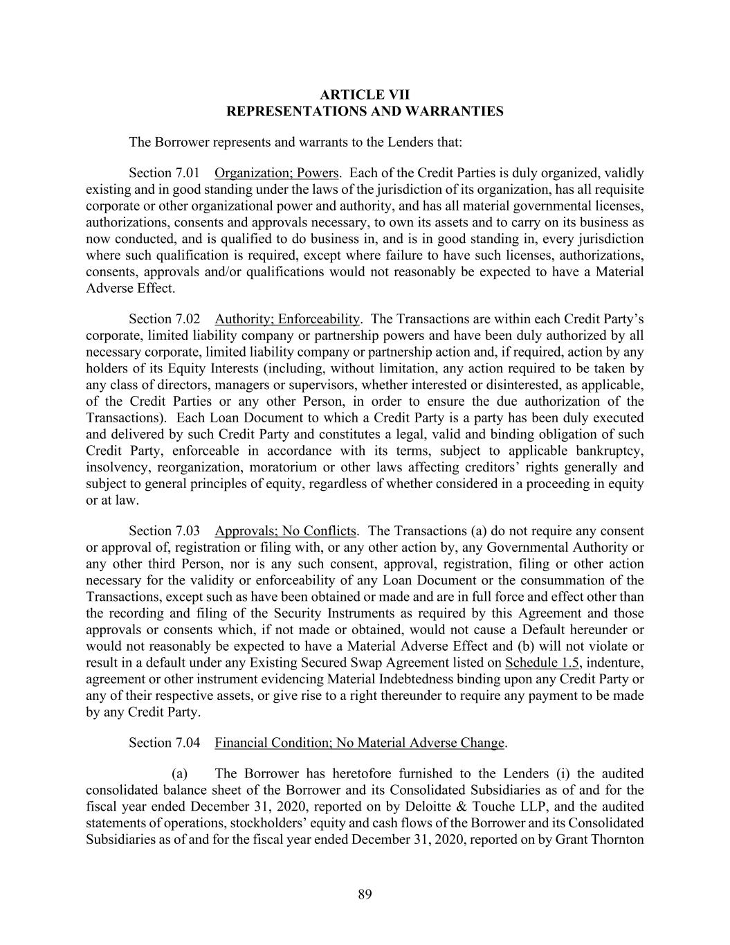 89 ARTICLE VII REPRESENTATIONS AND WARRANTIES The Borrower represents and warrants to the Lenders that: Section 7.01 Organization; Powers. Each of the Credit Parties is duly organized, validly existing and in good standing under the laws of the jurisdiction of its organization, has all requisite corporate or other organizational power and authority, and has all material governmental licenses, authorizations, consents and approvals necessary, to own its assets and to carry on its business as now conducted, and is qualified to do business in, and is in good standing in, every jurisdiction where such qualification is required, except where failure to have such licenses, authorizations, consents, approvals and/or qualifications would not reasonably be expected to have a Material Adverse Effect. Section 7.02 Authority; Enforceability. The Transactions are within each Credit Party’s corporate, limited liability company or partnership powers and have been duly authorized by all necessary corporate, limited liability company or partnership action and, if required, action by any holders of its Equity Interests (including, without limitation, any action required to be taken by any class of directors, managers or supervisors, whether interested or disinterested, as applicable, of the Credit Parties or any other Person, in order to ensure the due authorization of the Transactions). Each Loan Document to which a Credit Party is a party has been duly executed and delivered by such Credit Party and constitutes a legal, valid and binding obligation of such Credit Party, enforceable in accordance with its terms, subject to applicable bankruptcy, insolvency, reorganization, moratorium or other laws affecting creditors’ rights generally and subject to general principles of equity, regardless of whether considered in a proceeding in equity or at law. Section 7.03 Approvals; No Conflicts. The Transactions (a) do not require any consent or approval of, registration or filing with, or any other action by, any Governmental Authority or any other third Person, nor is any such consent, approval, registration, filing or other action necessary for the validity or enforceability of any Loan Document or the consummation of the Transactions, except such as have been obtained or made and are in full force and effect other than the recording and filing of the Security Instruments as required by this Agreement and those approvals or consents which, if not made or obtained, would not cause a Default hereunder or would not reasonably be expected to have a Material Adverse Effect and (b) will not violate or result in a default under any Existing Secured Swap Agreement listed on Schedule 1.5, indenture, agreement or other instrument evidencing Material Indebtedness binding upon any Credit Party or any of their respective assets, or give rise to a right thereunder to require any payment to be made by any Credit Party. Section 7.04 Financial Condition; No Material Adverse Change. (a) The Borrower has heretofore furnished to the Lenders (i) the audited consolidated balance sheet of the Borrower and its Consolidated Subsidiaries as of and for the fiscal year ended December 31, 2020, reported on by Deloitte & Touche LLP, and the audited statements of operations, stockholders’ equity and cash flows of the Borrower and its Consolidated Subsidiaries as of and for the fiscal year ended December 31, 2020, reported on by Grant Thornton