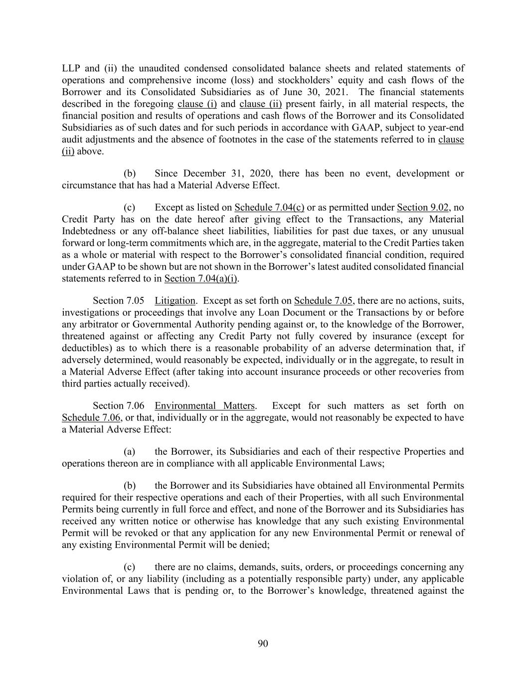 90 LLP and (ii) the unaudited condensed consolidated balance sheets and related statements of operations and comprehensive income (loss) and stockholders’ equity and cash flows of the Borrower and its Consolidated Subsidiaries as of June 30, 2021. The financial statements described in the foregoing clause (i) and clause (ii) present fairly, in all material respects, the financial position and results of operations and cash flows of the Borrower and its Consolidated Subsidiaries as of such dates and for such periods in accordance with GAAP, subject to year-end audit adjustments and the absence of footnotes in the case of the statements referred to in clause (ii) above. (b) Since December 31, 2020, there has been no event, development or circumstance that has had a Material Adverse Effect. (c) Except as listed on Schedule 7.04(c) or as permitted under Section 9.02, no Credit Party has on the date hereof after giving effect to the Transactions, any Material Indebtedness or any off-balance sheet liabilities, liabilities for past due taxes, or any unusual forward or long-term commitments which are, in the aggregate, material to the Credit Parties taken as a whole or material with respect to the Borrower’s consolidated financial condition, required under GAAP to be shown but are not shown in the Borrower’s latest audited consolidated financial statements referred to in Section 7.04(a)(i). Section 7.05 Litigation. Except as set forth on Schedule 7.05, there are no actions, suits, investigations or proceedings that involve any Loan Document or the Transactions by or before any arbitrator or Governmental Authority pending against or, to the knowledge of the Borrower, threatened against or affecting any Credit Party not fully covered by insurance (except for deductibles) as to which there is a reasonable probability of an adverse determination that, if adversely determined, would reasonably be expected, individually or in the aggregate, to result in a Material Adverse Effect (after taking into account insurance proceeds or other recoveries from third parties actually received). Section 7.06 Environmental Matters. Except for such matters as set forth on Schedule 7.06, or that, individually or in the aggregate, would not reasonably be expected to have a Material Adverse Effect: (a) the Borrower, its Subsidiaries and each of their respective Properties and operations thereon are in compliance with all applicable Environmental Laws; (b) the Borrower and its Subsidiaries have obtained all Environmental Permits required for their respective operations and each of their Properties, with all such Environmental Permits being currently in full force and effect, and none of the Borrower and its Subsidiaries has received any written notice or otherwise has knowledge that any such existing Environmental Permit will be revoked or that any application for any new Environmental Permit or renewal of any existing Environmental Permit will be denied; (c) there are no claims, demands, suits, orders, or proceedings concerning any violation of, or any liability (including as a potentially responsible party) under, any applicable Environmental Laws that is pending or, to the Borrower’s knowledge, threatened against the