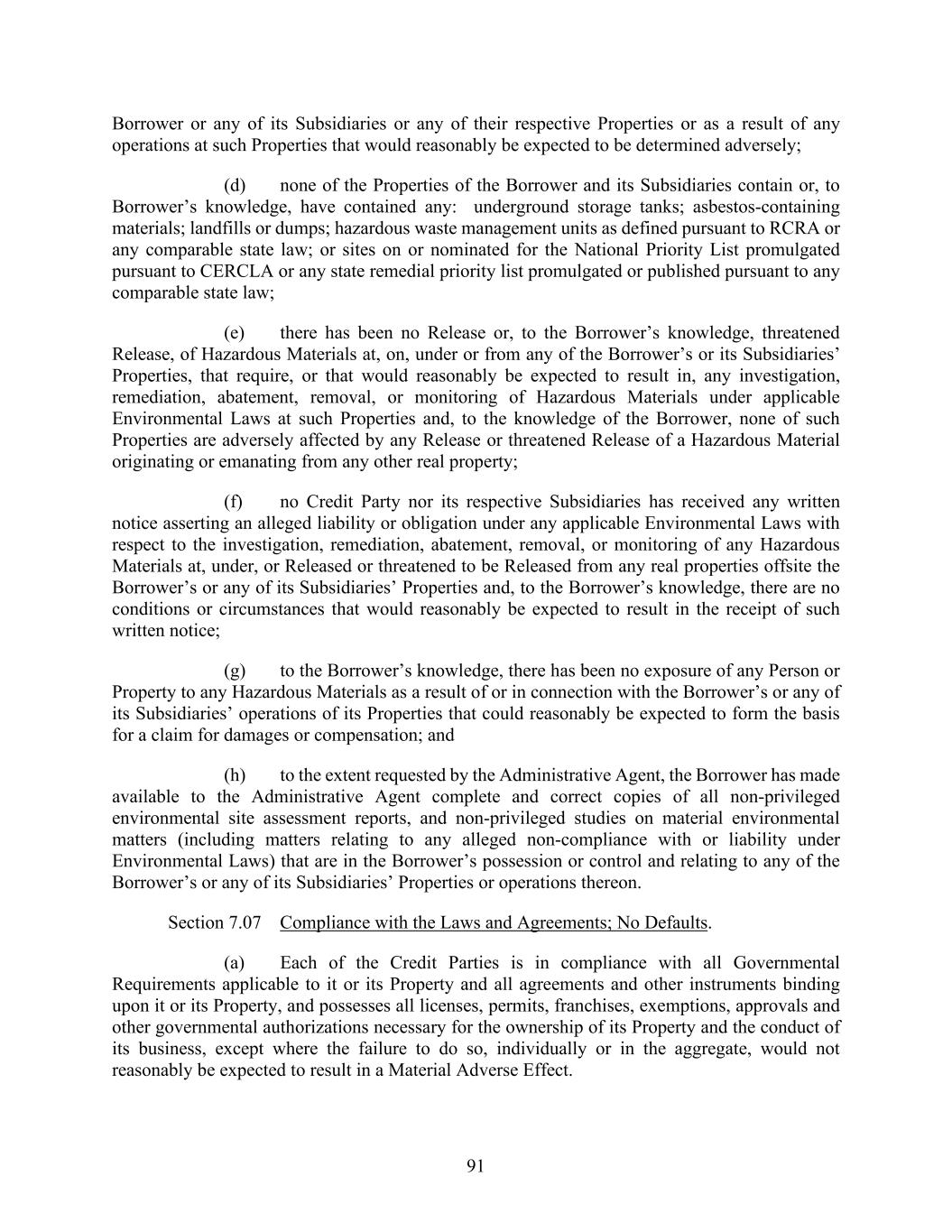 91 Borrower or any of its Subsidiaries or any of their respective Properties or as a result of any operations at such Properties that would reasonably be expected to be determined adversely; (d) none of the Properties of the Borrower and its Subsidiaries contain or, to Borrower’s knowledge, have contained any: underground storage tanks; asbestos-containing materials; landfills or dumps; hazardous waste management units as defined pursuant to RCRA or any comparable state law; or sites on or nominated for the National Priority List promulgated pursuant to CERCLA or any state remedial priority list promulgated or published pursuant to any comparable state law; (e) there has been no Release or, to the Borrower’s knowledge, threatened Release, of Hazardous Materials at, on, under or from any of the Borrower’s or its Subsidiaries’ Properties, that require, or that would reasonably be expected to result in, any investigation, remediation, abatement, removal, or monitoring of Hazardous Materials under applicable Environmental Laws at such Properties and, to the knowledge of the Borrower, none of such Properties are adversely affected by any Release or threatened Release of a Hazardous Material originating or emanating from any other real property; (f) no Credit Party nor its respective Subsidiaries has received any written notice asserting an alleged liability or obligation under any applicable Environmental Laws with respect to the investigation, remediation, abatement, removal, or monitoring of any Hazardous Materials at, under, or Released or threatened to be Released from any real properties offsite the Borrower’s or any of its Subsidiaries’ Properties and, to the Borrower’s knowledge, there are no conditions or circumstances that would reasonably be expected to result in the receipt of such written notice; (g) to the Borrower’s knowledge, there has been no exposure of any Person or Property to any Hazardous Materials as a result of or in connection with the Borrower’s or any of its Subsidiaries’ operations of its Properties that could reasonably be expected to form the basis for a claim for damages or compensation; and (h) to the extent requested by the Administrative Agent, the Borrower has made available to the Administrative Agent complete and correct copies of all non-privileged environmental site assessment reports, and non-privileged studies on material environmental matters (including matters relating to any alleged non-compliance with or liability under Environmental Laws) that are in the Borrower’s possession or control and relating to any of the Borrower’s or any of its Subsidiaries’ Properties or operations thereon. Section 7.07 Compliance with the Laws and Agreements; No Defaults. (a) Each of the Credit Parties is in compliance with all Governmental Requirements applicable to it or its Property and all agreements and other instruments binding upon it or its Property, and possesses all licenses, permits, franchises, exemptions, approvals and other governmental authorizations necessary for the ownership of its Property and the conduct of its business, except where the failure to do so, individually or in the aggregate, would not reasonably be expected to result in a Material Adverse Effect.