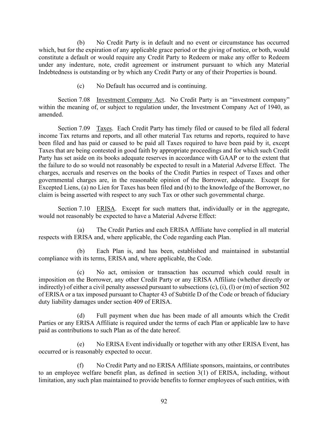 92 (b) No Credit Party is in default and no event or circumstance has occurred which, but for the expiration of any applicable grace period or the giving of notice, or both, would constitute a default or would require any Credit Party to Redeem or make any offer to Redeem under any indenture, note, credit agreement or instrument pursuant to which any Material Indebtedness is outstanding or by which any Credit Party or any of their Properties is bound. (c) No Default has occurred and is continuing. Section 7.08 Investment Company Act. No Credit Party is an “investment company” within the meaning of, or subject to regulation under, the Investment Company Act of 1940, as amended. Section 7.09 Taxes. Each Credit Party has timely filed or caused to be filed all federal income Tax returns and reports, and all other material Tax returns and reports, required to have been filed and has paid or caused to be paid all Taxes required to have been paid by it, except Taxes that are being contested in good faith by appropriate proceedings and for which such Credit Party has set aside on its books adequate reserves in accordance with GAAP or to the extent that the failure to do so would not reasonably be expected to result in a Material Adverse Effect. The charges, accruals and reserves on the books of the Credit Parties in respect of Taxes and other governmental charges are, in the reasonable opinion of the Borrower, adequate. Except for Excepted Liens, (a) no Lien for Taxes has been filed and (b) to the knowledge of the Borrower, no claim is being asserted with respect to any such Tax or other such governmental charge. Section 7.10 ERISA. Except for such matters that, individually or in the aggregate, would not reasonably be expected to have a Material Adverse Effect: (a) The Credit Parties and each ERISA Affiliate have complied in all material respects with ERISA and, where applicable, the Code regarding each Plan. (b) Each Plan is, and has been, established and maintained in substantial compliance with its terms, ERISA and, where applicable, the Code. (c) No act, omission or transaction has occurred which could result in imposition on the Borrower, any other Credit Party or any ERISA Affiliate (whether directly or indirectly) of either a civil penalty assessed pursuant to subsections (c), (i), (l) or (m) of section 502 of ERISA or a tax imposed pursuant to Chapter 43 of Subtitle D of the Code or breach of fiduciary duty liability damages under section 409 of ERISA. (d) Full payment when due has been made of all amounts which the Credit Parties or any ERISA Affiliate is required under the terms of each Plan or applicable law to have paid as contributions to such Plan as of the date hereof. (e) No ERISA Event individually or together with any other ERISA Event, has occurred or is reasonably expected to occur. (f) No Credit Party and no ERISA Affiliate sponsors, maintains, or contributes to an employee welfare benefit plan, as defined in section 3(1) of ERISA, including, without limitation, any such plan maintained to provide benefits to former employees of such entities, with