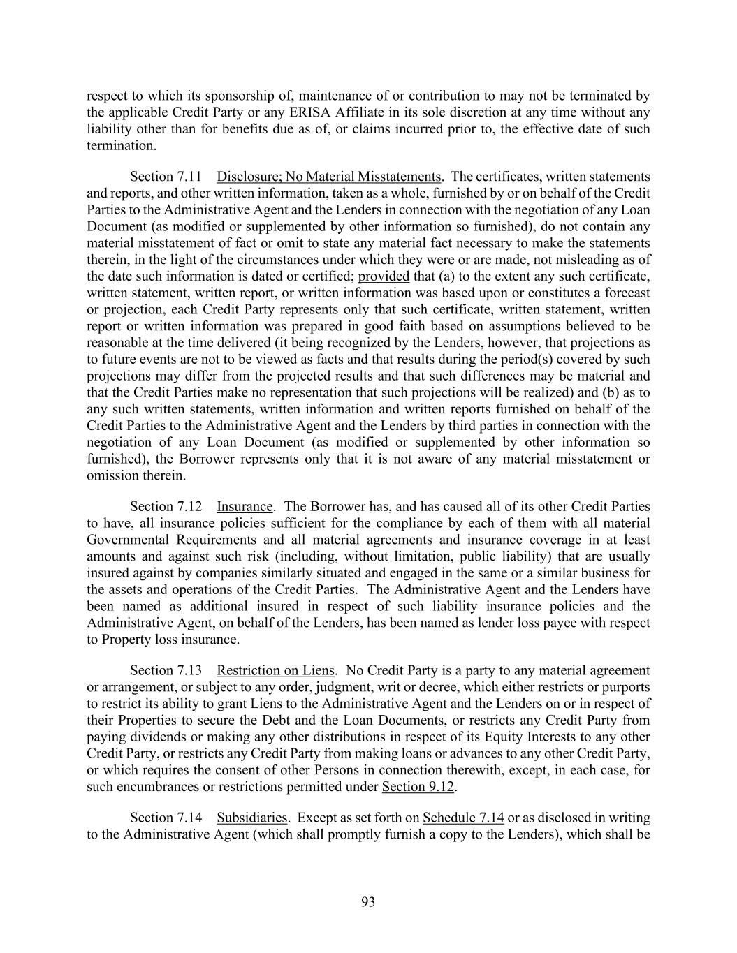 93 respect to which its sponsorship of, maintenance of or contribution to may not be terminated by the applicable Credit Party or any ERISA Affiliate in its sole discretion at any time without any liability other than for benefits due as of, or claims incurred prior to, the effective date of such termination. Section 7.11 Disclosure; No Material Misstatements. The certificates, written statements and reports, and other written information, taken as a whole, furnished by or on behalf of the Credit Parties to the Administrative Agent and the Lenders in connection with the negotiation of any Loan Document (as modified or supplemented by other information so furnished), do not contain any material misstatement of fact or omit to state any material fact necessary to make the statements therein, in the light of the circumstances under which they were or are made, not misleading as of the date such information is dated or certified; provided that (a) to the extent any such certificate, written statement, written report, or written information was based upon or constitutes a forecast or projection, each Credit Party represents only that such certificate, written statement, written report or written information was prepared in good faith based on assumptions believed to be reasonable at the time delivered (it being recognized by the Lenders, however, that projections as to future events are not to be viewed as facts and that results during the period(s) covered by such projections may differ from the projected results and that such differences may be material and that the Credit Parties make no representation that such projections will be realized) and (b) as to any such written statements, written information and written reports furnished on behalf of the Credit Parties to the Administrative Agent and the Lenders by third parties in connection with the negotiation of any Loan Document (as modified or supplemented by other information so furnished), the Borrower represents only that it is not aware of any material misstatement or omission therein. Section 7.12 Insurance. The Borrower has, and has caused all of its other Credit Parties to have, all insurance policies sufficient for the compliance by each of them with all material Governmental Requirements and all material agreements and insurance coverage in at least amounts and against such risk (including, without limitation, public liability) that are usually insured against by companies similarly situated and engaged in the same or a similar business for the assets and operations of the Credit Parties. The Administrative Agent and the Lenders have been named as additional insured in respect of such liability insurance policies and the Administrative Agent, on behalf of the Lenders, has been named as lender loss payee with respect to Property loss insurance. Section 7.13 Restriction on Liens. No Credit Party is a party to any material agreement or arrangement, or subject to any order, judgment, writ or decree, which either restricts or purports to restrict its ability to grant Liens to the Administrative Agent and the Lenders on or in respect of their Properties to secure the Debt and the Loan Documents, or restricts any Credit Party from paying dividends or making any other distributions in respect of its Equity Interests to any other Credit Party, or restricts any Credit Party from making loans or advances to any other Credit Party, or which requires the consent of other Persons in connection therewith, except, in each case, for such encumbrances or restrictions permitted under Section 9.12. Section 7.14 Subsidiaries. Except as set forth on Schedule 7.14 or as disclosed in writing to the Administrative Agent (which shall promptly furnish a copy to the Lenders), which shall be