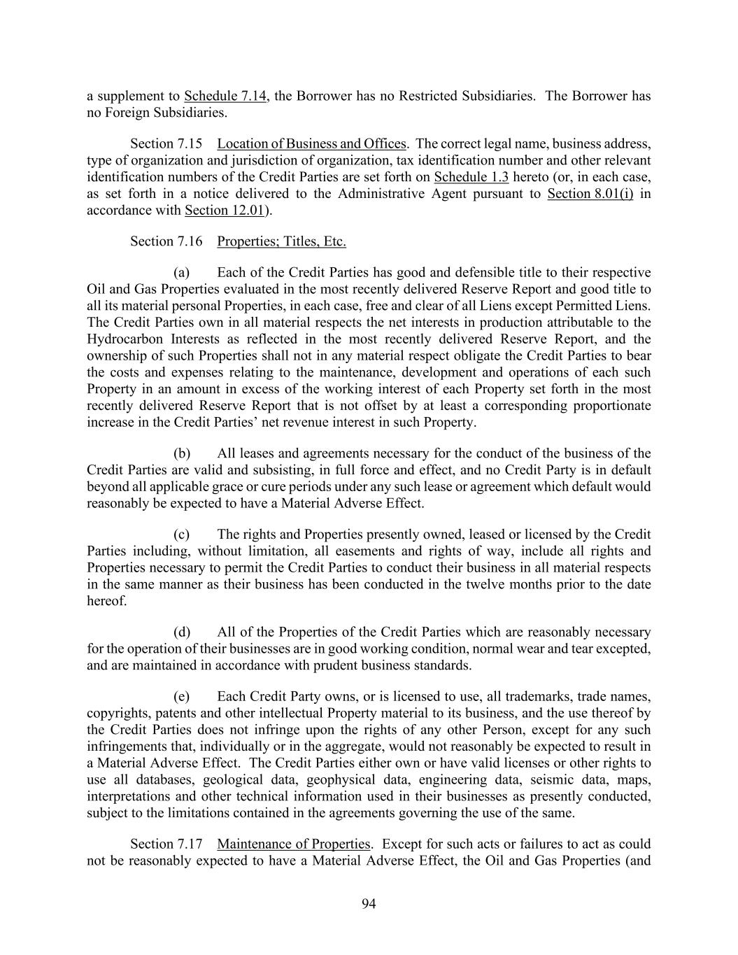 94 a supplement to Schedule 7.14, the Borrower has no Restricted Subsidiaries. The Borrower has no Foreign Subsidiaries. Section 7.15 Location of Business and Offices. The correct legal name, business address, type of organization and jurisdiction of organization, tax identification number and other relevant identification numbers of the Credit Parties are set forth on Schedule 1.3 hereto (or, in each case, as set forth in a notice delivered to the Administrative Agent pursuant to Section 8.01(i) in accordance with Section 12.01). Section 7.16 Properties; Titles, Etc. (a) Each of the Credit Parties has good and defensible title to their respective Oil and Gas Properties evaluated in the most recently delivered Reserve Report and good title to all its material personal Properties, in each case, free and clear of all Liens except Permitted Liens. The Credit Parties own in all material respects the net interests in production attributable to the Hydrocarbon Interests as reflected in the most recently delivered Reserve Report, and the ownership of such Properties shall not in any material respect obligate the Credit Parties to bear the costs and expenses relating to the maintenance, development and operations of each such Property in an amount in excess of the working interest of each Property set forth in the most recently delivered Reserve Report that is not offset by at least a corresponding proportionate increase in the Credit Parties’ net revenue interest in such Property. (b) All leases and agreements necessary for the conduct of the business of the Credit Parties are valid and subsisting, in full force and effect, and no Credit Party is in default beyond all applicable grace or cure periods under any such lease or agreement which default would reasonably be expected to have a Material Adverse Effect. (c) The rights and Properties presently owned, leased or licensed by the Credit Parties including, without limitation, all easements and rights of way, include all rights and Properties necessary to permit the Credit Parties to conduct their business in all material respects in the same manner as their business has been conducted in the twelve months prior to the date hereof. (d) All of the Properties of the Credit Parties which are reasonably necessary for the operation of their businesses are in good working condition, normal wear and tear excepted, and are maintained in accordance with prudent business standards. (e) Each Credit Party owns, or is licensed to use, all trademarks, trade names, copyrights, patents and other intellectual Property material to its business, and the use thereof by the Credit Parties does not infringe upon the rights of any other Person, except for any such infringements that, individually or in the aggregate, would not reasonably be expected to result in a Material Adverse Effect. The Credit Parties either own or have valid licenses or other rights to use all databases, geological data, geophysical data, engineering data, seismic data, maps, interpretations and other technical information used in their businesses as presently conducted, subject to the limitations contained in the agreements governing the use of the same. Section 7.17 Maintenance of Properties. Except for such acts or failures to act as could not be reasonably expected to have a Material Adverse Effect, the Oil and Gas Properties (and