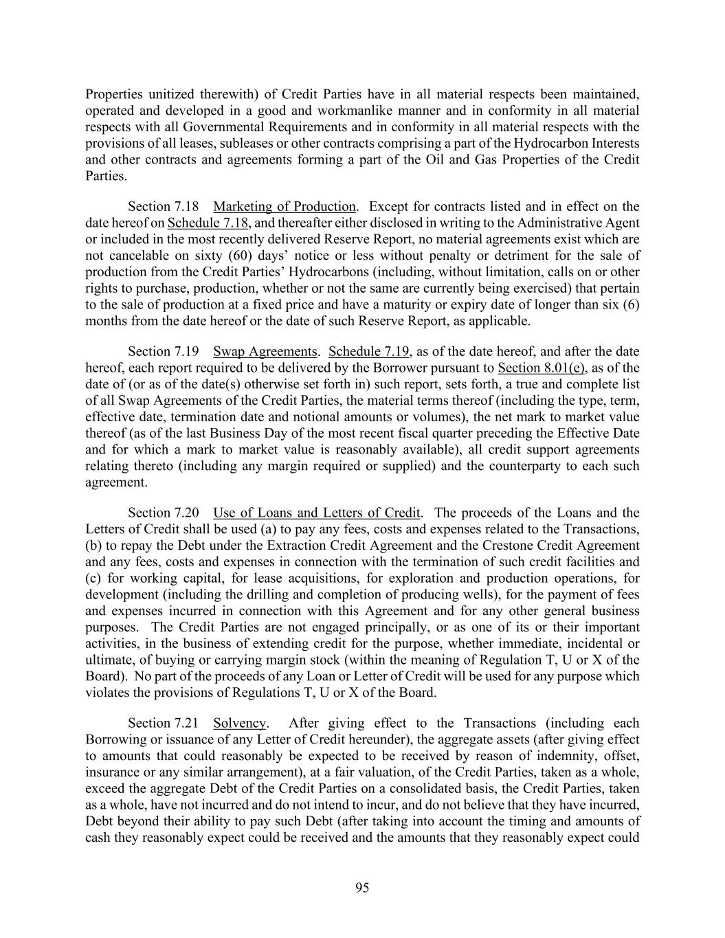 95 Properties unitized therewith) of Credit Parties have in all material respects been maintained, operated and developed in a good and workmanlike manner and in conformity in all material respects with all Governmental Requirements and in conformity in all material respects with the provisions of all leases, subleases or other contracts comprising a part of the Hydrocarbon Interests and other contracts and agreements forming a part of the Oil and Gas Properties of the Credit Parties. Section 7.18 Marketing of Production. Except for contracts listed and in effect on the date hereof on Schedule 7.18, and thereafter either disclosed in writing to the Administrative Agent or included in the most recently delivered Reserve Report, no material agreements exist which are not cancelable on sixty (60) days’ notice or less without penalty or detriment for the sale of production from the Credit Parties’ Hydrocarbons (including, without limitation, calls on or other rights to purchase, production, whether or not the same are currently being exercised) that pertain to the sale of production at a fixed price and have a maturity or expiry date of longer than six (6) months from the date hereof or the date of such Reserve Report, as applicable. Section 7.19 Swap Agreements. Schedule 7.19, as of the date hereof, and after the date hereof, each report required to be delivered by the Borrower pursuant to Section 8.01(e), as of the date of (or as of the date(s) otherwise set forth in) such report, sets forth, a true and complete list of all Swap Agreements of the Credit Parties, the material terms thereof (including the type, term, effective date, termination date and notional amounts or volumes), the net mark to market value thereof (as of the last Business Day of the most recent fiscal quarter preceding the Effective Date and for which a mark to market value is reasonably available), all credit support agreements relating thereto (including any margin required or supplied) and the counterparty to each such agreement. Section 7.20 Use of Loans and Letters of Credit. The proceeds of the Loans and the Letters of Credit shall be used (a) to pay any fees, costs and expenses related to the Transactions, (b) to repay the Debt under the Extraction Credit Agreement and the Crestone Credit Agreement and any fees, costs and expenses in connection with the termination of such credit facilities and (c) for working capital, for lease acquisitions, for exploration and production operations, for development (including the drilling and completion of producing wells), for the payment of fees and expenses incurred in connection with this Agreement and for any other general business purposes. The Credit Parties are not engaged principally, or as one of its or their important activities, in the business of extending credit for the purpose, whether immediate, incidental or ultimate, of buying or carrying margin stock (within the meaning of Regulation T, U or X of the Board). No part of the proceeds of any Loan or Letter of Credit will be used for any purpose which violates the provisions of Regulations T, U or X of the Board. Section 7.21 Solvency. After giving effect to the Transactions (including each Borrowing or issuance of any Letter of Credit hereunder), the aggregate assets (after giving effect to amounts that could reasonably be expected to be received by reason of indemnity, offset, insurance or any similar arrangement), at a fair valuation, of the Credit Parties, taken as a whole, exceed the aggregate Debt of the Credit Parties on a consolidated basis, the Credit Parties, taken as a whole, have not incurred and do not intend to incur, and do not believe that they have incurred, Debt beyond their ability to pay such Debt (after taking into account the timing and amounts of cash they reasonably expect could be received and the amounts that they reasonably expect could