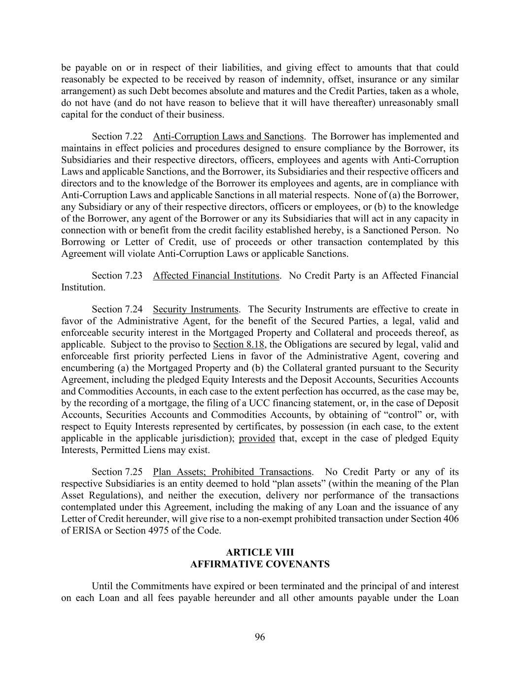 96 be payable on or in respect of their liabilities, and giving effect to amounts that that could reasonably be expected to be received by reason of indemnity, offset, insurance or any similar arrangement) as such Debt becomes absolute and matures and the Credit Parties, taken as a whole, do not have (and do not have reason to believe that it will have thereafter) unreasonably small capital for the conduct of their business. Section 7.22 Anti-Corruption Laws and Sanctions. The Borrower has implemented and maintains in effect policies and procedures designed to ensure compliance by the Borrower, its Subsidiaries and their respective directors, officers, employees and agents with Anti-Corruption Laws and applicable Sanctions, and the Borrower, its Subsidiaries and their respective officers and directors and to the knowledge of the Borrower its employees and agents, are in compliance with Anti-Corruption Laws and applicable Sanctions in all material respects. None of (a) the Borrower, any Subsidiary or any of their respective directors, officers or employees, or (b) to the knowledge of the Borrower, any agent of the Borrower or any its Subsidiaries that will act in any capacity in connection with or benefit from the credit facility established hereby, is a Sanctioned Person. No Borrowing or Letter of Credit, use of proceeds or other transaction contemplated by this Agreement will violate Anti-Corruption Laws or applicable Sanctions. Section 7.23 Affected Financial Institutions. No Credit Party is an Affected Financial Institution. Section 7.24 Security Instruments. The Security Instruments are effective to create in favor of the Administrative Agent, for the benefit of the Secured Parties, a legal, valid and enforceable security interest in the Mortgaged Property and Collateral and proceeds thereof, as applicable. Subject to the proviso to Section 8.18, the Obligations are secured by legal, valid and enforceable first priority perfected Liens in favor of the Administrative Agent, covering and encumbering (a) the Mortgaged Property and (b) the Collateral granted pursuant to the Security Agreement, including the pledged Equity Interests and the Deposit Accounts, Securities Accounts and Commodities Accounts, in each case to the extent perfection has occurred, as the case may be, by the recording of a mortgage, the filing of a UCC financing statement, or, in the case of Deposit Accounts, Securities Accounts and Commodities Accounts, by obtaining of “control” or, with respect to Equity Interests represented by certificates, by possession (in each case, to the extent applicable in the applicable jurisdiction); provided that, except in the case of pledged Equity Interests, Permitted Liens may exist. Section 7.25 Plan Assets; Prohibited Transactions. No Credit Party or any of its respective Subsidiaries is an entity deemed to hold “plan assets” (within the meaning of the Plan Asset Regulations), and neither the execution, delivery nor performance of the transactions contemplated under this Agreement, including the making of any Loan and the issuance of any Letter of Credit hereunder, will give rise to a non-exempt prohibited transaction under Section 406 of ERISA or Section 4975 of the Code. ARTICLE VIII AFFIRMATIVE COVENANTS Until the Commitments have expired or been terminated and the principal of and interest on each Loan and all fees payable hereunder and all other amounts payable under the Loan