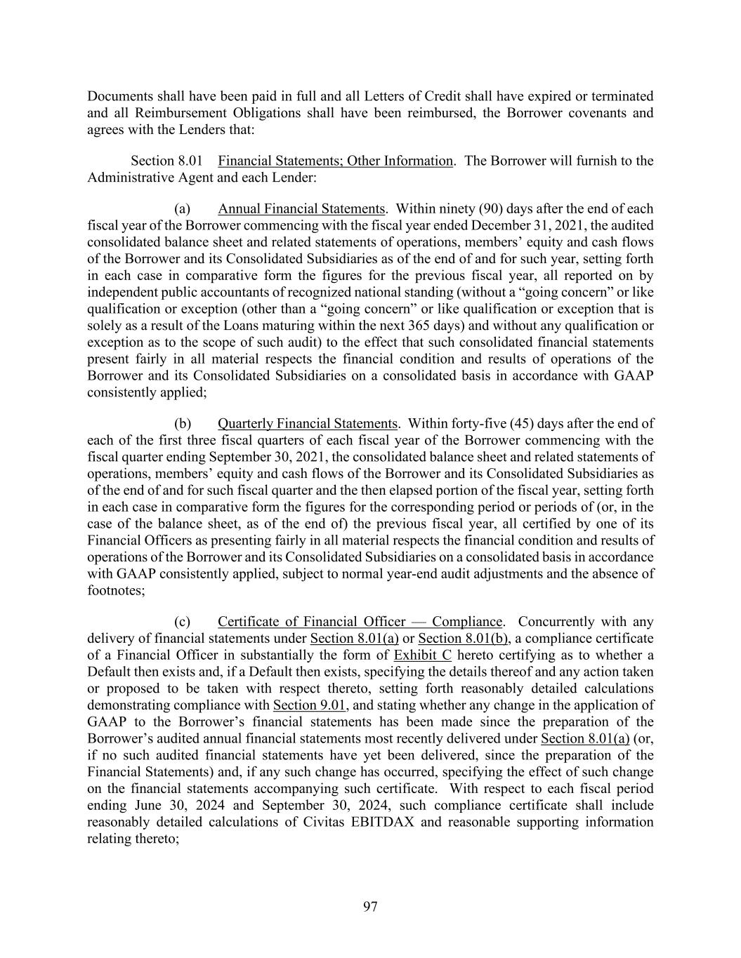 97 Documents shall have been paid in full and all Letters of Credit shall have expired or terminated and all Reimbursement Obligations shall have been reimbursed, the Borrower covenants and agrees with the Lenders that: Section 8.01 Financial Statements; Other Information. The Borrower will furnish to the Administrative Agent and each Lender: (a) Annual Financial Statements. Within ninety (90) days after the end of each fiscal year of the Borrower commencing with the fiscal year ended December 31, 2021, the audited consolidated balance sheet and related statements of operations, members’ equity and cash flows of the Borrower and its Consolidated Subsidiaries as of the end of and for such year, setting forth in each case in comparative form the figures for the previous fiscal year, all reported on by independent public accountants of recognized national standing (without a “going concern” or like qualification or exception (other than a “going concern” or like qualification or exception that is solely as a result of the Loans maturing within the next 365 days) and without any qualification or exception as to the scope of such audit) to the effect that such consolidated financial statements present fairly in all material respects the financial condition and results of operations of the Borrower and its Consolidated Subsidiaries on a consolidated basis in accordance with GAAP consistently applied; (b) Quarterly Financial Statements. Within forty-five (45) days after the end of each of the first three fiscal quarters of each fiscal year of the Borrower commencing with the fiscal quarter ending September 30, 2021, the consolidated balance sheet and related statements of operations, members’ equity and cash flows of the Borrower and its Consolidated Subsidiaries as of the end of and for such fiscal quarter and the then elapsed portion of the fiscal year, setting forth in each case in comparative form the figures for the corresponding period or periods of (or, in the case of the balance sheet, as of the end of) the previous fiscal year, all certified by one of its Financial Officers as presenting fairly in all material respects the financial condition and results of operations of the Borrower and its Consolidated Subsidiaries on a consolidated basis in accordance with GAAP consistently applied, subject to normal year-end audit adjustments and the absence of footnotes; (c) Certificate of Financial Officer — Compliance. Concurrently with any delivery of financial statements under Section 8.01(a) or Section 8.01(b), a compliance certificate of a Financial Officer in substantially the form of Exhibit C hereto certifying as to whether a Default then exists and, if a Default then exists, specifying the details thereof and any action taken or proposed to be taken with respect thereto, setting forth reasonably detailed calculations demonstrating compliance with Section 9.01, and stating whether any change in the application of GAAP to the Borrower’s financial statements has been made since the preparation of the Borrower’s audited annual financial statements most recently delivered under Section 8.01(a) (or, if no such audited financial statements have yet been delivered, since the preparation of the Financial Statements) and, if any such change has occurred, specifying the effect of such change on the financial statements accompanying such certificate. With respect to each fiscal period ending June 30, 2024 and September 30, 2024, such compliance certificate shall include reasonably detailed calculations of Civitas EBITDAX and reasonable supporting information relating thereto;