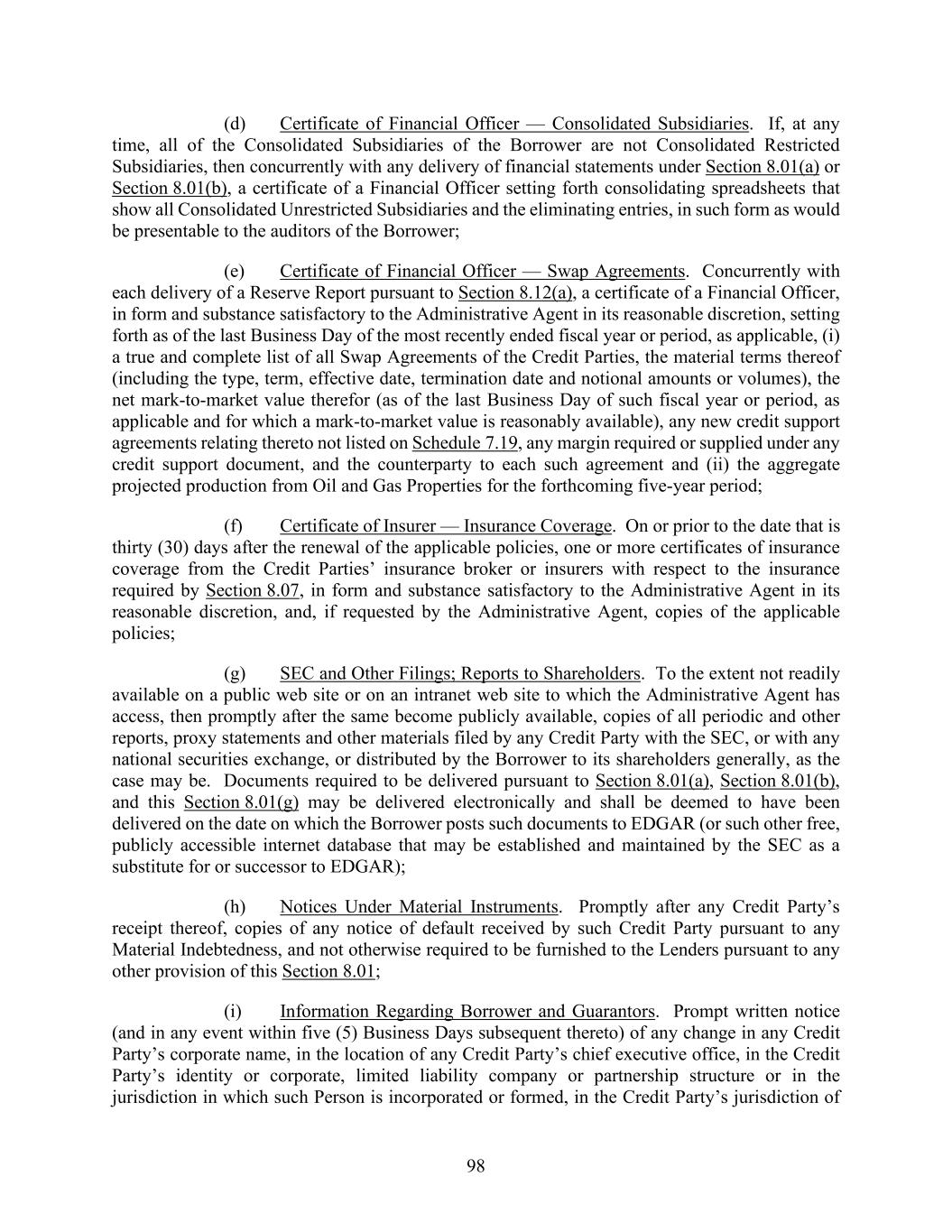 98 (d) Certificate of Financial Officer — Consolidated Subsidiaries. If, at any time, all of the Consolidated Subsidiaries of the Borrower are not Consolidated Restricted Subsidiaries, then concurrently with any delivery of financial statements under Section 8.01(a) or Section 8.01(b), a certificate of a Financial Officer setting forth consolidating spreadsheets that show all Consolidated Unrestricted Subsidiaries and the eliminating entries, in such form as would be presentable to the auditors of the Borrower; (e) Certificate of Financial Officer — Swap Agreements. Concurrently with each delivery of a Reserve Report pursuant to Section 8.12(a), a certificate of a Financial Officer, in form and substance satisfactory to the Administrative Agent in its reasonable discretion, setting forth as of the last Business Day of the most recently ended fiscal year or period, as applicable, (i) a true and complete list of all Swap Agreements of the Credit Parties, the material terms thereof (including the type, term, effective date, termination date and notional amounts or volumes), the net mark-to-market value therefor (as of the last Business Day of such fiscal year or period, as applicable and for which a mark-to-market value is reasonably available), any new credit support agreements relating thereto not listed on Schedule 7.19, any margin required or supplied under any credit support document, and the counterparty to each such agreement and (ii) the aggregate projected production from Oil and Gas Properties for the forthcoming five-year period; (f) Certificate of Insurer — Insurance Coverage. On or prior to the date that is thirty (30) days after the renewal of the applicable policies, one or more certificates of insurance coverage from the Credit Parties’ insurance broker or insurers with respect to the insurance required by Section 8.07, in form and substance satisfactory to the Administrative Agent in its reasonable discretion, and, if requested by the Administrative Agent, copies of the applicable policies; (g) SEC and Other Filings; Reports to Shareholders. To the extent not readily available on a public web site or on an intranet web site to which the Administrative Agent has access, then promptly after the same become publicly available, copies of all periodic and other reports, proxy statements and other materials filed by any Credit Party with the SEC, or with any national securities exchange, or distributed by the Borrower to its shareholders generally, as the case may be. Documents required to be delivered pursuant to Section 8.01(a), Section 8.01(b), and this Section 8.01(g) may be delivered electronically and shall be deemed to have been delivered on the date on which the Borrower posts such documents to EDGAR (or such other free, publicly accessible internet database that may be established and maintained by the SEC as a substitute for or successor to EDGAR); (h) Notices Under Material Instruments. Promptly after any Credit Party’s receipt thereof, copies of any notice of default received by such Credit Party pursuant to any Material Indebtedness, and not otherwise required to be furnished to the Lenders pursuant to any other provision of this Section 8.01; (i) Information Regarding Borrower and Guarantors. Prompt written notice (and in any event within five (5) Business Days subsequent thereto) of any change in any Credit Party’s corporate name, in the location of any Credit Party’s chief executive office, in the Credit Party’s identity or corporate, limited liability company or partnership structure or in the jurisdiction in which such Person is incorporated or formed, in the Credit Party’s jurisdiction of