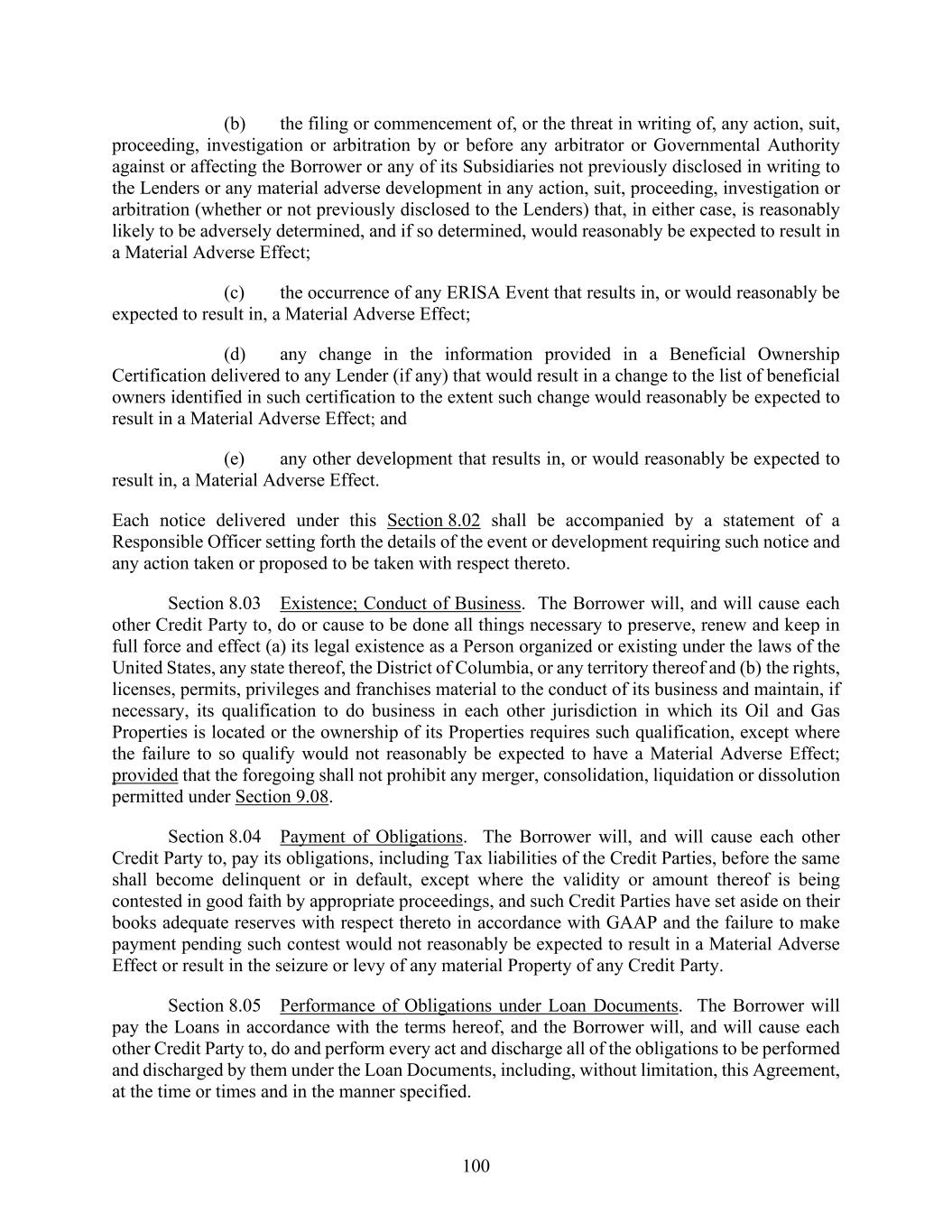 100 (b) the filing or commencement of, or the threat in writing of, any action, suit, proceeding, investigation or arbitration by or before any arbitrator or Governmental Authority against or affecting the Borrower or any of its Subsidiaries not previously disclosed in writing to the Lenders or any material adverse development in any action, suit, proceeding, investigation or arbitration (whether or not previously disclosed to the Lenders) that, in either case, is reasonably likely to be adversely determined, and if so determined, would reasonably be expected to result in a Material Adverse Effect; (c) the occurrence of any ERISA Event that results in, or would reasonably be expected to result in, a Material Adverse Effect; (d) any change in the information provided in a Beneficial Ownership Certification delivered to any Lender (if any) that would result in a change to the list of beneficial owners identified in such certification to the extent such change would reasonably be expected to result in a Material Adverse Effect; and (e) any other development that results in, or would reasonably be expected to result in, a Material Adverse Effect. Each notice delivered under this Section 8.02 shall be accompanied by a statement of a Responsible Officer setting forth the details of the event or development requiring such notice and any action taken or proposed to be taken with respect thereto. Section 8.03 Existence; Conduct of Business. The Borrower will, and will cause each other Credit Party to, do or cause to be done all things necessary to preserve, renew and keep in full force and effect (a) its legal existence as a Person organized or existing under the laws of the United States, any state thereof, the District of Columbia, or any territory thereof and (b) the rights, licenses, permits, privileges and franchises material to the conduct of its business and maintain, if necessary, its qualification to do business in each other jurisdiction in which its Oil and Gas Properties is located or the ownership of its Properties requires such qualification, except where the failure to so qualify would not reasonably be expected to have a Material Adverse Effect; provided that the foregoing shall not prohibit any merger, consolidation, liquidation or dissolution permitted under Section 9.08. Section 8.04 Payment of Obligations. The Borrower will, and will cause each other Credit Party to, pay its obligations, including Tax liabilities of the Credit Parties, before the same shall become delinquent or in default, except where the validity or amount thereof is being contested in good faith by appropriate proceedings, and such Credit Parties have set aside on their books adequate reserves with respect thereto in accordance with GAAP and the failure to make payment pending such contest would not reasonably be expected to result in a Material Adverse Effect or result in the seizure or levy of any material Property of any Credit Party. Section 8.05 Performance of Obligations under Loan Documents. The Borrower will pay the Loans in accordance with the terms hereof, and the Borrower will, and will cause each other Credit Party to, do and perform every act and discharge all of the obligations to be performed and discharged by them under the Loan Documents, including, without limitation, this Agreement, at the time or times and in the manner specified.
