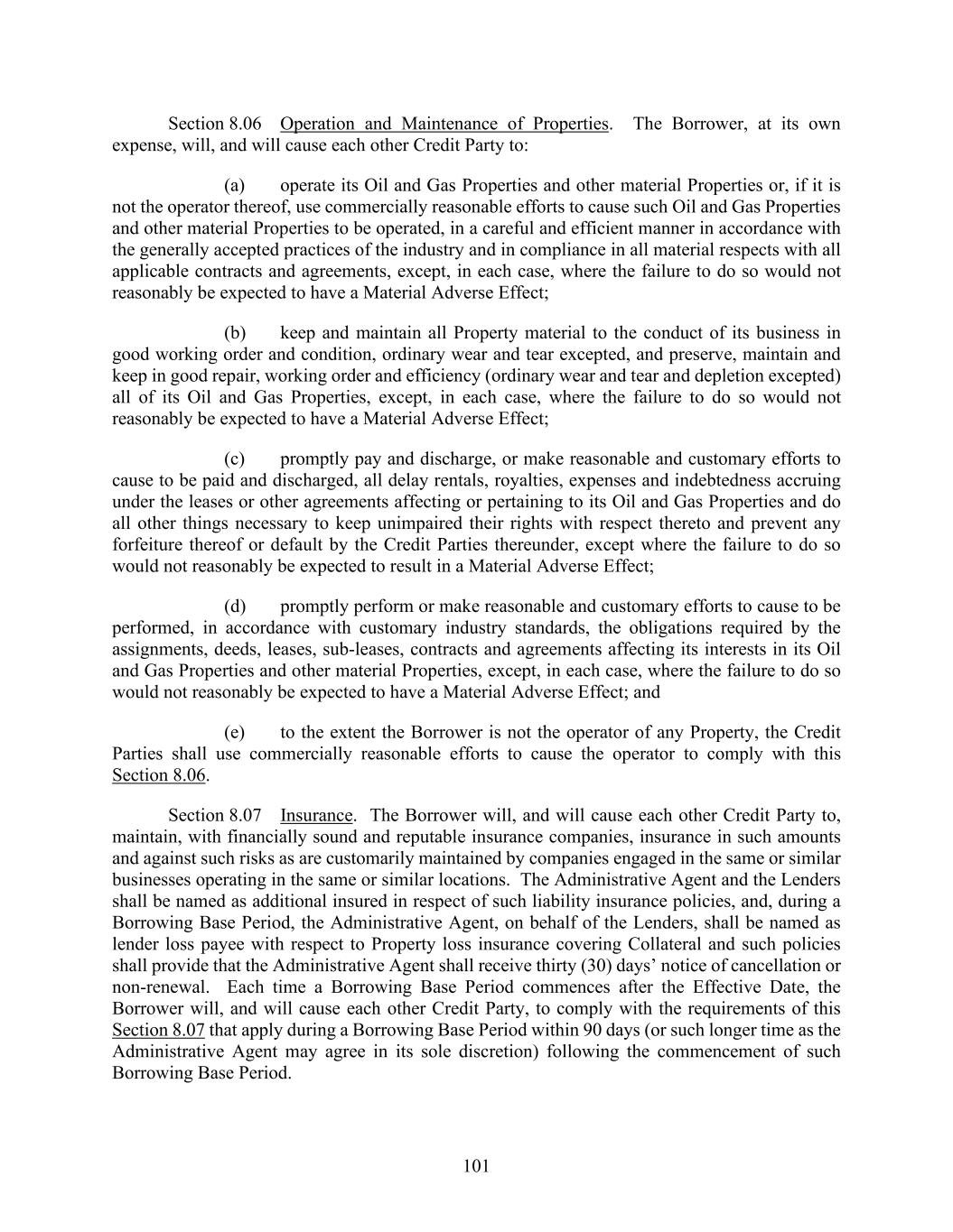 101 Section 8.06 Operation and Maintenance of Properties. The Borrower, at its own expense, will, and will cause each other Credit Party to: (a) operate its Oil and Gas Properties and other material Properties or, if it is not the operator thereof, use commercially reasonable efforts to cause such Oil and Gas Properties and other material Properties to be operated, in a careful and efficient manner in accordance with the generally accepted practices of the industry and in compliance in all material respects with all applicable contracts and agreements, except, in each case, where the failure to do so would not reasonably be expected to have a Material Adverse Effect; (b) keep and maintain all Property material to the conduct of its business in good working order and condition, ordinary wear and tear excepted, and preserve, maintain and keep in good repair, working order and efficiency (ordinary wear and tear and depletion excepted) all of its Oil and Gas Properties, except, in each case, where the failure to do so would not reasonably be expected to have a Material Adverse Effect; (c) promptly pay and discharge, or make reasonable and customary efforts to cause to be paid and discharged, all delay rentals, royalties, expenses and indebtedness accruing under the leases or other agreements affecting or pertaining to its Oil and Gas Properties and do all other things necessary to keep unimpaired their rights with respect thereto and prevent any forfeiture thereof or default by the Credit Parties thereunder, except where the failure to do so would not reasonably be expected to result in a Material Adverse Effect; (d) promptly perform or make reasonable and customary efforts to cause to be performed, in accordance with customary industry standards, the obligations required by the assignments, deeds, leases, sub-leases, contracts and agreements affecting its interests in its Oil and Gas Properties and other material Properties, except, in each case, where the failure to do so would not reasonably be expected to have a Material Adverse Effect; and (e) to the extent the Borrower is not the operator of any Property, the Credit Parties shall use commercially reasonable efforts to cause the operator to comply with this Section 8.06. Section 8.07 Insurance. The Borrower will, and will cause each other Credit Party to, maintain, with financially sound and reputable insurance companies, insurance in such amounts and against such risks as are customarily maintained by companies engaged in the same or similar businesses operating in the same or similar locations. The Administrative Agent and the Lenders shall be named as additional insured in respect of such liability insurance policies, and, during a Borrowing Base Period, the Administrative Agent, on behalf of the Lenders, shall be named as lender loss payee with respect to Property loss insurance covering Collateral and such policies shall provide that the Administrative Agent shall receive thirty (30) days’ notice of cancellation or non-renewal. Each time a Borrowing Base Period commences after the Effective Date, the Borrower will, and will cause each other Credit Party, to comply with the requirements of this Section 8.07 that apply during a Borrowing Base Period within 90 days (or such longer time as the Administrative Agent may agree in its sole discretion) following the commencement of such Borrowing Base Period.