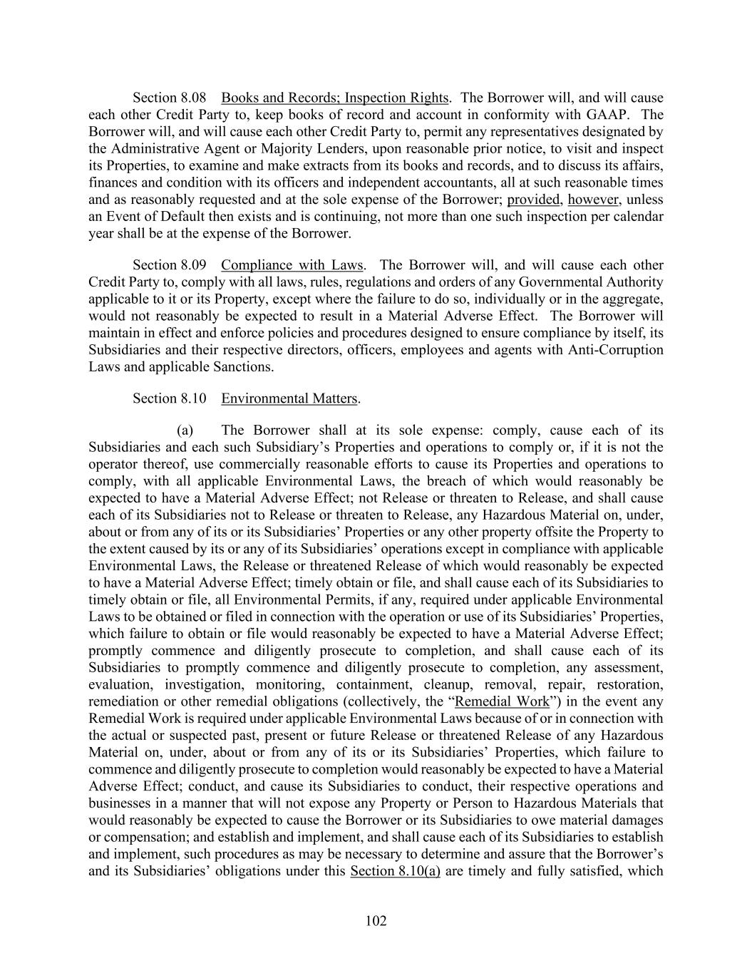 102 Section 8.08 Books and Records; Inspection Rights. The Borrower will, and will cause each other Credit Party to, keep books of record and account in conformity with GAAP. The Borrower will, and will cause each other Credit Party to, permit any representatives designated by the Administrative Agent or Majority Lenders, upon reasonable prior notice, to visit and inspect its Properties, to examine and make extracts from its books and records, and to discuss its affairs, finances and condition with its officers and independent accountants, all at such reasonable times and as reasonably requested and at the sole expense of the Borrower; provided, however, unless an Event of Default then exists and is continuing, not more than one such inspection per calendar year shall be at the expense of the Borrower. Section 8.09 Compliance with Laws. The Borrower will, and will cause each other Credit Party to, comply with all laws, rules, regulations and orders of any Governmental Authority applicable to it or its Property, except where the failure to do so, individually or in the aggregate, would not reasonably be expected to result in a Material Adverse Effect. The Borrower will maintain in effect and enforce policies and procedures designed to ensure compliance by itself, its Subsidiaries and their respective directors, officers, employees and agents with Anti-Corruption Laws and applicable Sanctions. Section 8.10 Environmental Matters. (a) The Borrower shall at its sole expense: comply, cause each of its Subsidiaries and each such Subsidiary’s Properties and operations to comply or, if it is not the operator thereof, use commercially reasonable efforts to cause its Properties and operations to comply, with all applicable Environmental Laws, the breach of which would reasonably be expected to have a Material Adverse Effect; not Release or threaten to Release, and shall cause each of its Subsidiaries not to Release or threaten to Release, any Hazardous Material on, under, about or from any of its or its Subsidiaries’ Properties or any other property offsite the Property to the extent caused by its or any of its Subsidiaries’ operations except in compliance with applicable Environmental Laws, the Release or threatened Release of which would reasonably be expected to have a Material Adverse Effect; timely obtain or file, and shall cause each of its Subsidiaries to timely obtain or file, all Environmental Permits, if any, required under applicable Environmental Laws to be obtained or filed in connection with the operation or use of its Subsidiaries’ Properties, which failure to obtain or file would reasonably be expected to have a Material Adverse Effect; promptly commence and diligently prosecute to completion, and shall cause each of its Subsidiaries to promptly commence and diligently prosecute to completion, any assessment, evaluation, investigation, monitoring, containment, cleanup, removal, repair, restoration, remediation or other remedial obligations (collectively, the “Remedial Work”) in the event any Remedial Work is required under applicable Environmental Laws because of or in connection with the actual or suspected past, present or future Release or threatened Release of any Hazardous Material on, under, about or from any of its or its Subsidiaries’ Properties, which failure to commence and diligently prosecute to completion would reasonably be expected to have a Material Adverse Effect; conduct, and cause its Subsidiaries to conduct, their respective operations and businesses in a manner that will not expose any Property or Person to Hazardous Materials that would reasonably be expected to cause the Borrower or its Subsidiaries to owe material damages or compensation; and establish and implement, and shall cause each of its Subsidiaries to establish and implement, such procedures as may be necessary to determine and assure that the Borrower’s and its Subsidiaries’ obligations under this Section 8.10(a) are timely and fully satisfied, which