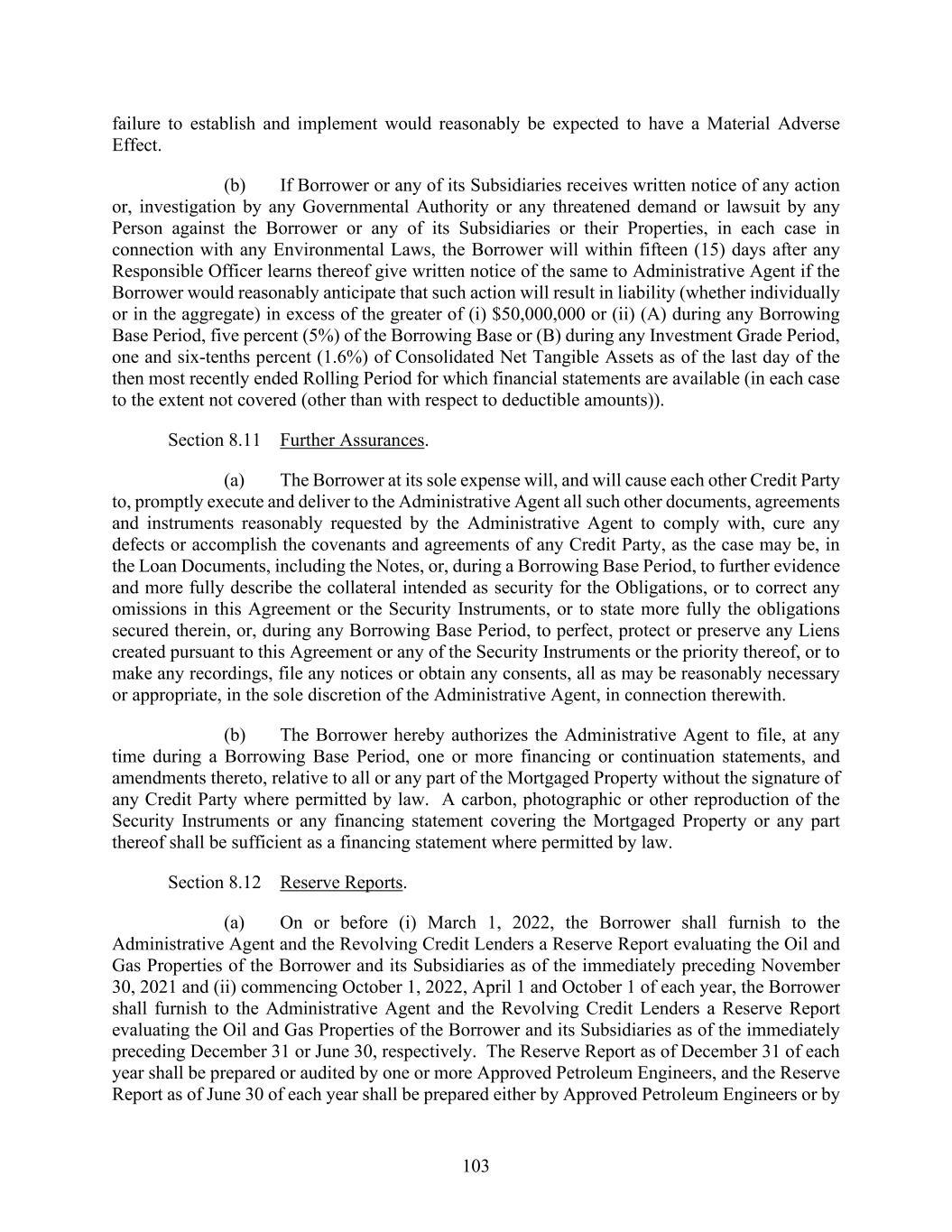 103 failure to establish and implement would reasonably be expected to have a Material Adverse Effect. (b) If Borrower or any of its Subsidiaries receives written notice of any action or, investigation by any Governmental Authority or any threatened demand or lawsuit by any Person against the Borrower or any of its Subsidiaries or their Properties, in each case in connection with any Environmental Laws, the Borrower will within fifteen (15) days after any Responsible Officer learns thereof give written notice of the same to Administrative Agent if the Borrower would reasonably anticipate that such action will result in liability (whether individually or in the aggregate) in excess of the greater of (i) $50,000,000 or (ii) (A) during any Borrowing Base Period, five percent (5%) of the Borrowing Base or (B) during any Investment Grade Period, one and six-tenths percent (1.6%) of Consolidated Net Tangible Assets as of the last day of the then most recently ended Rolling Period for which financial statements are available (in each case to the extent not covered (other than with respect to deductible amounts)). Section 8.11 Further Assurances. (a) The Borrower at its sole expense will, and will cause each other Credit Party to, promptly execute and deliver to the Administrative Agent all such other documents, agreements and instruments reasonably requested by the Administrative Agent to comply with, cure any defects or accomplish the covenants and agreements of any Credit Party, as the case may be, in the Loan Documents, including the Notes, or, during a Borrowing Base Period, to further evidence and more fully describe the collateral intended as security for the Obligations, or to correct any omissions in this Agreement or the Security Instruments, or to state more fully the obligations secured therein, or, during any Borrowing Base Period, to perfect, protect or preserve any Liens created pursuant to this Agreement or any of the Security Instruments or the priority thereof, or to make any recordings, file any notices or obtain any consents, all as may be reasonably necessary or appropriate, in the sole discretion of the Administrative Agent, in connection therewith. (b) The Borrower hereby authorizes the Administrative Agent to file, at any time during a Borrowing Base Period, one or more financing or continuation statements, and amendments thereto, relative to all or any part of the Mortgaged Property without the signature of any Credit Party where permitted by law. A carbon, photographic or other reproduction of the Security Instruments or any financing statement covering the Mortgaged Property or any part thereof shall be sufficient as a financing statement where permitted by law. Section 8.12 Reserve Reports. (a) On or before (i) March 1, 2022, the Borrower shall furnish to the Administrative Agent and the Revolving Credit Lenders a Reserve Report evaluating the Oil and Gas Properties of the Borrower and its Subsidiaries as of the immediately preceding November 30, 2021 and (ii) commencing October 1, 2022, April 1 and October 1 of each year, the Borrower shall furnish to the Administrative Agent and the Revolving Credit Lenders a Reserve Report evaluating the Oil and Gas Properties of the Borrower and its Subsidiaries as of the immediately preceding December 31 or June 30, respectively. The Reserve Report as of December 31 of each year shall be prepared or audited by one or more Approved Petroleum Engineers, and the Reserve Report as of June 30 of each year shall be prepared either by Approved Petroleum Engineers or by