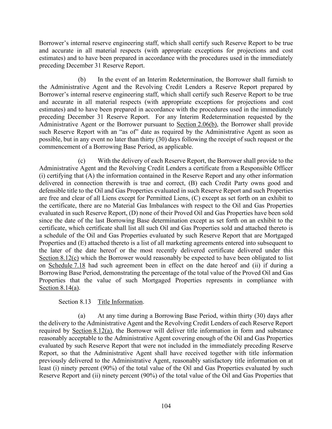 104 Borrower’s internal reserve engineering staff, which shall certify such Reserve Report to be true and accurate in all material respects (with appropriate exceptions for projections and cost estimates) and to have been prepared in accordance with the procedures used in the immediately preceding December 31 Reserve Report. (b) In the event of an Interim Redetermination, the Borrower shall furnish to the Administrative Agent and the Revolving Credit Lenders a Reserve Report prepared by Borrower’s internal reserve engineering staff, which shall certify such Reserve Report to be true and accurate in all material respects (with appropriate exceptions for projections and cost estimates) and to have been prepared in accordance with the procedures used in the immediately preceding December 31 Reserve Report. For any Interim Redetermination requested by the Administrative Agent or the Borrower pursuant to Section 2.06(b), the Borrower shall provide such Reserve Report with an “as of” date as required by the Administrative Agent as soon as possible, but in any event no later than thirty (30) days following the receipt of such request or the commencement of a Borrowing Base Period, as applicable. (c) With the delivery of each Reserve Report, the Borrower shall provide to the Administrative Agent and the Revolving Credit Lenders a certificate from a Responsible Officer (i) certifying that (A) the information contained in the Reserve Report and any other information delivered in connection therewith is true and correct, (B) each Credit Party owns good and defensible title to the Oil and Gas Properties evaluated in such Reserve Report and such Properties are free and clear of all Liens except for Permitted Liens, (C) except as set forth on an exhibit to the certificate, there are no Material Gas Imbalances with respect to the Oil and Gas Properties evaluated in such Reserve Report, (D) none of their Proved Oil and Gas Properties have been sold since the date of the last Borrowing Base determination except as set forth on an exhibit to the certificate, which certificate shall list all such Oil and Gas Properties sold and attached thereto is a schedule of the Oil and Gas Properties evaluated by such Reserve Report that are Mortgaged Properties and (E) attached thereto is a list of all marketing agreements entered into subsequent to the later of the date hereof or the most recently delivered certificate delivered under this Section 8.12(c) which the Borrower would reasonably be expected to have been obligated to list on Schedule 7.18 had such agreement been in effect on the date hereof and (ii) if during a Borrowing Base Period, demonstrating the percentage of the total value of the Proved Oil and Gas Properties that the value of such Mortgaged Properties represents in compliance with Section 8.14(a). Section 8.13 Title Information. (a) At any time during a Borrowing Base Period, within thirty (30) days after the delivery to the Administrative Agent and the Revolving Credit Lenders of each Reserve Report required by Section 8.12(a), the Borrower will deliver title information in form and substance reasonably acceptable to the Administrative Agent covering enough of the Oil and Gas Properties evaluated by such Reserve Report that were not included in the immediately preceding Reserve Report, so that the Administrative Agent shall have received together with title information previously delivered to the Administrative Agent, reasonably satisfactory title information on at least (i) ninety percent (90%) of the total value of the Oil and Gas Properties evaluated by such Reserve Report and (ii) ninety percent (90%) of the total value of the Oil and Gas Properties that