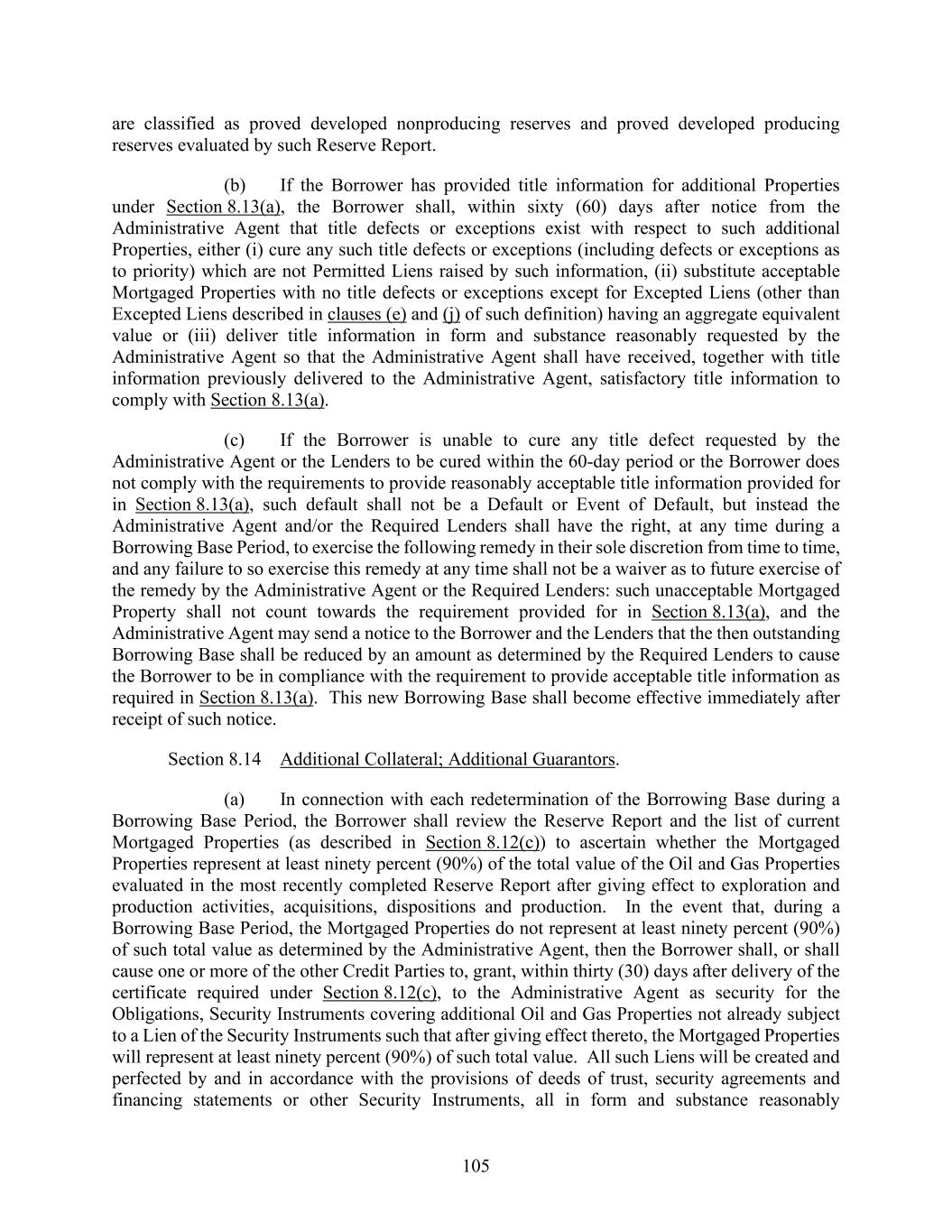 105 are classified as proved developed nonproducing reserves and proved developed producing reserves evaluated by such Reserve Report. (b) If the Borrower has provided title information for additional Properties under Section 8.13(a), the Borrower shall, within sixty (60) days after notice from the Administrative Agent that title defects or exceptions exist with respect to such additional Properties, either (i) cure any such title defects or exceptions (including defects or exceptions as to priority) which are not Permitted Liens raised by such information, (ii) substitute acceptable Mortgaged Properties with no title defects or exceptions except for Excepted Liens (other than Excepted Liens described in clauses (e) and (j) of such definition) having an aggregate equivalent value or (iii) deliver title information in form and substance reasonably requested by the Administrative Agent so that the Administrative Agent shall have received, together with title information previously delivered to the Administrative Agent, satisfactory title information to comply with Section 8.13(a). (c) If the Borrower is unable to cure any title defect requested by the Administrative Agent or the Lenders to be cured within the 60-day period or the Borrower does not comply with the requirements to provide reasonably acceptable title information provided for in Section 8.13(a), such default shall not be a Default or Event of Default, but instead the Administrative Agent and/or the Required Lenders shall have the right, at any time during a Borrowing Base Period, to exercise the following remedy in their sole discretion from time to time, and any failure to so exercise this remedy at any time shall not be a waiver as to future exercise of the remedy by the Administrative Agent or the Required Lenders: such unacceptable Mortgaged Property shall not count towards the requirement provided for in Section 8.13(a), and the Administrative Agent may send a notice to the Borrower and the Lenders that the then outstanding Borrowing Base shall be reduced by an amount as determined by the Required Lenders to cause the Borrower to be in compliance with the requirement to provide acceptable title information as required in Section 8.13(a). This new Borrowing Base shall become effective immediately after receipt of such notice. Section 8.14 Additional Collateral; Additional Guarantors. (a) In connection with each redetermination of the Borrowing Base during a Borrowing Base Period, the Borrower shall review the Reserve Report and the list of current Mortgaged Properties (as described in Section 8.12(c)) to ascertain whether the Mortgaged Properties represent at least ninety percent (90%) of the total value of the Oil and Gas Properties evaluated in the most recently completed Reserve Report after giving effect to exploration and production activities, acquisitions, dispositions and production. In the event that, during a Borrowing Base Period, the Mortgaged Properties do not represent at least ninety percent (90%) of such total value as determined by the Administrative Agent, then the Borrower shall, or shall cause one or more of the other Credit Parties to, grant, within thirty (30) days after delivery of the certificate required under Section 8.12(c), to the Administrative Agent as security for the Obligations, Security Instruments covering additional Oil and Gas Properties not already subject to a Lien of the Security Instruments such that after giving effect thereto, the Mortgaged Properties will represent at least ninety percent (90%) of such total value. All such Liens will be created and perfected by and in accordance with the provisions of deeds of trust, security agreements and financing statements or other Security Instruments, all in form and substance reasonably