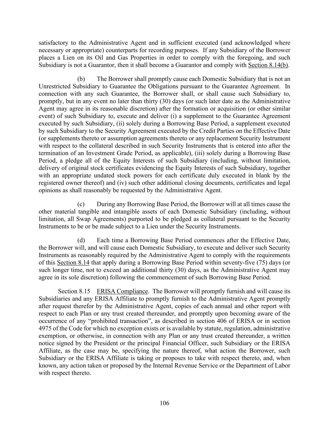 106 satisfactory to the Administrative Agent and in sufficient executed (and acknowledged where necessary or appropriate) counterparts for recording purposes. If any Subsidiary of the Borrower places a Lien on its Oil and Gas Properties in order to comply with the foregoing, and such Subsidiary is not a Guarantor, then it shall become a Guarantor and comply with Section 8.14(b). (b) The Borrower shall promptly cause each Domestic Subsidiary that is not an Unrestricted Subsidiary to Guarantee the Obligations pursuant to the Guarantee Agreement. In connection with any such Guarantee, the Borrower shall, or shall cause such Subsidiary to, promptly, but in any event no later than thirty (30) days (or such later date as the Administrative Agent may agree in its reasonable discretion) after the formation or acquisition (or other similar event) of such Subsidiary to, execute and deliver (i) a supplement to the Guarantee Agreement executed by such Subsidiary, (ii) solely during a Borrowing Base Period, a supplement executed by such Subsidiary to the Security Agreement executed by the Credit Parties on the Effective Date (or supplements thereto or assumption agreements thereto or any replacement Security Instrument with respect to the collateral described in such Security Instruments that is entered into after the termination of an Investment Grade Period, as applicable), (iii) solely during a Borrowing Base Period, a pledge all of the Equity Interests of such Subsidiary (including, without limitation, delivery of original stock certificates evidencing the Equity Interests of such Subsidiary, together with an appropriate undated stock powers for each certificate duly executed in blank by the registered owner thereof) and (iv) such other additional closing documents, certificates and legal opinions as shall reasonably be requested by the Administrative Agent. (c) During any Borrowing Base Period, the Borrower will at all times cause the other material tangible and intangible assets of each Domestic Subsidiary (including, without limitation, all Swap Agreements) purported to be pledged as collateral pursuant to the Security Instruments to be or be made subject to a Lien under the Security Instruments. (d) Each time a Borrowing Base Period commences after the Effective Date, the Borrower will, and will cause each Domestic Subsidiary, to execute and deliver such Security Instruments as reasonably required by the Administrative Agent to comply with the requirements of this Section 8.14 that apply during a Borrowing Base Period within seventy-five (75) days (or such longer time, not to exceed an additional thirty (30) days, as the Administrative Agent may agree in its sole discretion) following the commencement of such Borrowing Base Period. Section 8.15 ERISA Compliance. The Borrower will promptly furnish and will cause its Subsidiaries and any ERISA Affiliate to promptly furnish to the Administrative Agent promptly after request therefor by the Administrative Agent, copies of each annual and other report with respect to each Plan or any trust created thereunder, and promptly upon becoming aware of the occurrence of any “prohibited transaction”, as described in section 406 of ERISA or in section 4975 of the Code for which no exception exists or is available by statute, regulation, administrative exemption, or otherwise, in connection with any Plan or any trust created thereunder, a written notice signed by the President or the principal Financial Officer, such Subsidiary or the ERISA Affiliate, as the case may be, specifying the nature thereof, what action the Borrower, such Subsidiary or the ERISA Affiliate is taking or proposes to take with respect thereto, and, when known, any action taken or proposed by the Internal Revenue Service or the Department of Labor with respect thereto.