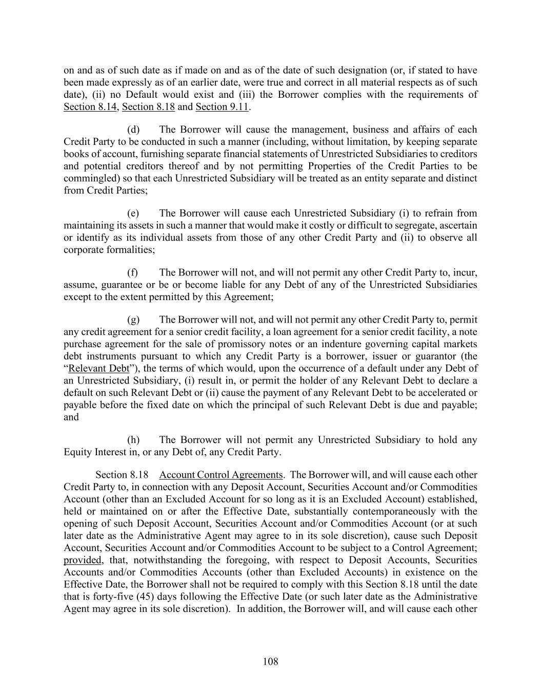 108 on and as of such date as if made on and as of the date of such designation (or, if stated to have been made expressly as of an earlier date, were true and correct in all material respects as of such date), (ii) no Default would exist and (iii) the Borrower complies with the requirements of Section 8.14, Section 8.18 and Section 9.11. (d) The Borrower will cause the management, business and affairs of each Credit Party to be conducted in such a manner (including, without limitation, by keeping separate books of account, furnishing separate financial statements of Unrestricted Subsidiaries to creditors and potential creditors thereof and by not permitting Properties of the Credit Parties to be commingled) so that each Unrestricted Subsidiary will be treated as an entity separate and distinct from Credit Parties; (e) The Borrower will cause each Unrestricted Subsidiary (i) to refrain from maintaining its assets in such a manner that would make it costly or difficult to segregate, ascertain or identify as its individual assets from those of any other Credit Party and (ii) to observe all corporate formalities; (f) The Borrower will not, and will not permit any other Credit Party to, incur, assume, guarantee or be or become liable for any Debt of any of the Unrestricted Subsidiaries except to the extent permitted by this Agreement; (g) The Borrower will not, and will not permit any other Credit Party to, permit any credit agreement for a senior credit facility, a loan agreement for a senior credit facility, a note purchase agreement for the sale of promissory notes or an indenture governing capital markets debt instruments pursuant to which any Credit Party is a borrower, issuer or guarantor (the “Relevant Debt”), the terms of which would, upon the occurrence of a default under any Debt of an Unrestricted Subsidiary, (i) result in, or permit the holder of any Relevant Debt to declare a default on such Relevant Debt or (ii) cause the payment of any Relevant Debt to be accelerated or payable before the fixed date on which the principal of such Relevant Debt is due and payable; and (h) The Borrower will not permit any Unrestricted Subsidiary to hold any Equity Interest in, or any Debt of, any Credit Party. Section 8.18 Account Control Agreements. The Borrower will, and will cause each other Credit Party to, in connection with any Deposit Account, Securities Account and/or Commodities Account (other than an Excluded Account for so long as it is an Excluded Account) established, held or maintained on or after the Effective Date, substantially contemporaneously with the opening of such Deposit Account, Securities Account and/or Commodities Account (or at such later date as the Administrative Agent may agree to in its sole discretion), cause such Deposit Account, Securities Account and/or Commodities Account to be subject to a Control Agreement; provided, that, notwithstanding the foregoing, with respect to Deposit Accounts, Securities Accounts and/or Commodities Accounts (other than Excluded Accounts) in existence on the Effective Date, the Borrower shall not be required to comply with this Section 8.18 until the date that is forty-five (45) days following the Effective Date (or such later date as the Administrative Agent may agree in its sole discretion). In addition, the Borrower will, and will cause each other
