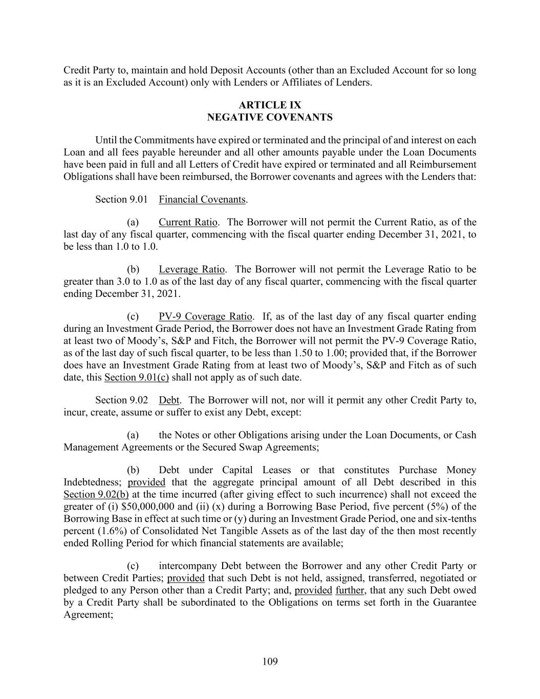 109 Credit Party to, maintain and hold Deposit Accounts (other than an Excluded Account for so long as it is an Excluded Account) only with Lenders or Affiliates of Lenders. ARTICLE IX NEGATIVE COVENANTS Until the Commitments have expired or terminated and the principal of and interest on each Loan and all fees payable hereunder and all other amounts payable under the Loan Documents have been paid in full and all Letters of Credit have expired or terminated and all Reimbursement Obligations shall have been reimbursed, the Borrower covenants and agrees with the Lenders that: Section 9.01 Financial Covenants. (a) Current Ratio. The Borrower will not permit the Current Ratio, as of the last day of any fiscal quarter, commencing with the fiscal quarter ending December 31, 2021, to be less than 1.0 to 1.0. (b) Leverage Ratio. The Borrower will not permit the Leverage Ratio to be greater than 3.0 to 1.0 as of the last day of any fiscal quarter, commencing with the fiscal quarter ending December 31, 2021. (c) PV-9 Coverage Ratio. If, as of the last day of any fiscal quarter ending during an Investment Grade Period, the Borrower does not have an Investment Grade Rating from at least two of Moody’s, S&P and Fitch, the Borrower will not permit the PV-9 Coverage Ratio, as of the last day of such fiscal quarter, to be less than 1.50 to 1.00; provided that, if the Borrower does have an Investment Grade Rating from at least two of Moody’s, S&P and Fitch as of such date, this Section 9.01(c) shall not apply as of such date. Section 9.02 Debt. The Borrower will not, nor will it permit any other Credit Party to, incur, create, assume or suffer to exist any Debt, except: (a) the Notes or other Obligations arising under the Loan Documents, or Cash Management Agreements or the Secured Swap Agreements; (b) Debt under Capital Leases or that constitutes Purchase Money Indebtedness; provided that the aggregate principal amount of all Debt described in this Section 9.02(b) at the time incurred (after giving effect to such incurrence) shall not exceed the greater of (i) $50,000,000 and (ii) (x) during a Borrowing Base Period, five percent (5%) of the Borrowing Base in effect at such time or (y) during an Investment Grade Period, one and six-tenths percent (1.6%) of Consolidated Net Tangible Assets as of the last day of the then most recently ended Rolling Period for which financial statements are available; (c) intercompany Debt between the Borrower and any other Credit Party or between Credit Parties; provided that such Debt is not held, assigned, transferred, negotiated or pledged to any Person other than a Credit Party; and, provided further, that any such Debt owed by a Credit Party shall be subordinated to the Obligations on terms set forth in the Guarantee Agreement;
