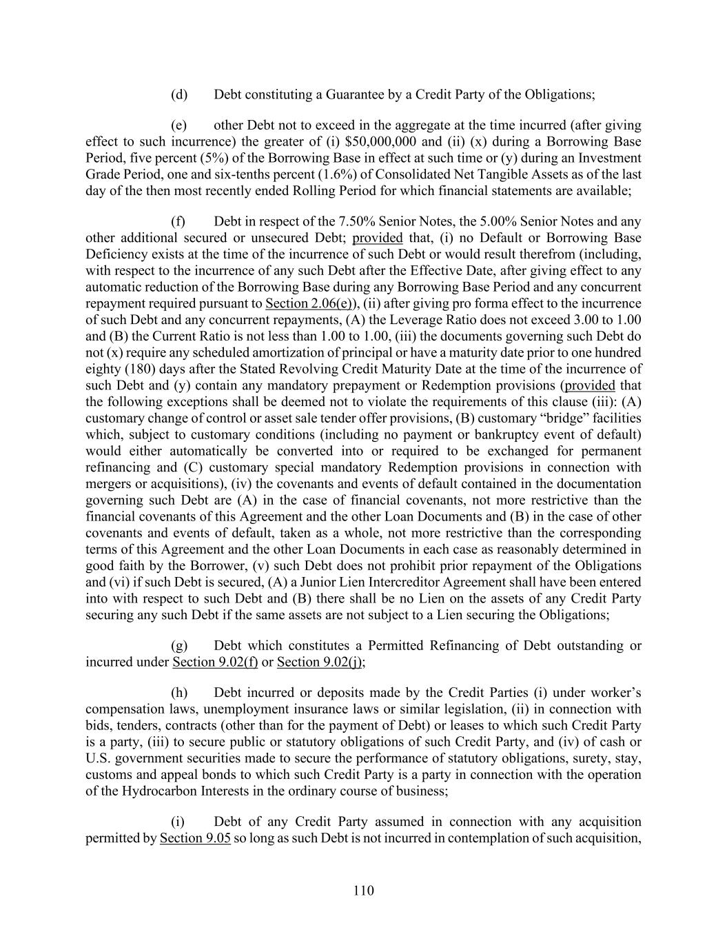 110 (d) Debt constituting a Guarantee by a Credit Party of the Obligations; (e) other Debt not to exceed in the aggregate at the time incurred (after giving effect to such incurrence) the greater of (i) $50,000,000 and (ii) (x) during a Borrowing Base Period, five percent (5%) of the Borrowing Base in effect at such time or (y) during an Investment Grade Period, one and six-tenths percent (1.6%) of Consolidated Net Tangible Assets as of the last day of the then most recently ended Rolling Period for which financial statements are available; (f) Debt in respect of the 7.50% Senior Notes, the 5.00% Senior Notes and any other additional secured or unsecured Debt; provided that, (i) no Default or Borrowing Base Deficiency exists at the time of the incurrence of such Debt or would result therefrom (including, with respect to the incurrence of any such Debt after the Effective Date, after giving effect to any automatic reduction of the Borrowing Base during any Borrowing Base Period and any concurrent repayment required pursuant to Section 2.06(e)), (ii) after giving pro forma effect to the incurrence of such Debt and any concurrent repayments, (A) the Leverage Ratio does not exceed 3.00 to 1.00 and (B) the Current Ratio is not less than 1.00 to 1.00, (iii) the documents governing such Debt do not (x) require any scheduled amortization of principal or have a maturity date prior to one hundred eighty (180) days after the Stated Revolving Credit Maturity Date at the time of the incurrence of such Debt and (y) contain any mandatory prepayment or Redemption provisions (provided that the following exceptions shall be deemed not to violate the requirements of this clause (iii): (A) customary change of control or asset sale tender offer provisions, (B) customary “bridge” facilities which, subject to customary conditions (including no payment or bankruptcy event of default) would either automatically be converted into or required to be exchanged for permanent refinancing and (C) customary special mandatory Redemption provisions in connection with mergers or acquisitions), (iv) the covenants and events of default contained in the documentation governing such Debt are (A) in the case of financial covenants, not more restrictive than the financial covenants of this Agreement and the other Loan Documents and (B) in the case of other covenants and events of default, taken as a whole, not more restrictive than the corresponding terms of this Agreement and the other Loan Documents in each case as reasonably determined in good faith by the Borrower, (v) such Debt does not prohibit prior repayment of the Obligations and (vi) if such Debt is secured, (A) a Junior Lien Intercreditor Agreement shall have been entered into with respect to such Debt and (B) there shall be no Lien on the assets of any Credit Party securing any such Debt if the same assets are not subject to a Lien securing the Obligations; (g) Debt which constitutes a Permitted Refinancing of Debt outstanding or incurred under Section 9.02(f) or Section 9.02(j); (h) Debt incurred or deposits made by the Credit Parties (i) under worker’s compensation laws, unemployment insurance laws or similar legislation, (ii) in connection with bids, tenders, contracts (other than for the payment of Debt) or leases to which such Credit Party is a party, (iii) to secure public or statutory obligations of such Credit Party, and (iv) of cash or U.S. government securities made to secure the performance of statutory obligations, surety, stay, customs and appeal bonds to which such Credit Party is a party in connection with the operation of the Hydrocarbon Interests in the ordinary course of business; (i) Debt of any Credit Party assumed in connection with any acquisition permitted by Section 9.05 so long as such Debt is not incurred in contemplation of such acquisition,