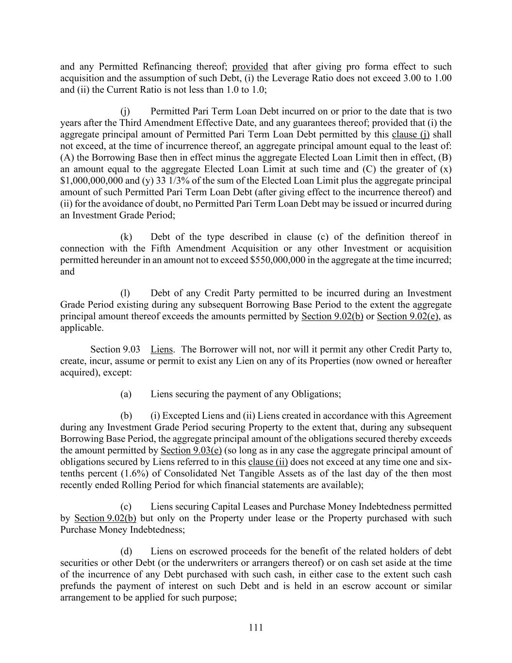 111 and any Permitted Refinancing thereof; provided that after giving pro forma effect to such acquisition and the assumption of such Debt, (i) the Leverage Ratio does not exceed 3.00 to 1.00 and (ii) the Current Ratio is not less than 1.0 to 1.0; (j) Permitted Pari Term Loan Debt incurred on or prior to the date that is two years after the Third Amendment Effective Date, and any guarantees thereof; provided that (i) the aggregate principal amount of Permitted Pari Term Loan Debt permitted by this clause (j) shall not exceed, at the time of incurrence thereof, an aggregate principal amount equal to the least of: (A) the Borrowing Base then in effect minus the aggregate Elected Loan Limit then in effect, (B) an amount equal to the aggregate Elected Loan Limit at such time and (C) the greater of (x) $1,000,000,000 and (y) 33 1/3% of the sum of the Elected Loan Limit plus the aggregate principal amount of such Permitted Pari Term Loan Debt (after giving effect to the incurrence thereof) and (ii) for the avoidance of doubt, no Permitted Pari Term Loan Debt may be issued or incurred during an Investment Grade Period; (k) Debt of the type described in clause (c) of the definition thereof in connection with the Fifth Amendment Acquisition or any other Investment or acquisition permitted hereunder in an amount not to exceed $550,000,000 in the aggregate at the time incurred; and (l) Debt of any Credit Party permitted to be incurred during an Investment Grade Period existing during any subsequent Borrowing Base Period to the extent the aggregate principal amount thereof exceeds the amounts permitted by Section 9.02(b) or Section 9.02(e), as applicable. Section 9.03 Liens. The Borrower will not, nor will it permit any other Credit Party to, create, incur, assume or permit to exist any Lien on any of its Properties (now owned or hereafter acquired), except: (a) Liens securing the payment of any Obligations; (b) (i) Excepted Liens and (ii) Liens created in accordance with this Agreement during any Investment Grade Period securing Property to the extent that, during any subsequent Borrowing Base Period, the aggregate principal amount of the obligations secured thereby exceeds the amount permitted by Section 9.03(e) (so long as in any case the aggregate principal amount of obligations secured by Liens referred to in this clause (ii) does not exceed at any time one and six- tenths percent (1.6%) of Consolidated Net Tangible Assets as of the last day of the then most recently ended Rolling Period for which financial statements are available); (c) Liens securing Capital Leases and Purchase Money Indebtedness permitted by Section 9.02(b) but only on the Property under lease or the Property purchased with such Purchase Money Indebtedness; (d) Liens on escrowed proceeds for the benefit of the related holders of debt securities or other Debt (or the underwriters or arrangers thereof) or on cash set aside at the time of the incurrence of any Debt purchased with such cash, in either case to the extent such cash prefunds the payment of interest on such Debt and is held in an escrow account or similar arrangement to be applied for such purpose;