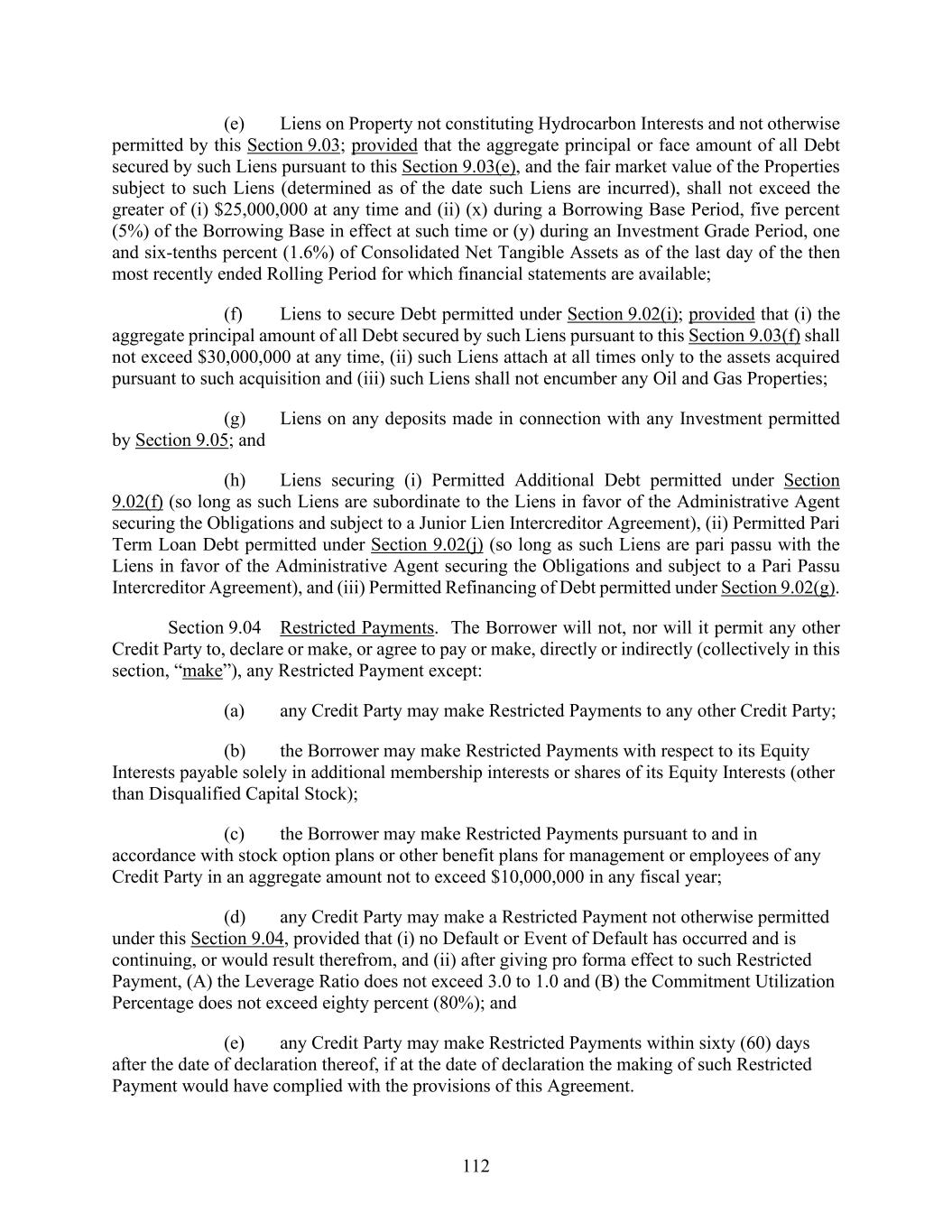 112 (e) Liens on Property not constituting Hydrocarbon Interests and not otherwise permitted by this Section 9.03; provided that the aggregate principal or face amount of all Debt secured by such Liens pursuant to this Section 9.03(e), and the fair market value of the Properties subject to such Liens (determined as of the date such Liens are incurred), shall not exceed the greater of (i) $25,000,000 at any time and (ii) (x) during a Borrowing Base Period, five percent (5%) of the Borrowing Base in effect at such time or (y) during an Investment Grade Period, one and six-tenths percent (1.6%) of Consolidated Net Tangible Assets as of the last day of the then most recently ended Rolling Period for which financial statements are available; (f) Liens to secure Debt permitted under Section 9.02(i); provided that (i) the aggregate principal amount of all Debt secured by such Liens pursuant to this Section 9.03(f) shall not exceed $30,000,000 at any time, (ii) such Liens attach at all times only to the assets acquired pursuant to such acquisition and (iii) such Liens shall not encumber any Oil and Gas Properties; (g) Liens on any deposits made in connection with any Investment permitted by Section 9.05; and (h) Liens securing (i) Permitted Additional Debt permitted under Section 9.02(f) (so long as such Liens are subordinate to the Liens in favor of the Administrative Agent securing the Obligations and subject to a Junior Lien Intercreditor Agreement), (ii) Permitted Pari Term Loan Debt permitted under Section 9.02(j) (so long as such Liens are pari passu with the Liens in favor of the Administrative Agent securing the Obligations and subject to a Pari Passu Intercreditor Agreement), and (iii) Permitted Refinancing of Debt permitted under Section 9.02(g). Section 9.04 Restricted Payments. The Borrower will not, nor will it permit any other Credit Party to, declare or make, or agree to pay or make, directly or indirectly (collectively in this section, “make”), any Restricted Payment except: (a) any Credit Party may make Restricted Payments to any other Credit Party; (b) the Borrower may make Restricted Payments with respect to its Equity Interests payable solely in additional membership interests or shares of its Equity Interests (other than Disqualified Capital Stock); (c) the Borrower may make Restricted Payments pursuant to and in accordance with stock option plans or other benefit plans for management or employees of any Credit Party in an aggregate amount not to exceed $10,000,000 in any fiscal year; (d) any Credit Party may make a Restricted Payment not otherwise permitted under this Section 9.04, provided that (i) no Default or Event of Default has occurred and is continuing, or would result therefrom, and (ii) after giving pro forma effect to such Restricted Payment, (A) the Leverage Ratio does not exceed 3.0 to 1.0 and (B) the Commitment Utilization Percentage does not exceed eighty percent (80%); and (e) any Credit Party may make Restricted Payments within sixty (60) days after the date of declaration thereof, if at the date of declaration the making of such Restricted Payment would have complied with the provisions of this Agreement.