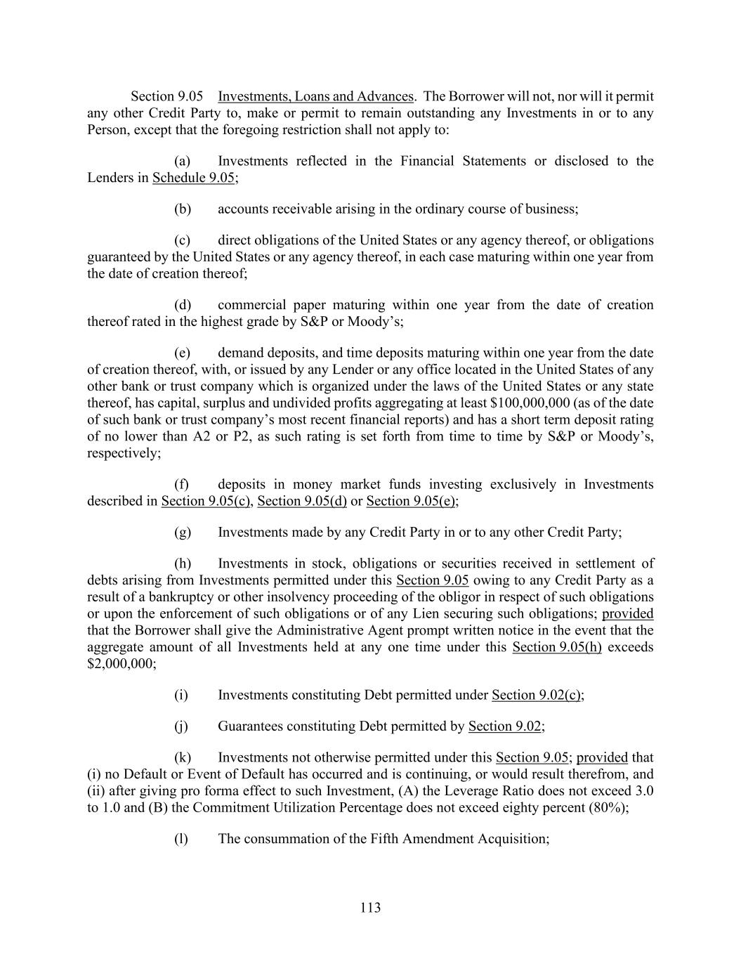 113 Section 9.05 Investments, Loans and Advances. The Borrower will not, nor will it permit any other Credit Party to, make or permit to remain outstanding any Investments in or to any Person, except that the foregoing restriction shall not apply to: (a) Investments reflected in the Financial Statements or disclosed to the Lenders in Schedule 9.05; (b) accounts receivable arising in the ordinary course of business; (c) direct obligations of the United States or any agency thereof, or obligations guaranteed by the United States or any agency thereof, in each case maturing within one year from the date of creation thereof; (d) commercial paper maturing within one year from the date of creation thereof rated in the highest grade by S&P or Moody’s; (e) demand deposits, and time deposits maturing within one year from the date of creation thereof, with, or issued by any Lender or any office located in the United States of any other bank or trust company which is organized under the laws of the United States or any state thereof, has capital, surplus and undivided profits aggregating at least $100,000,000 (as of the date of such bank or trust company’s most recent financial reports) and has a short term deposit rating of no lower than A2 or P2, as such rating is set forth from time to time by S&P or Moody’s, respectively; (f) deposits in money market funds investing exclusively in Investments described in Section 9.05(c), Section 9.05(d) or Section 9.05(e); (g) Investments made by any Credit Party in or to any other Credit Party; (h) Investments in stock, obligations or securities received in settlement of debts arising from Investments permitted under this Section 9.05 owing to any Credit Party as a result of a bankruptcy or other insolvency proceeding of the obligor in respect of such obligations or upon the enforcement of such obligations or of any Lien securing such obligations; provided that the Borrower shall give the Administrative Agent prompt written notice in the event that the aggregate amount of all Investments held at any one time under this Section 9.05(h) exceeds $2,000,000; (i) Investments constituting Debt permitted under Section 9.02(c); (j) Guarantees constituting Debt permitted by Section 9.02; (k) Investments not otherwise permitted under this Section 9.05; provided that (i) no Default or Event of Default has occurred and is continuing, or would result therefrom, and (ii) after giving pro forma effect to such Investment, (A) the Leverage Ratio does not exceed 3.0 to 1.0 and (B) the Commitment Utilization Percentage does not exceed eighty percent (80%); (l) The consummation of the Fifth Amendment Acquisition;