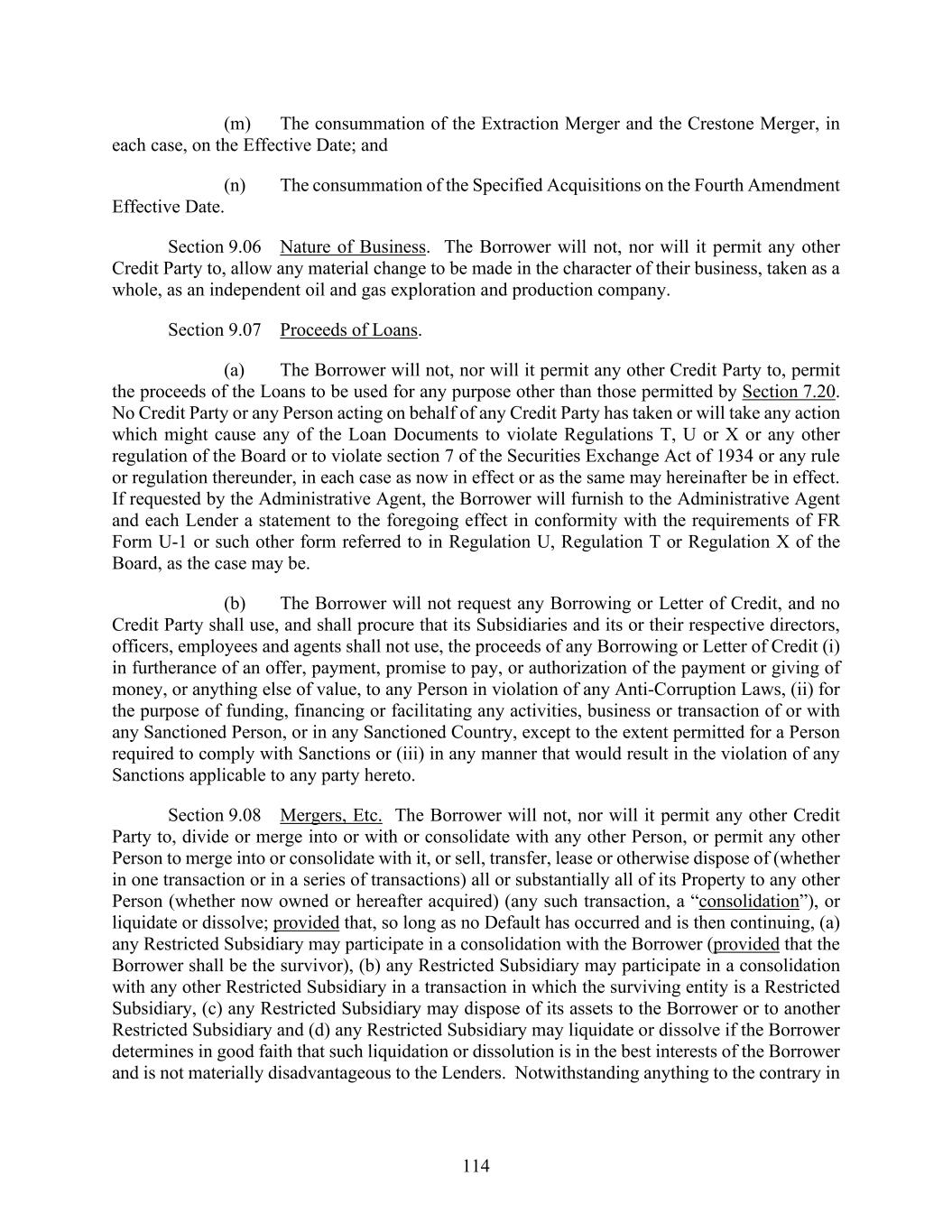 114 (m) The consummation of the Extraction Merger and the Crestone Merger, in each case, on the Effective Date; and (n) The consummation of the Specified Acquisitions on the Fourth Amendment Effective Date. Section 9.06 Nature of Business. The Borrower will not, nor will it permit any other Credit Party to, allow any material change to be made in the character of their business, taken as a whole, as an independent oil and gas exploration and production company. Section 9.07 Proceeds of Loans. (a) The Borrower will not, nor will it permit any other Credit Party to, permit the proceeds of the Loans to be used for any purpose other than those permitted by Section 7.20. No Credit Party or any Person acting on behalf of any Credit Party has taken or will take any action which might cause any of the Loan Documents to violate Regulations T, U or X or any other regulation of the Board or to violate section 7 of the Securities Exchange Act of 1934 or any rule or regulation thereunder, in each case as now in effect or as the same may hereinafter be in effect. If requested by the Administrative Agent, the Borrower will furnish to the Administrative Agent and each Lender a statement to the foregoing effect in conformity with the requirements of FR Form U-1 or such other form referred to in Regulation U, Regulation T or Regulation X of the Board, as the case may be. (b) The Borrower will not request any Borrowing or Letter of Credit, and no Credit Party shall use, and shall procure that its Subsidiaries and its or their respective directors, officers, employees and agents shall not use, the proceeds of any Borrowing or Letter of Credit (i) in furtherance of an offer, payment, promise to pay, or authorization of the payment or giving of money, or anything else of value, to any Person in violation of any Anti-Corruption Laws, (ii) for the purpose of funding, financing or facilitating any activities, business or transaction of or with any Sanctioned Person, or in any Sanctioned Country, except to the extent permitted for a Person required to comply with Sanctions or (iii) in any manner that would result in the violation of any Sanctions applicable to any party hereto. Section 9.08 Mergers, Etc. The Borrower will not, nor will it permit any other Credit Party to, divide or merge into or with or consolidate with any other Person, or permit any other Person to merge into or consolidate with it, or sell, transfer, lease or otherwise dispose of (whether in one transaction or in a series of transactions) all or substantially all of its Property to any other Person (whether now owned or hereafter acquired) (any such transaction, a “consolidation”), or liquidate or dissolve; provided that, so long as no Default has occurred and is then continuing, (a) any Restricted Subsidiary may participate in a consolidation with the Borrower (provided that the Borrower shall be the survivor), (b) any Restricted Subsidiary may participate in a consolidation with any other Restricted Subsidiary in a transaction in which the surviving entity is a Restricted Subsidiary, (c) any Restricted Subsidiary may dispose of its assets to the Borrower or to another Restricted Subsidiary and (d) any Restricted Subsidiary may liquidate or dissolve if the Borrower determines in good faith that such liquidation or dissolution is in the best interests of the Borrower and is not materially disadvantageous to the Lenders. Notwithstanding anything to the contrary in