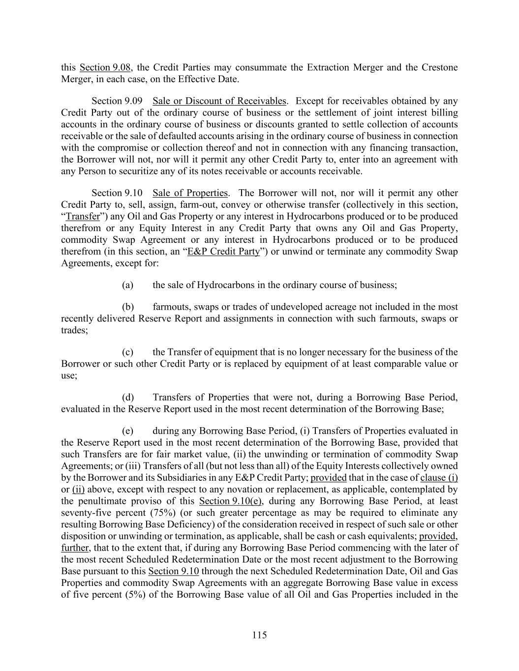 115 this Section 9.08, the Credit Parties may consummate the Extraction Merger and the Crestone Merger, in each case, on the Effective Date. Section 9.09 Sale or Discount of Receivables. Except for receivables obtained by any Credit Party out of the ordinary course of business or the settlement of joint interest billing accounts in the ordinary course of business or discounts granted to settle collection of accounts receivable or the sale of defaulted accounts arising in the ordinary course of business in connection with the compromise or collection thereof and not in connection with any financing transaction, the Borrower will not, nor will it permit any other Credit Party to, enter into an agreement with any Person to securitize any of its notes receivable or accounts receivable. Section 9.10 Sale of Properties. The Borrower will not, nor will it permit any other Credit Party to, sell, assign, farm-out, convey or otherwise transfer (collectively in this section, “Transfer”) any Oil and Gas Property or any interest in Hydrocarbons produced or to be produced therefrom or any Equity Interest in any Credit Party that owns any Oil and Gas Property, commodity Swap Agreement or any interest in Hydrocarbons produced or to be produced therefrom (in this section, an “E&P Credit Party”) or unwind or terminate any commodity Swap Agreements, except for: (a) the sale of Hydrocarbons in the ordinary course of business; (b) farmouts, swaps or trades of undeveloped acreage not included in the most recently delivered Reserve Report and assignments in connection with such farmouts, swaps or trades; (c) the Transfer of equipment that is no longer necessary for the business of the Borrower or such other Credit Party or is replaced by equipment of at least comparable value or use; (d) Transfers of Properties that were not, during a Borrowing Base Period, evaluated in the Reserve Report used in the most recent determination of the Borrowing Base; (e) during any Borrowing Base Period, (i) Transfers of Properties evaluated in the Reserve Report used in the most recent determination of the Borrowing Base, provided that such Transfers are for fair market value, (ii) the unwinding or termination of commodity Swap Agreements; or (iii) Transfers of all (but not less than all) of the Equity Interests collectively owned by the Borrower and its Subsidiaries in any E&P Credit Party; provided that in the case of clause (i) or (ii) above, except with respect to any novation or replacement, as applicable, contemplated by the penultimate proviso of this Section 9.10(e), during any Borrowing Base Period, at least seventy-five percent (75%) (or such greater percentage as may be required to eliminate any resulting Borrowing Base Deficiency) of the consideration received in respect of such sale or other disposition or unwinding or termination, as applicable, shall be cash or cash equivalents; provided, further, that to the extent that, if during any Borrowing Base Period commencing with the later of the most recent Scheduled Redetermination Date or the most recent adjustment to the Borrowing Base pursuant to this Section 9.10 through the next Scheduled Redetermination Date, Oil and Gas Properties and commodity Swap Agreements with an aggregate Borrowing Base value in excess of five percent (5%) of the Borrowing Base value of all Oil and Gas Properties included in the