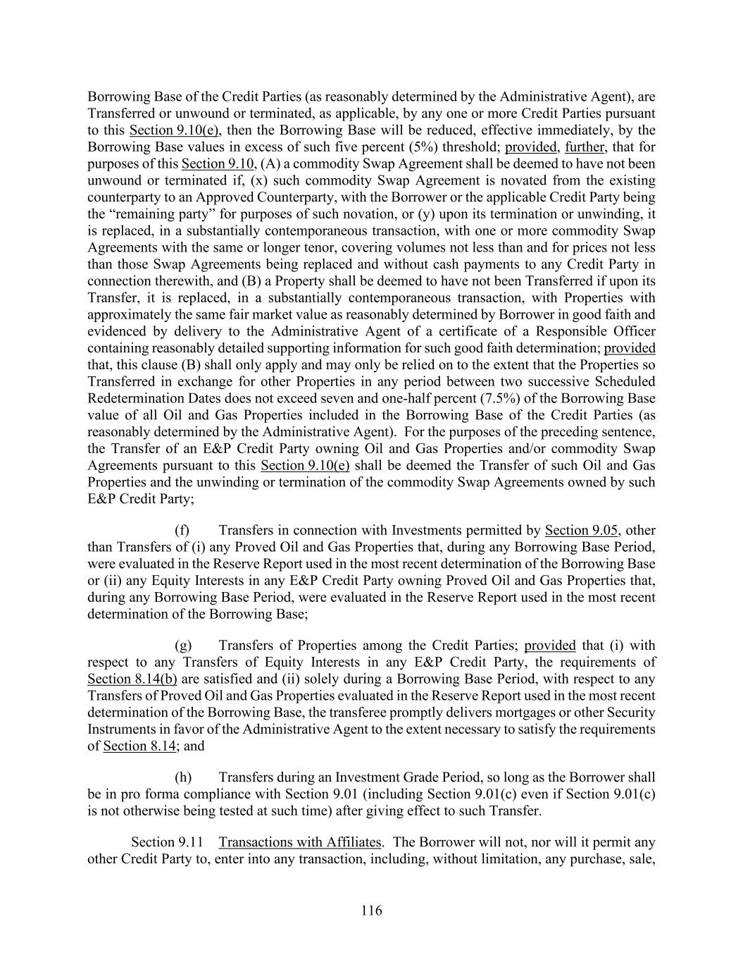 116 Borrowing Base of the Credit Parties (as reasonably determined by the Administrative Agent), are Transferred or unwound or terminated, as applicable, by any one or more Credit Parties pursuant to this Section 9.10(e), then the Borrowing Base will be reduced, effective immediately, by the Borrowing Base values in excess of such five percent (5%) threshold; provided, further, that for purposes of this Section 9.10, (A) a commodity Swap Agreement shall be deemed to have not been unwound or terminated if, (x) such commodity Swap Agreement is novated from the existing counterparty to an Approved Counterparty, with the Borrower or the applicable Credit Party being the “remaining party” for purposes of such novation, or (y) upon its termination or unwinding, it is replaced, in a substantially contemporaneous transaction, with one or more commodity Swap Agreements with the same or longer tenor, covering volumes not less than and for prices not less than those Swap Agreements being replaced and without cash payments to any Credit Party in connection therewith, and (B) a Property shall be deemed to have not been Transferred if upon its Transfer, it is replaced, in a substantially contemporaneous transaction, with Properties with approximately the same fair market value as reasonably determined by Borrower in good faith and evidenced by delivery to the Administrative Agent of a certificate of a Responsible Officer containing reasonably detailed supporting information for such good faith determination; provided that, this clause (B) shall only apply and may only be relied on to the extent that the Properties so Transferred in exchange for other Properties in any period between two successive Scheduled Redetermination Dates does not exceed seven and one-half percent (7.5%) of the Borrowing Base value of all Oil and Gas Properties included in the Borrowing Base of the Credit Parties (as reasonably determined by the Administrative Agent). For the purposes of the preceding sentence, the Transfer of an E&P Credit Party owning Oil and Gas Properties and/or commodity Swap Agreements pursuant to this Section 9.10(e) shall be deemed the Transfer of such Oil and Gas Properties and the unwinding or termination of the commodity Swap Agreements owned by such E&P Credit Party; (f) Transfers in connection with Investments permitted by Section 9.05, other than Transfers of (i) any Proved Oil and Gas Properties that, during any Borrowing Base Period, were evaluated in the Reserve Report used in the most recent determination of the Borrowing Base or (ii) any Equity Interests in any E&P Credit Party owning Proved Oil and Gas Properties that, during any Borrowing Base Period, were evaluated in the Reserve Report used in the most recent determination of the Borrowing Base; (g) Transfers of Properties among the Credit Parties; provided that (i) with respect to any Transfers of Equity Interests in any E&P Credit Party, the requirements of Section 8.14(b) are satisfied and (ii) solely during a Borrowing Base Period, with respect to any Transfers of Proved Oil and Gas Properties evaluated in the Reserve Report used in the most recent determination of the Borrowing Base, the transferee promptly delivers mortgages or other Security Instruments in favor of the Administrative Agent to the extent necessary to satisfy the requirements of Section 8.14; and (h) Transfers during an Investment Grade Period, so long as the Borrower shall be in pro forma compliance with Section 9.01 (including Section 9.01(c) even if Section 9.01(c) is not otherwise being tested at such time) after giving effect to such Transfer. Section 9.11 Transactions with Affiliates. The Borrower will not, nor will it permit any other Credit Party to, enter into any transaction, including, without limitation, any purchase, sale,
